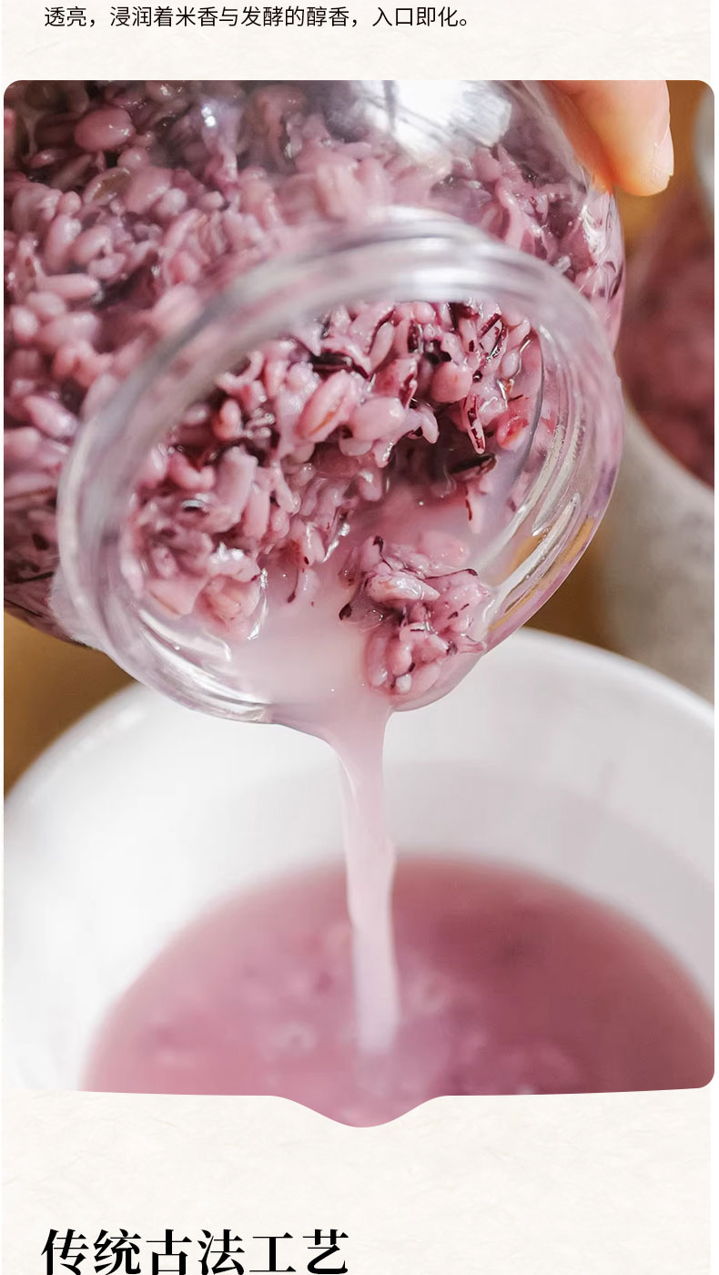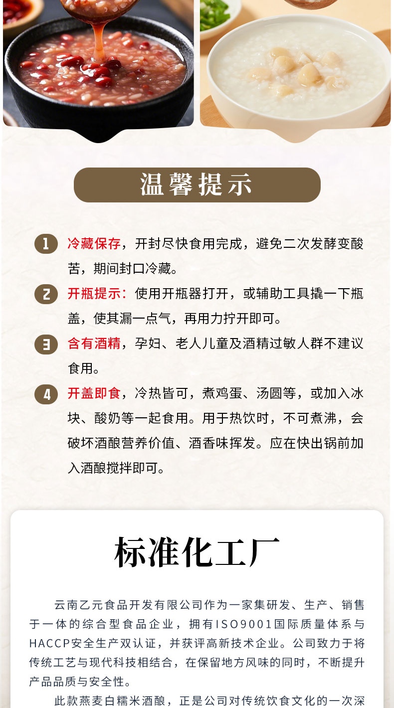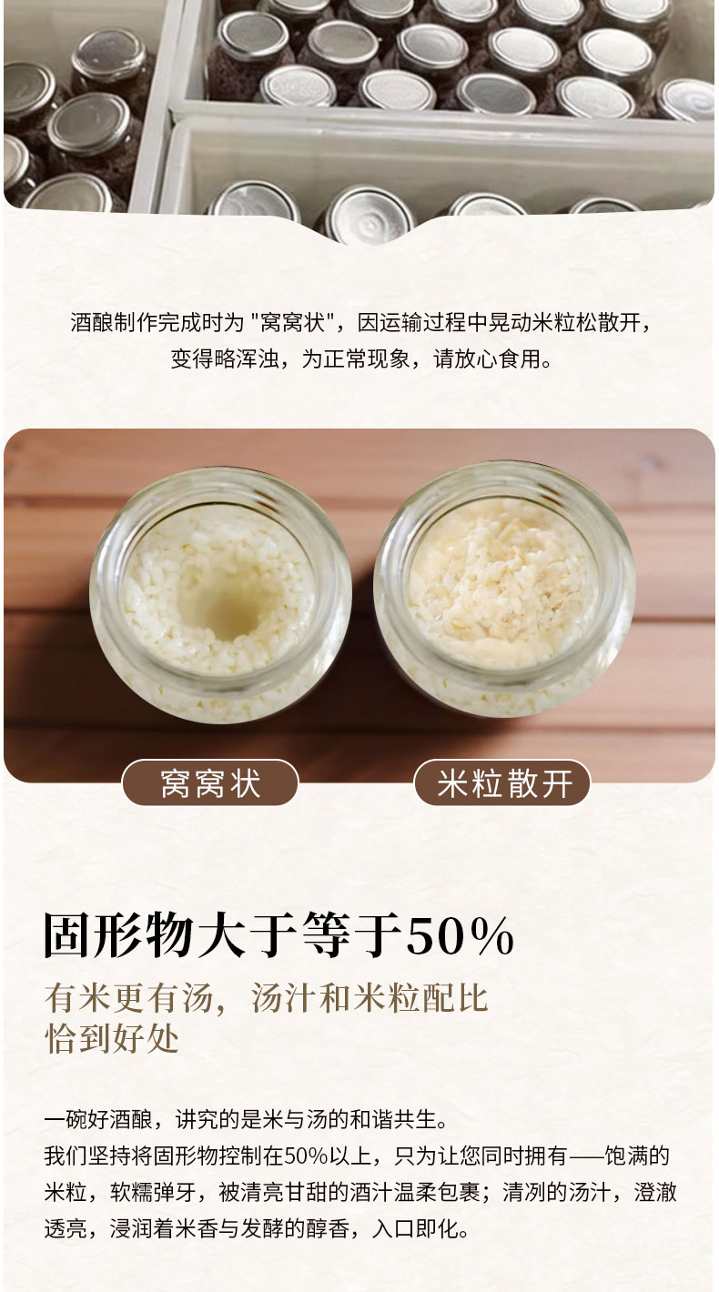 【温馨提示】 1、部分酒酿开盖后,会出现一些白色的小浮末,实为运输中晃动米芯和淀粉糖化酶析出漂浮再表面,非质量问题。 2、冷藏保存,开封尽快食用完成,避免二次发酵变酸苦,期间封口冷藏 3、开瓶提示:使用开瓶器打开,或辅助工具撬一下瓶盖,使其漏一点气,再用力拧开即可 4、开盖即食,冷热皆可,煮鸡蛋、汤圆等,或加入冰块、酸奶等一起食用。用于热饮时,不可煮沸,会破坏酒酿营养价值、酒香味挥发。应在快出锅前加入酒酿搅拌即可。 |