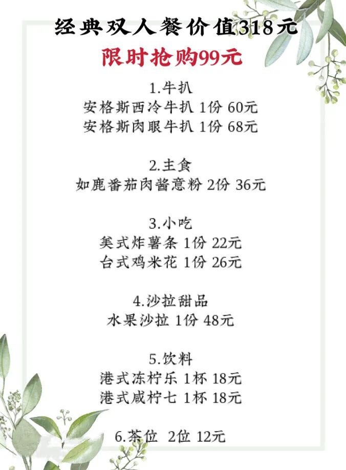 抢购截止日期8月10号【免预约·南浦地铁B口·如鹿牛扒屋】气氛爆表!精致约会bi选!仅99元抢价值318元双人餐=安格斯牛扒+意粉+小吃+沙拉+饮料等