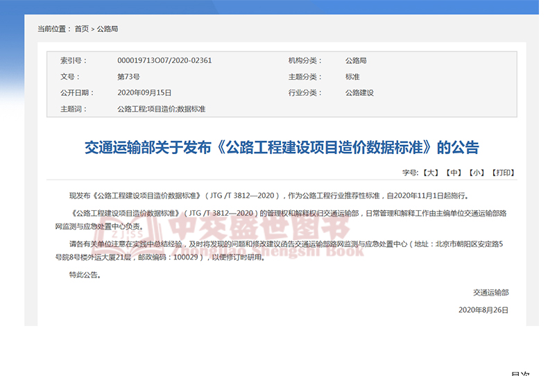 书名:公路工程建设项目造价数据标准JTG/T 3812—2020