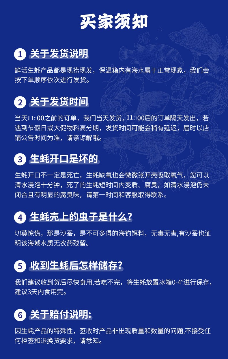 ③生蚝签收后,若有泥壳/肥瘦很瘦的/变质/重量缺失/开口超过一厘米/大小规格不符/生蚝表面有明显泥沙的,售后按只数比例赔偿,需提供相应凭证(运单图片与生蚝图片)。