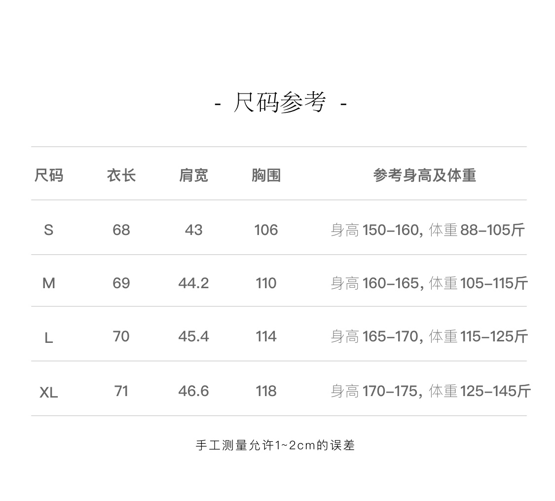 衣长68 69 70 71 胸围106 110 114 118 肩宽43 44.2 45.4 46.6 体重S码88-105 身高155-160 体重M码105-115 身高160-165 体重L码115-125 身高165-170 体重XL码125-145 身高170-175