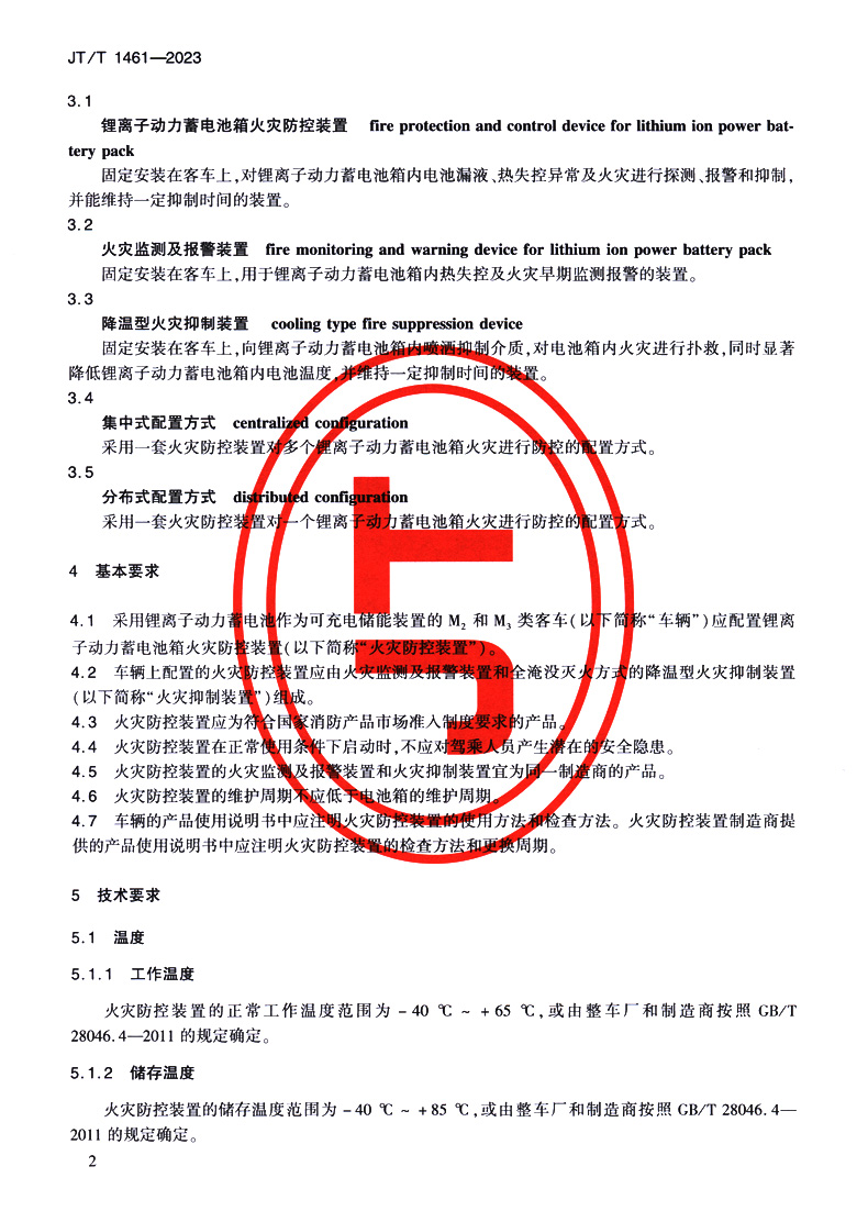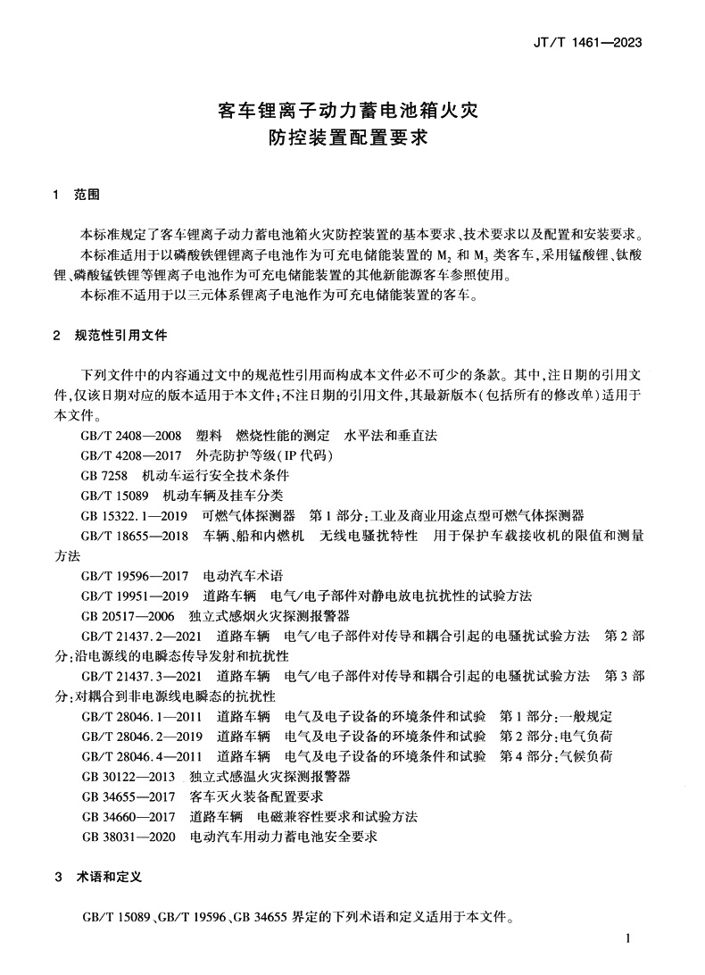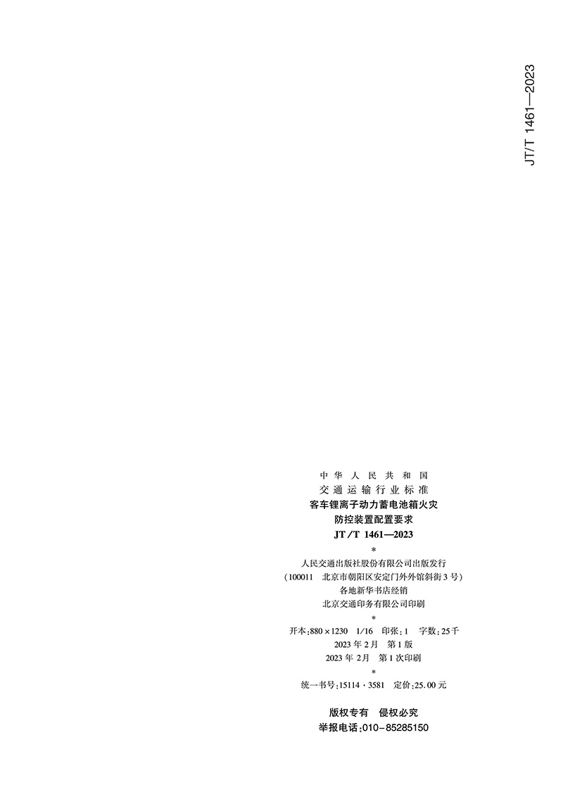 书名:客车锂离子动力蓄电池箱火灾防控装置 配置要求(JT/T 1461-2023)