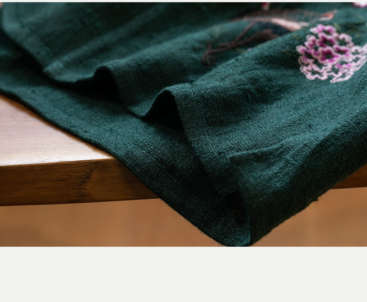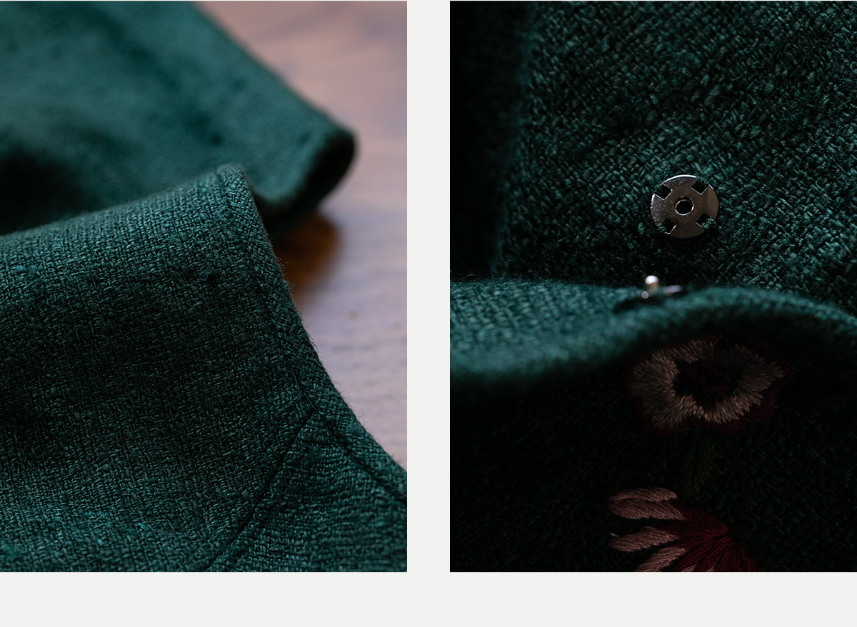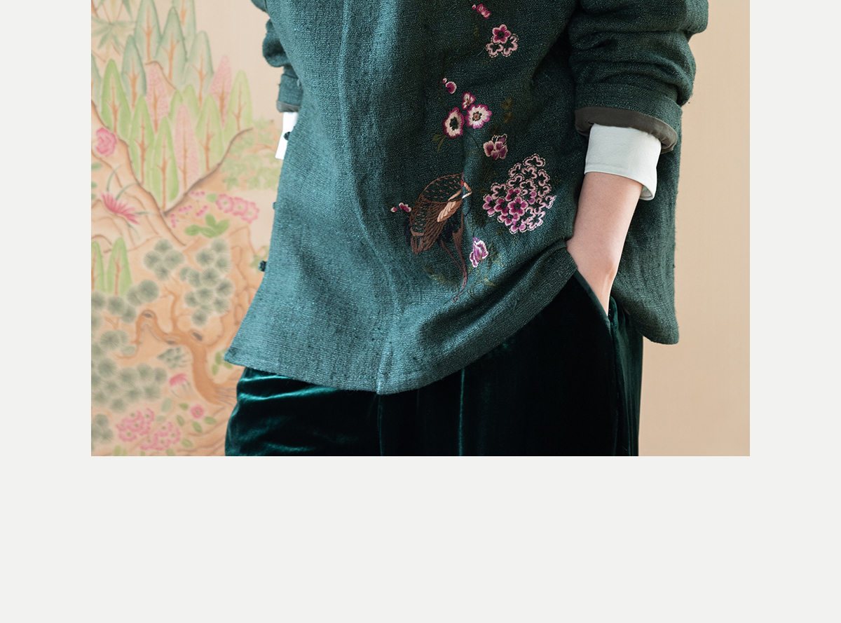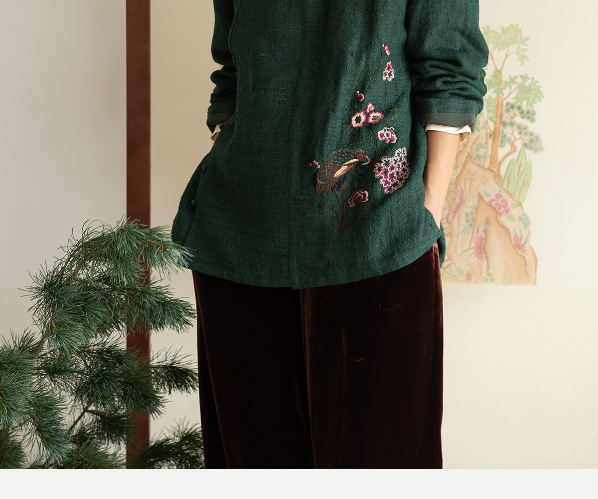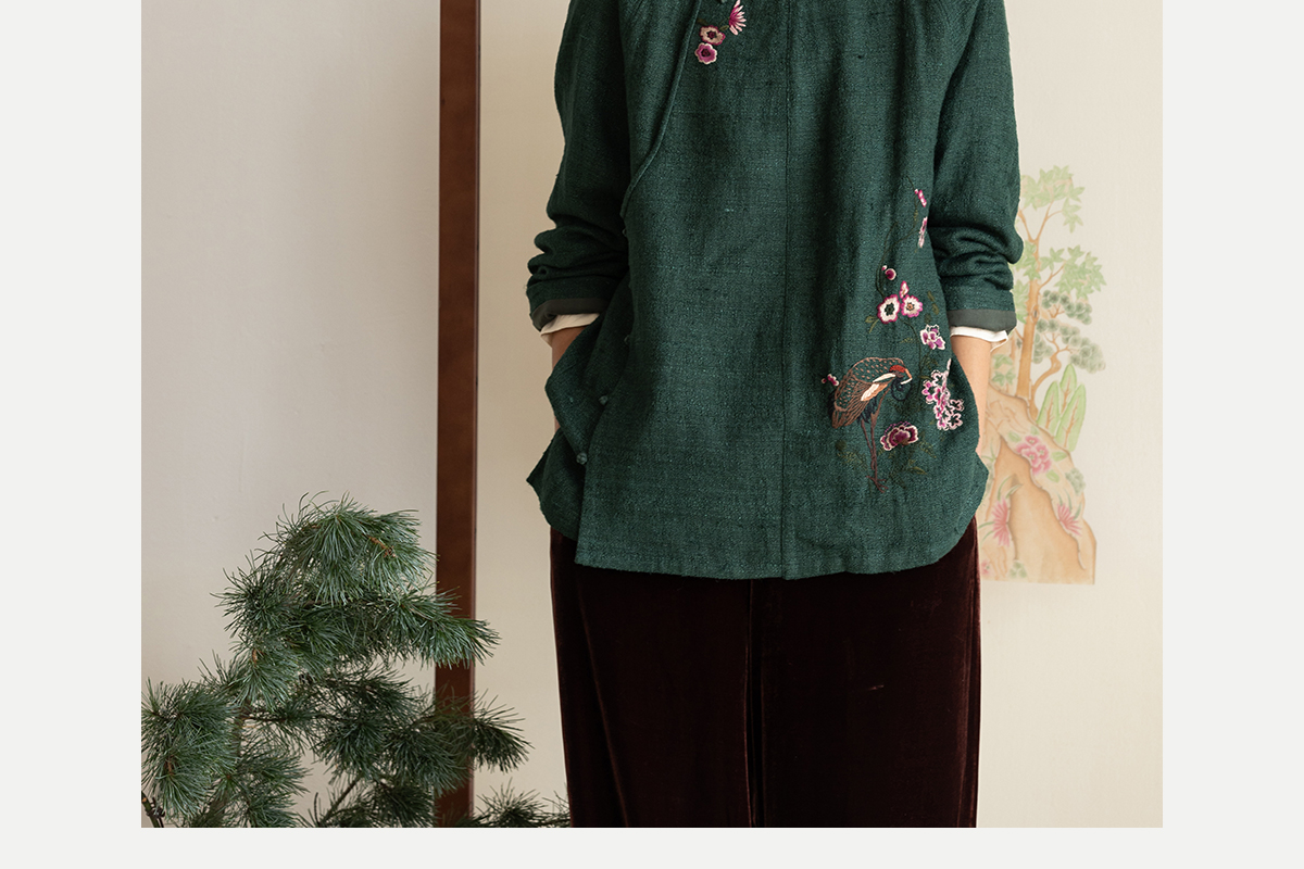 牧衣游原创 柞蚕丝混亚麻手工刺绣短外套绿色文艺复古禅意 离毓