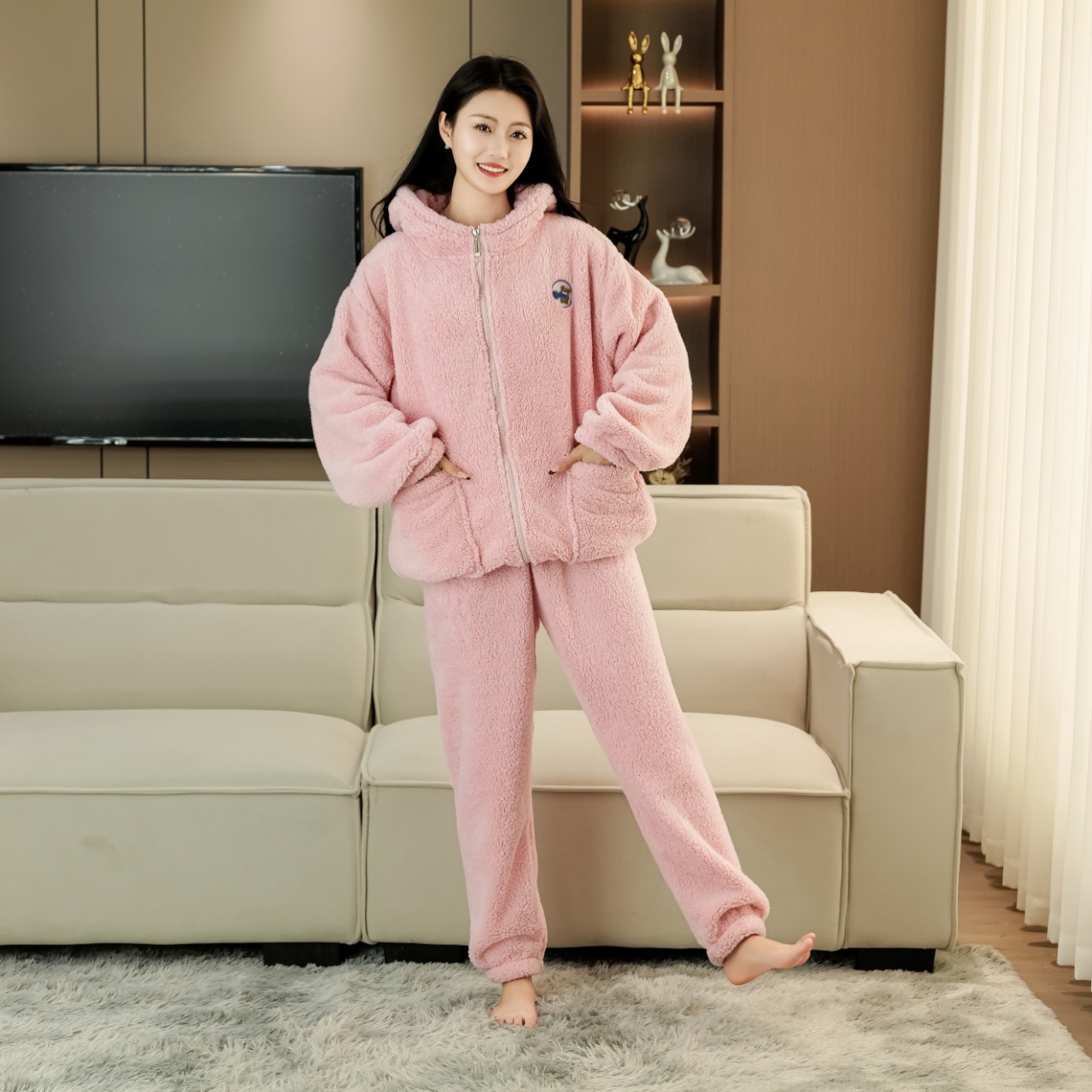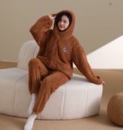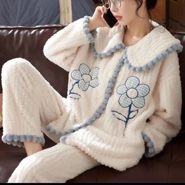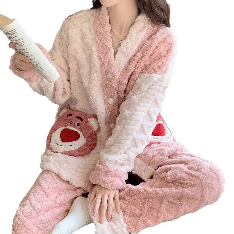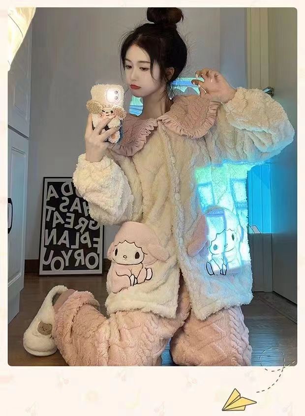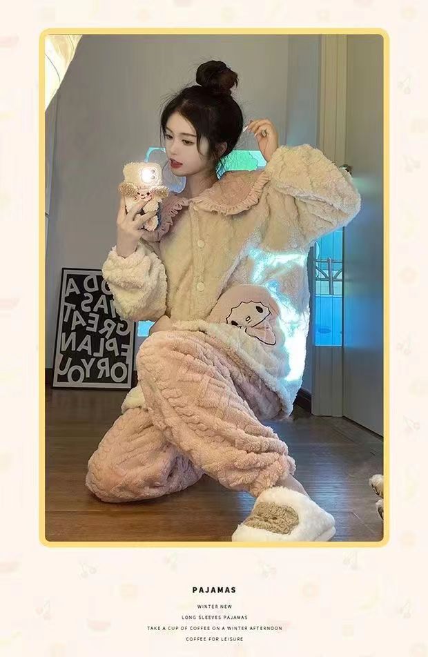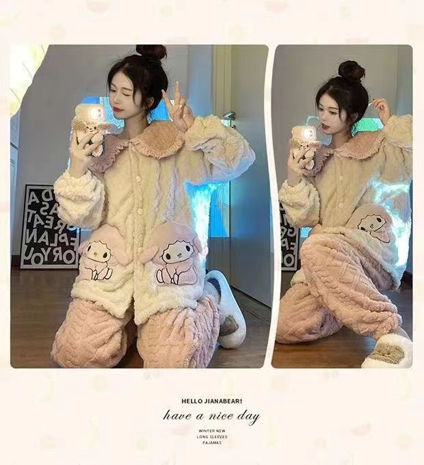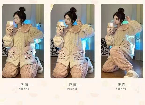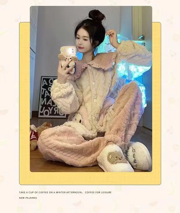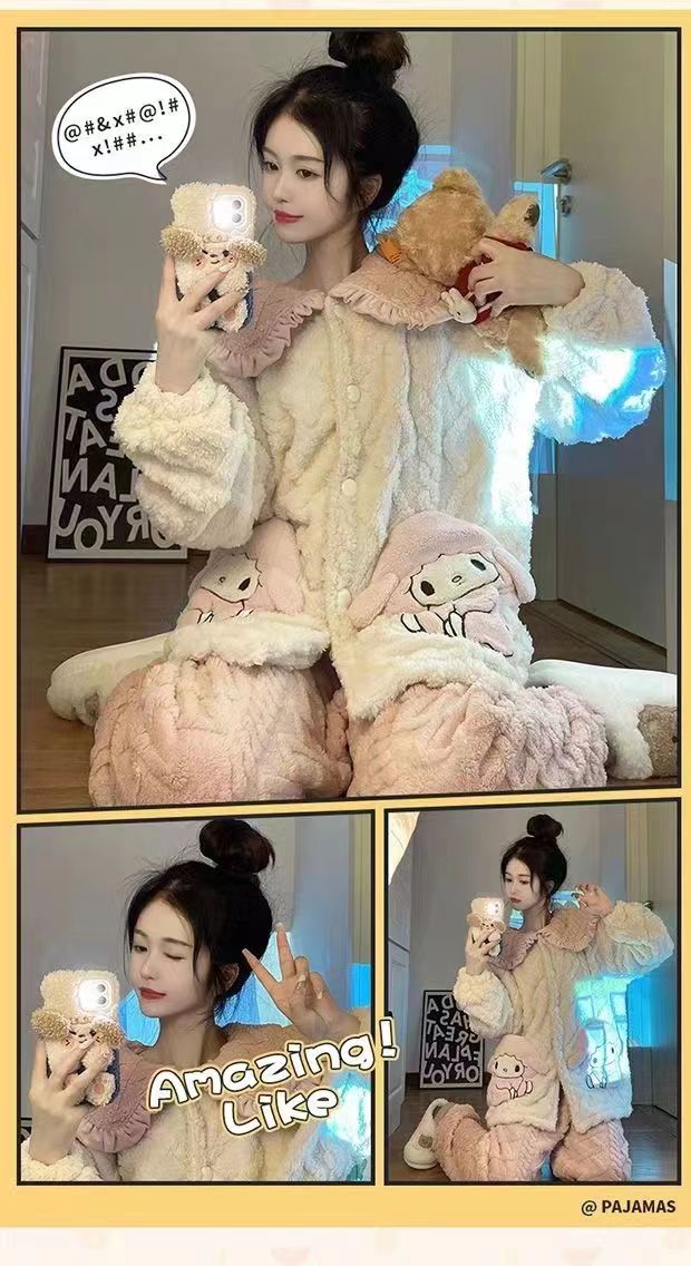 睡衣女秋冬长袖加厚加绒珊瑚绒女士睡袍套装法兰绒家居服可爱风