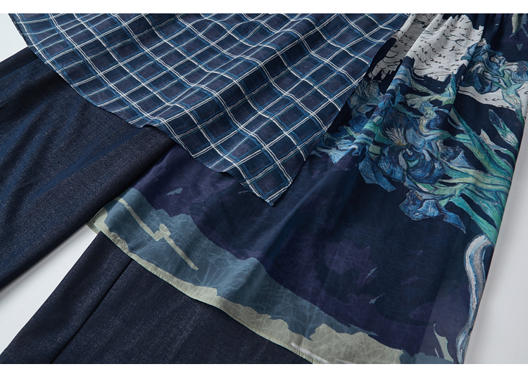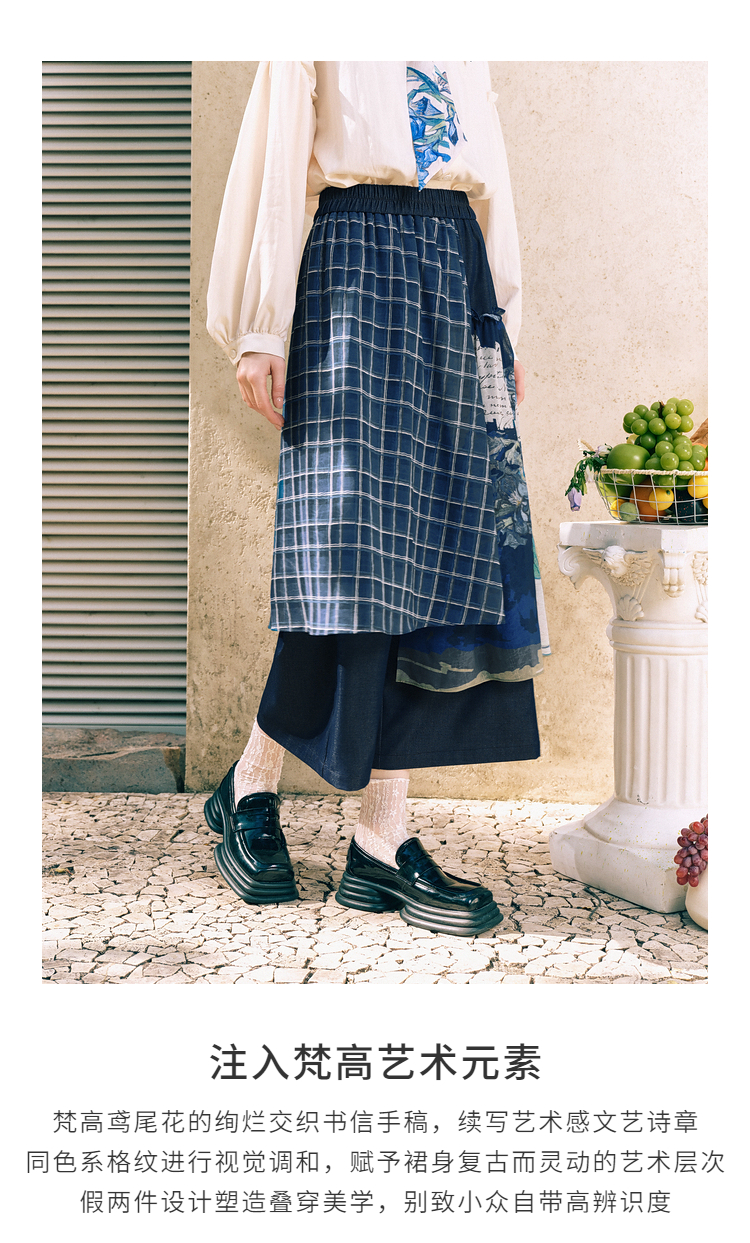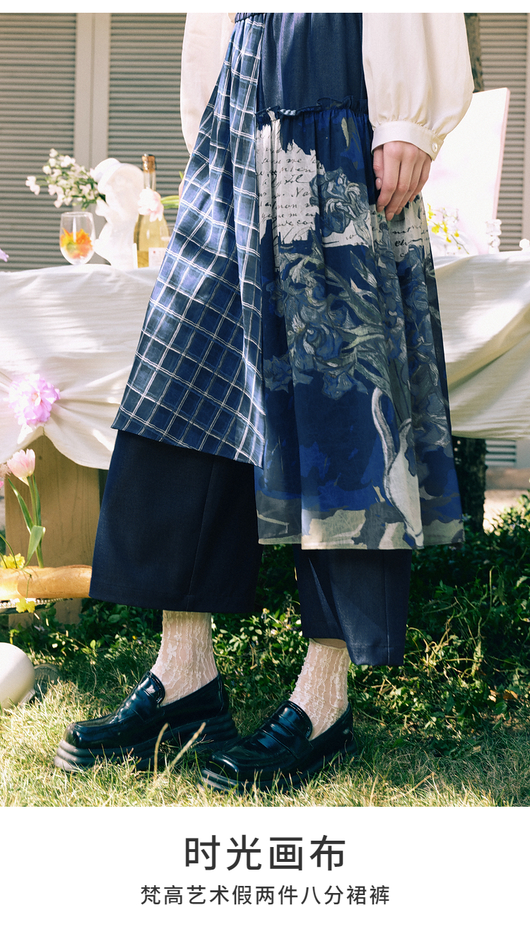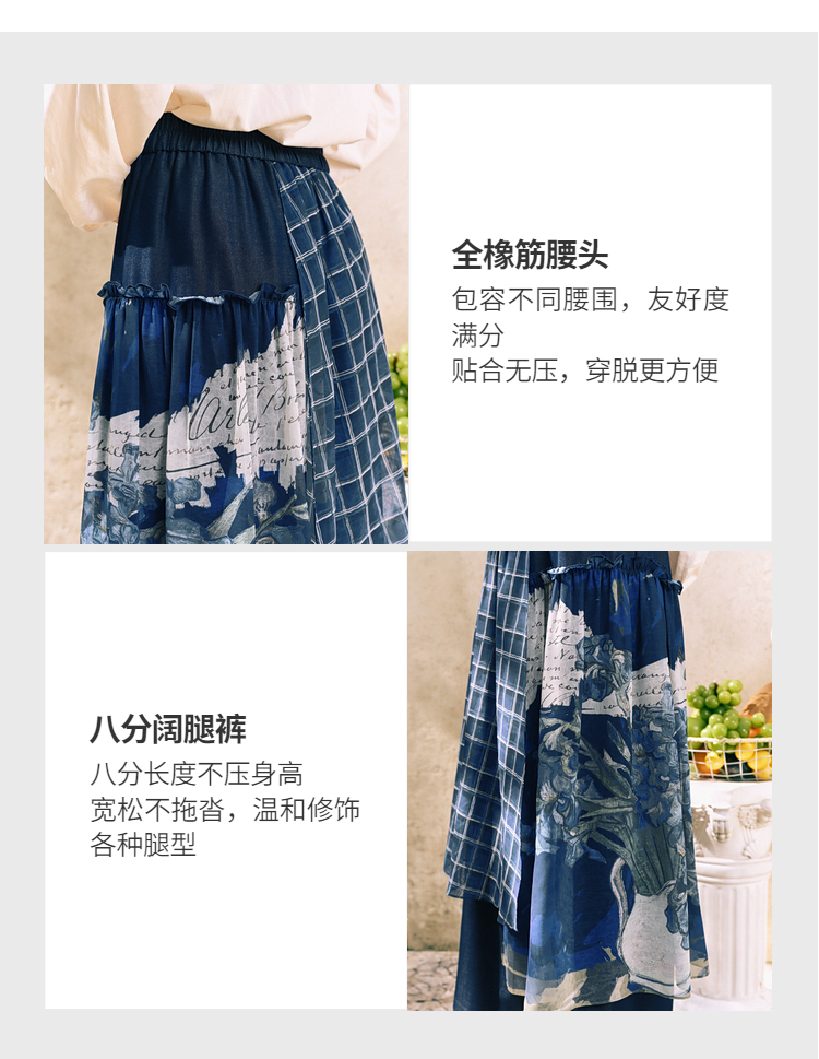 两三事梵高文艺时光画布2026春新款复古印花布拼接阔腿裤女休闲裤