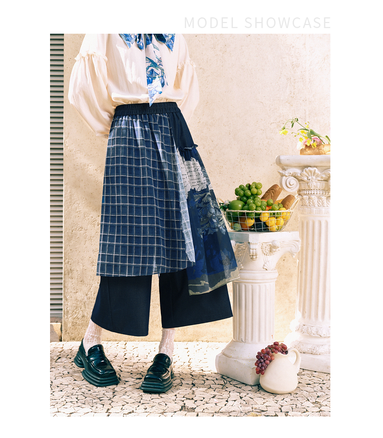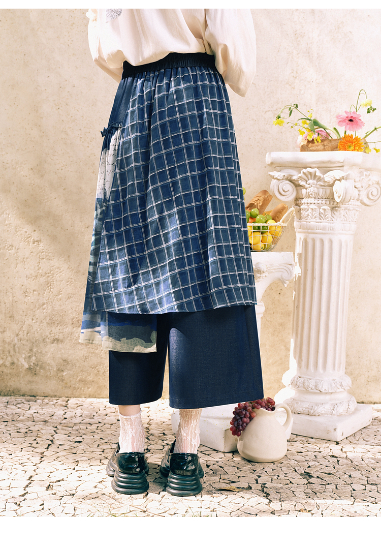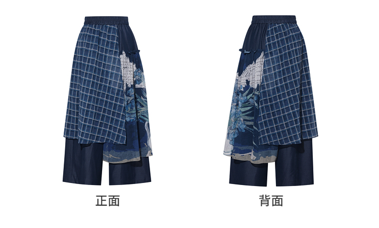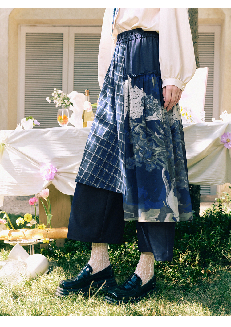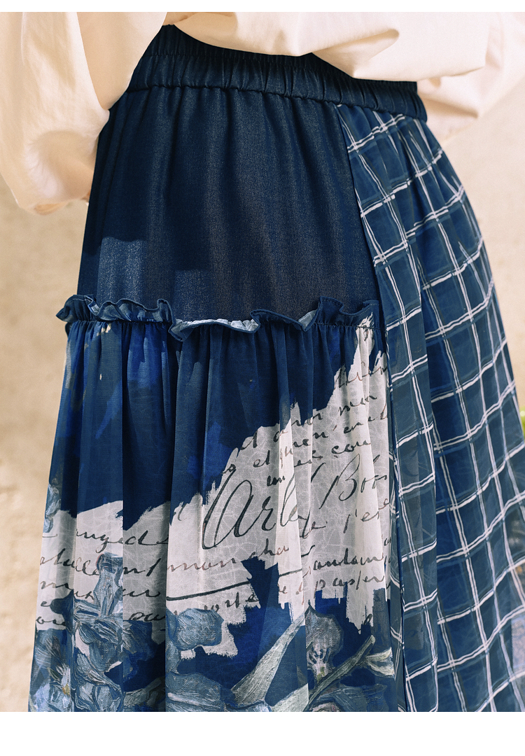 两三事梵高文艺时光画布2026春新款复古印花布拼接阔腿裤女休闲裤