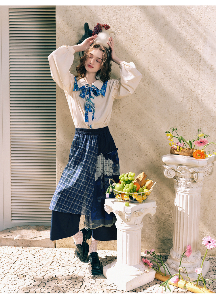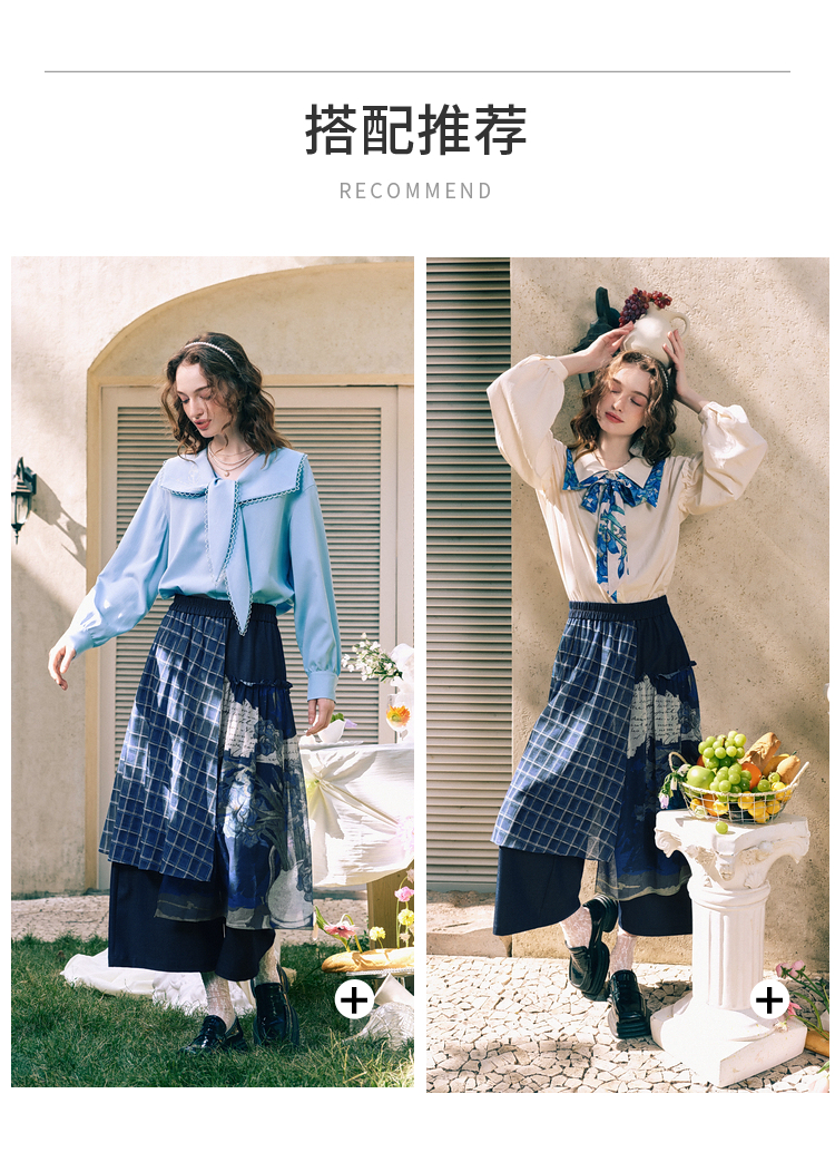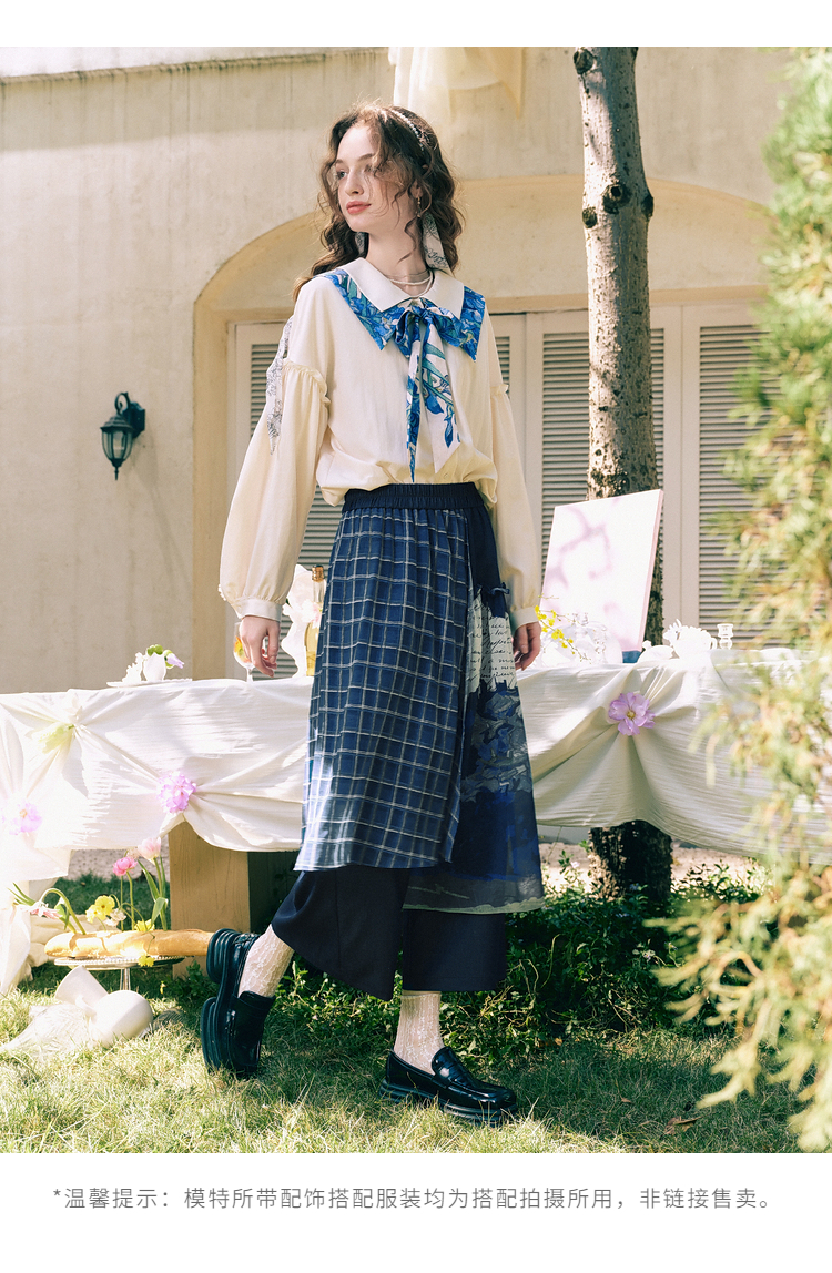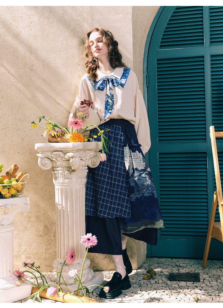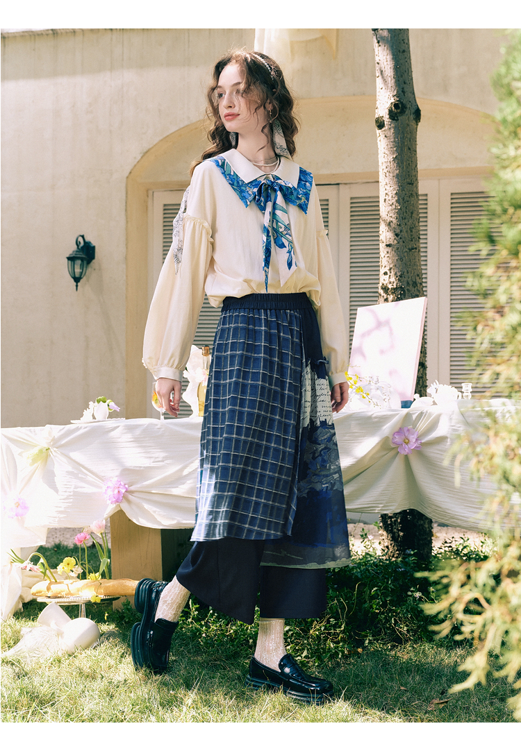 两三事心向莫奈 夏季新款文艺风油画印花口袋长袖衬衫女宽松
