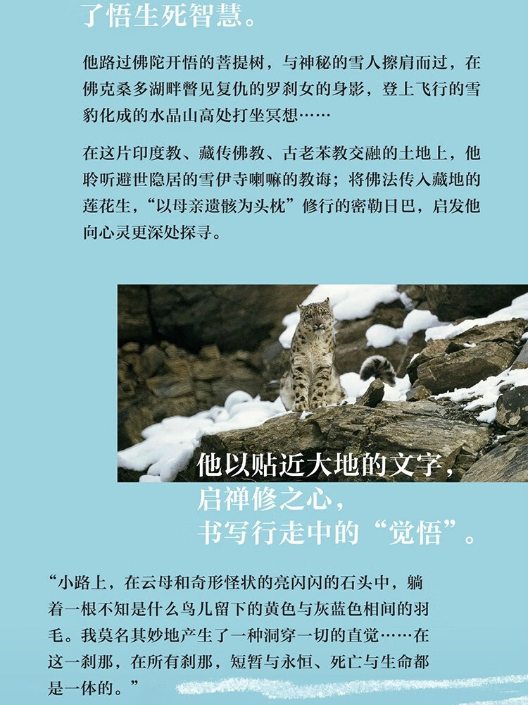 这趟旅程起初是为了寻访稀有的雪豹,探访佛教圣地,后来变成一场追寻存在意义的旅程。书中令人愉悦地将登山和神秘主义融合在一起。