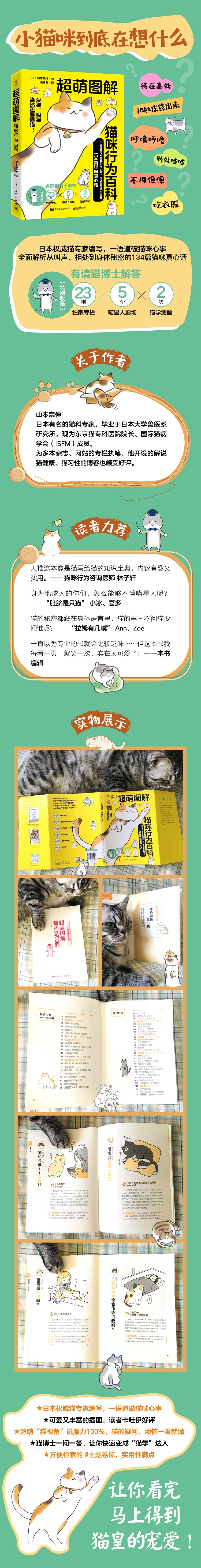 爱猫、吸猫,当然还要懂猫。猫主子到底在想什么?它眼中的世界到底是什么样子的?本书由日本*威的猫咪专家、东京猫专科医院院长山本宗伸执笔,用134篇精简、幽默、平易近人的短文字,全方位破解猫咪的语言、沟通、肢体动作和行为。每一页文字还配有会萌化你的猫咪插画,让你秒懂内容。眼神交会后缓缓闭上双眼,代表满满的爱意;不埋便便、待在高处,都是威严的象征;尾巴炸毛、用力拍打或快速摇晃都可能是不悦的表现……从现-在起,做一个更懂猫咪的猫家长吧~