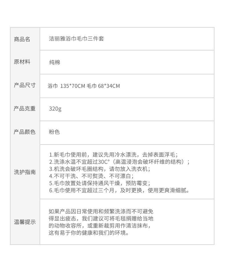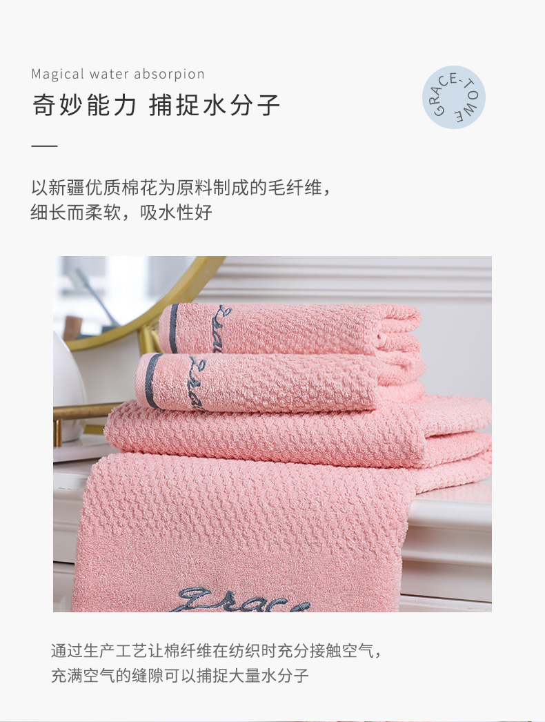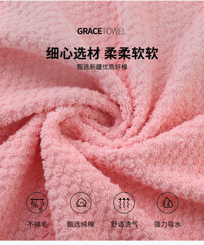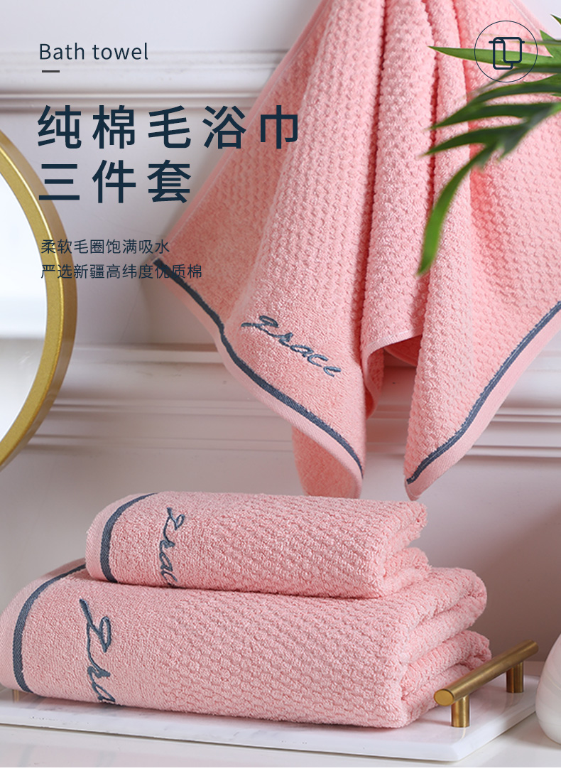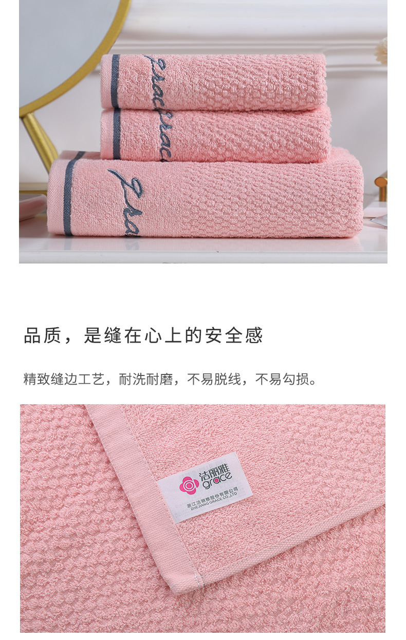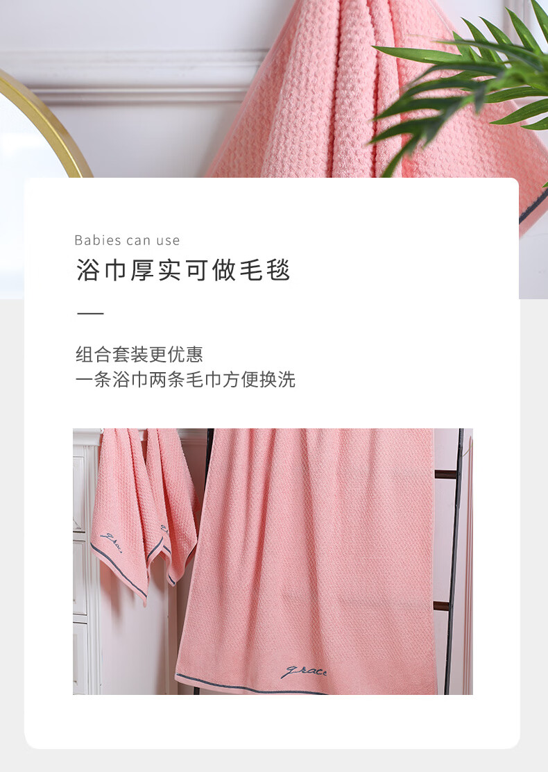 洁丽雅(Grace)浴巾家用纯棉 柔软吸水全棉大号毛巾浴巾 1*浴巾+2*毛巾组合装 (粉色)