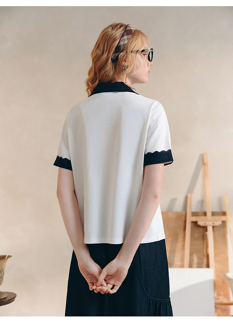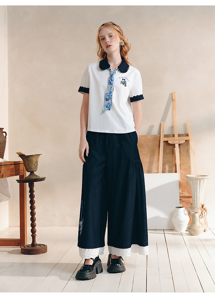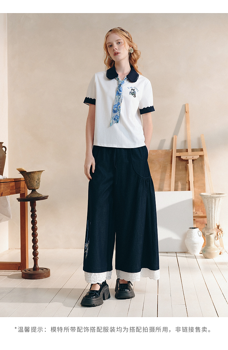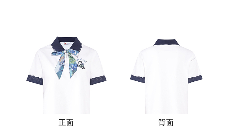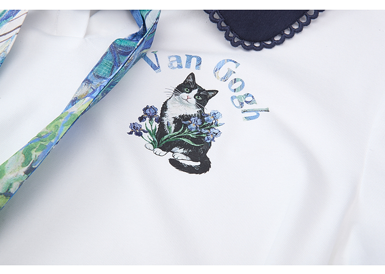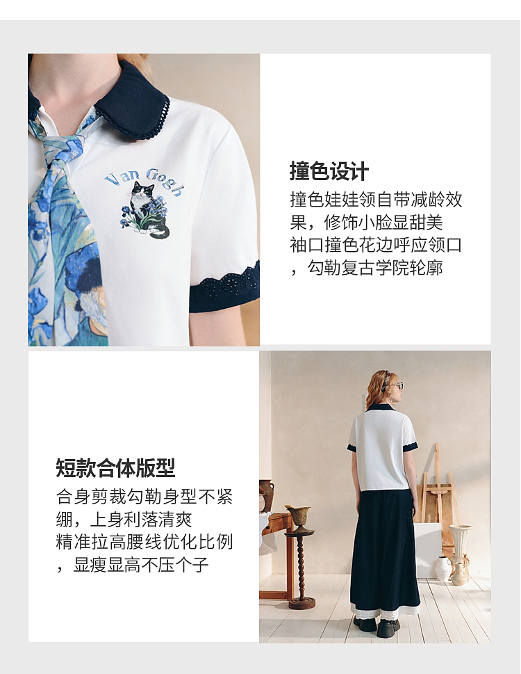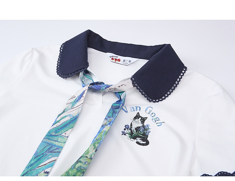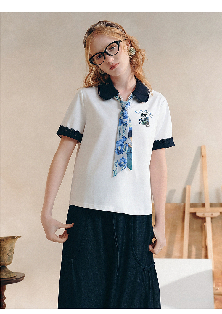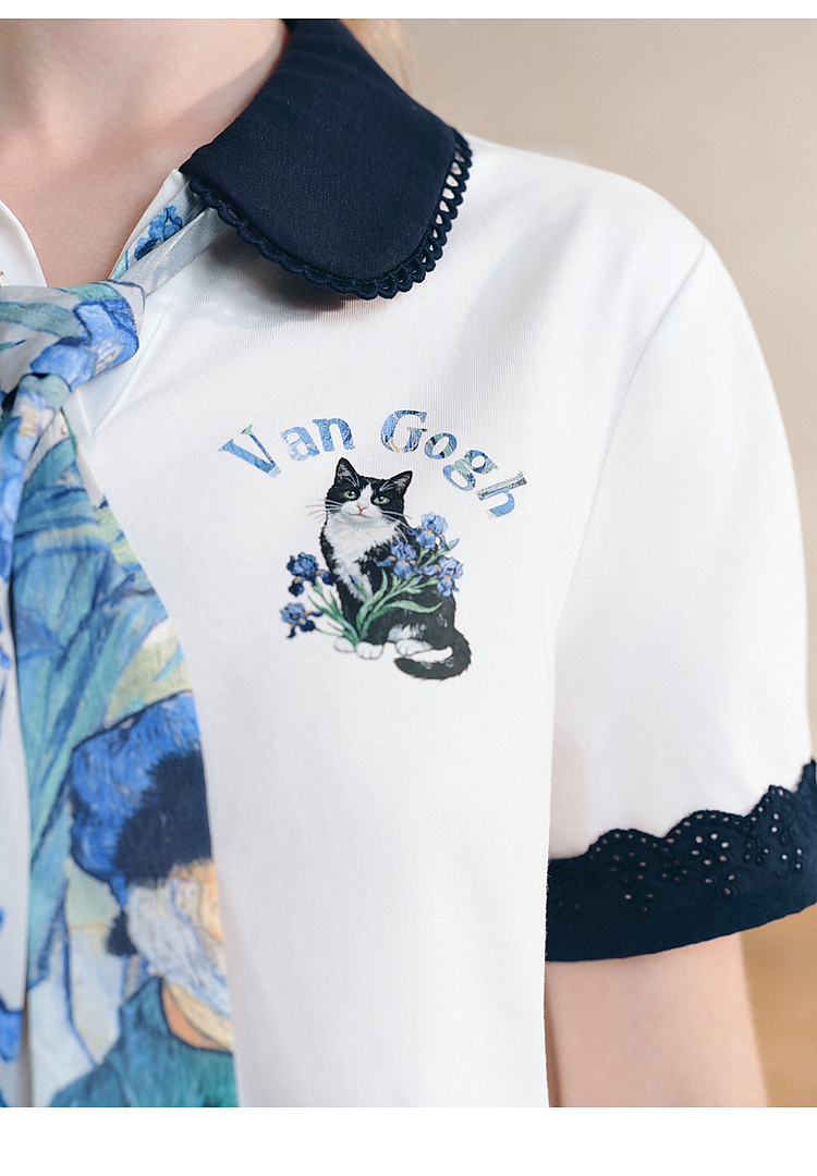 两三事梵高文艺星空市集2026春新款撞色娃娃领可拆领带印花t恤女