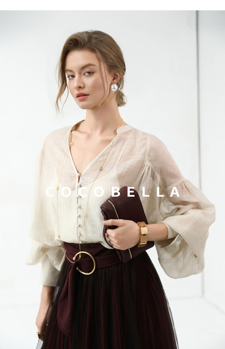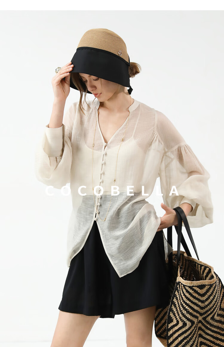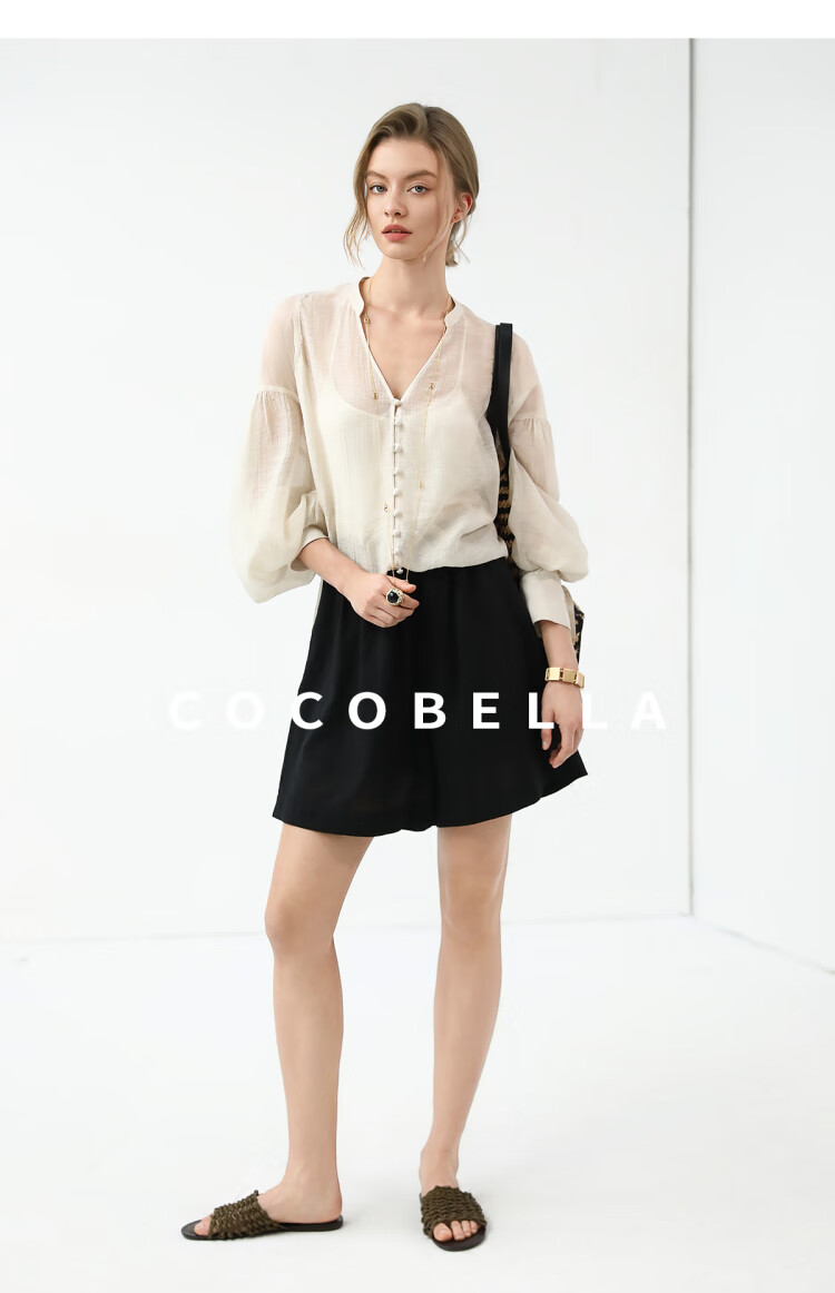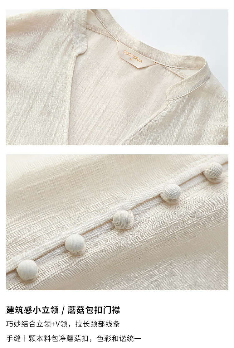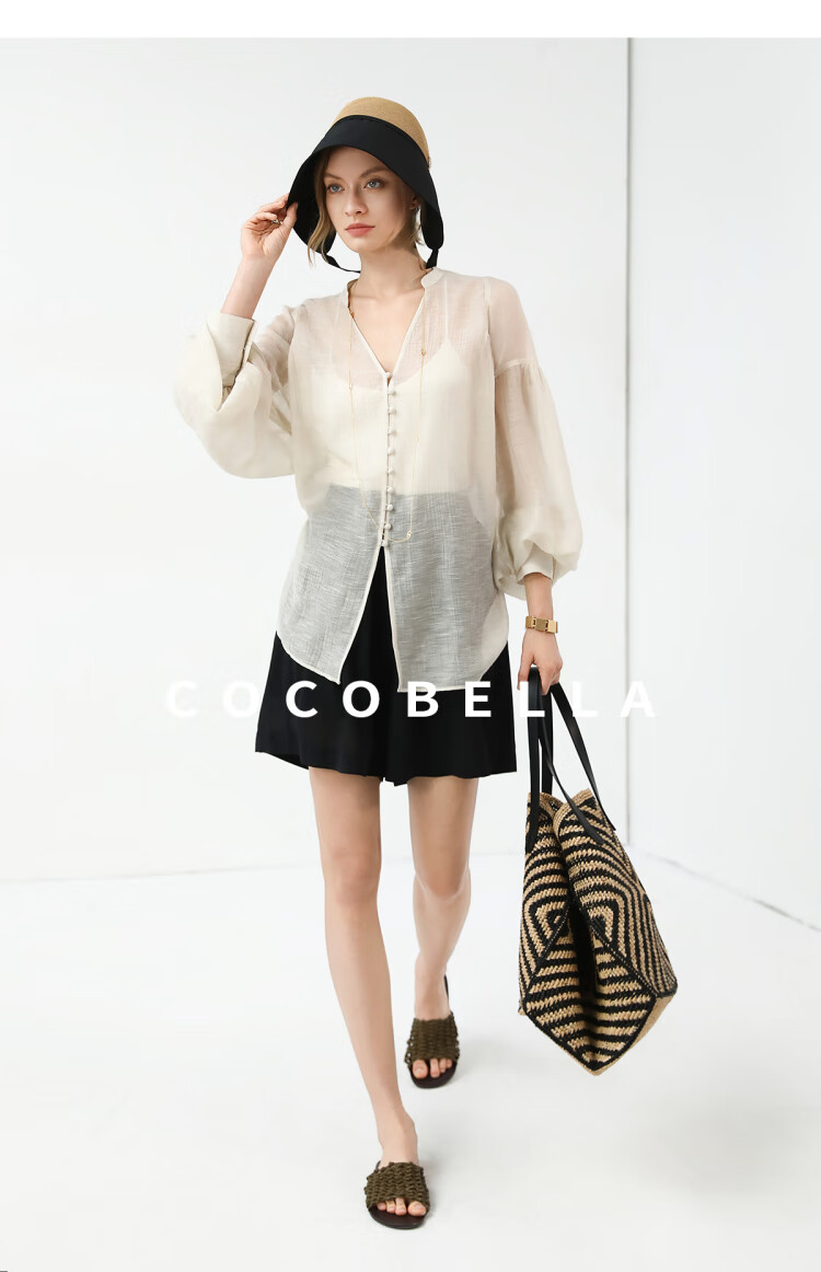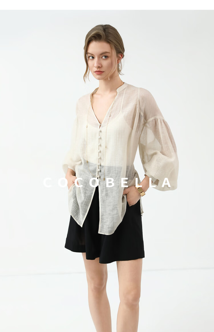 COCOBELLA新中式手工盘扣肌理感V领衬衫立领微透视开衫SR3081