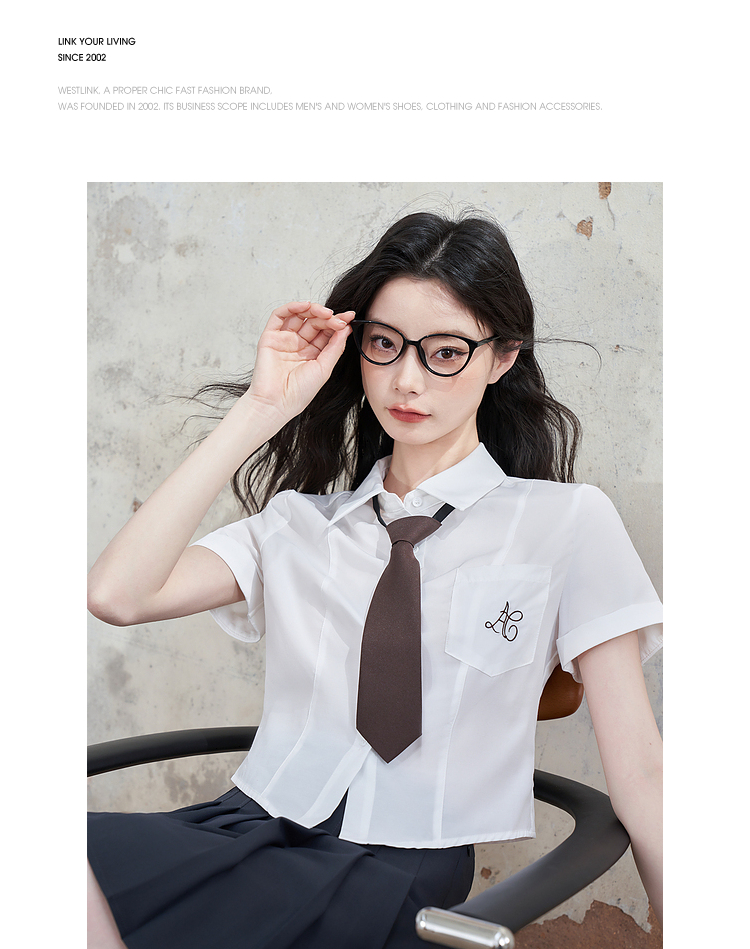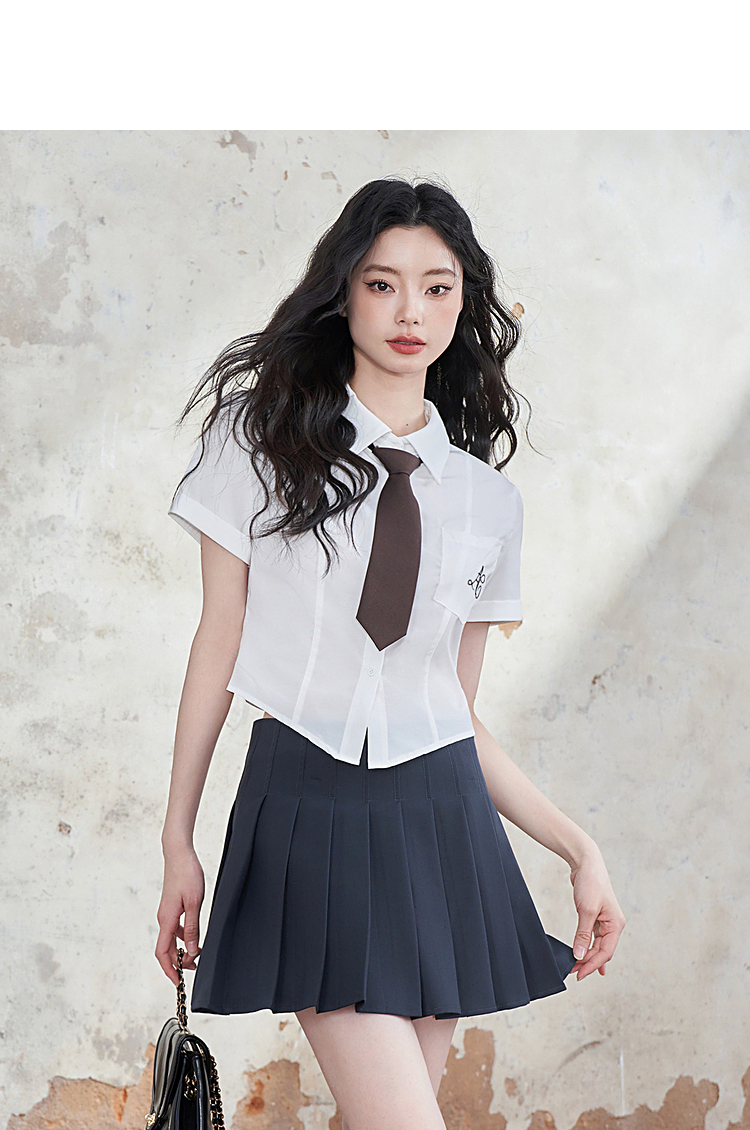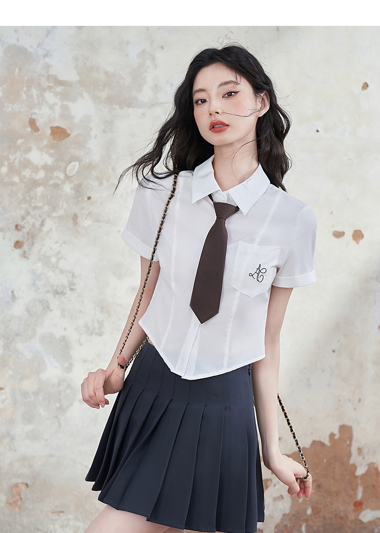 西遇简约学院风短袖衬衣女早春新款文艺通勤设计感纯色上衣白D0740562