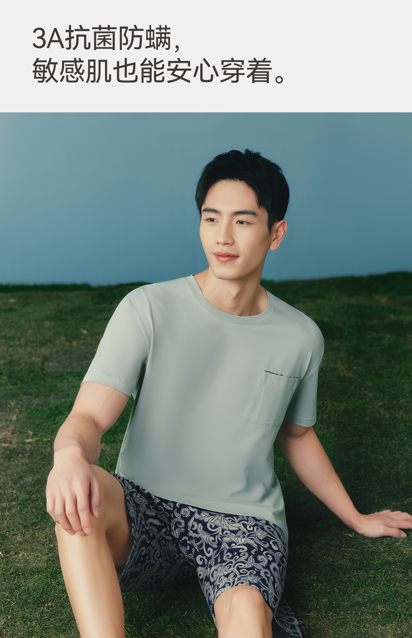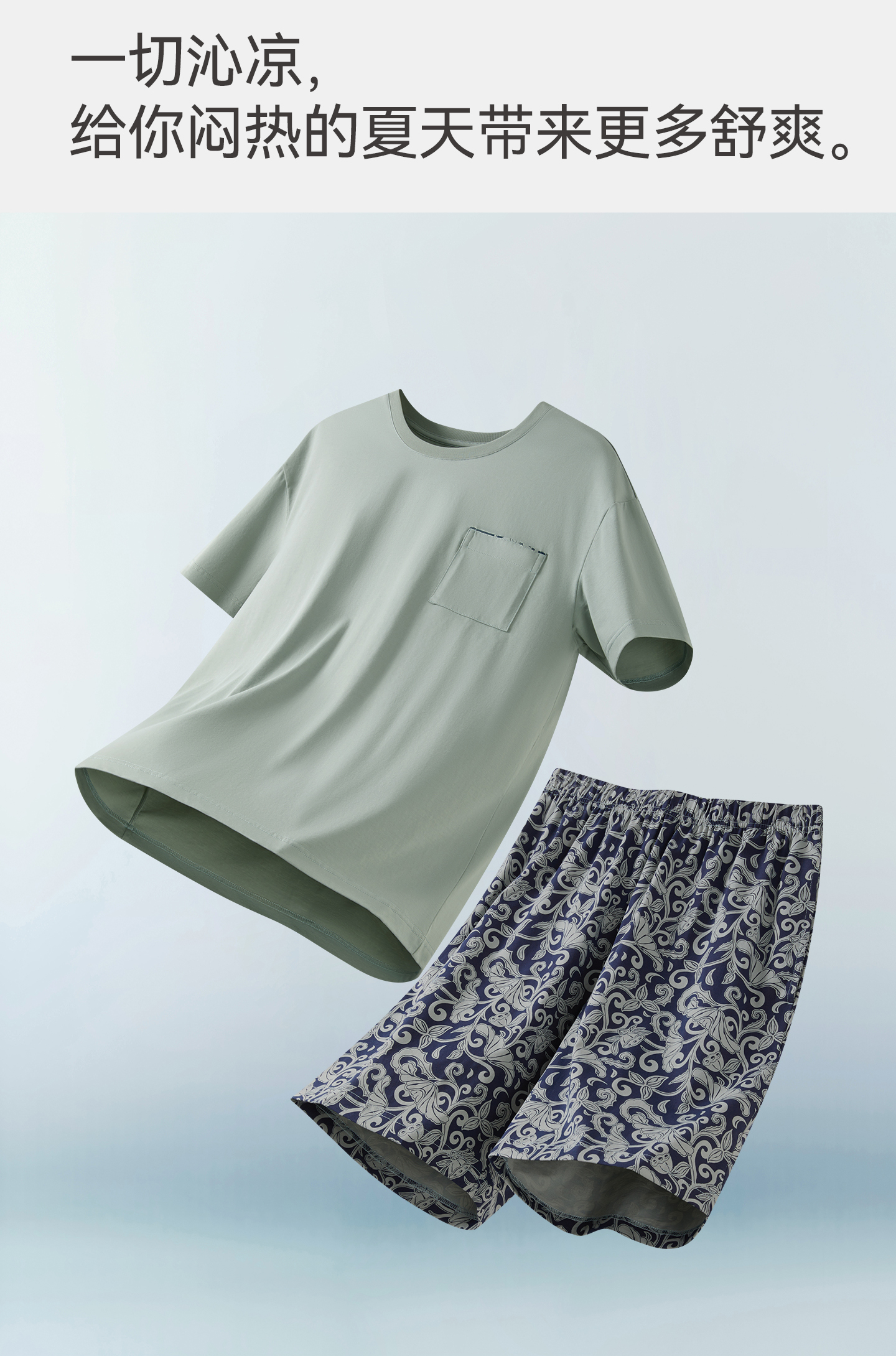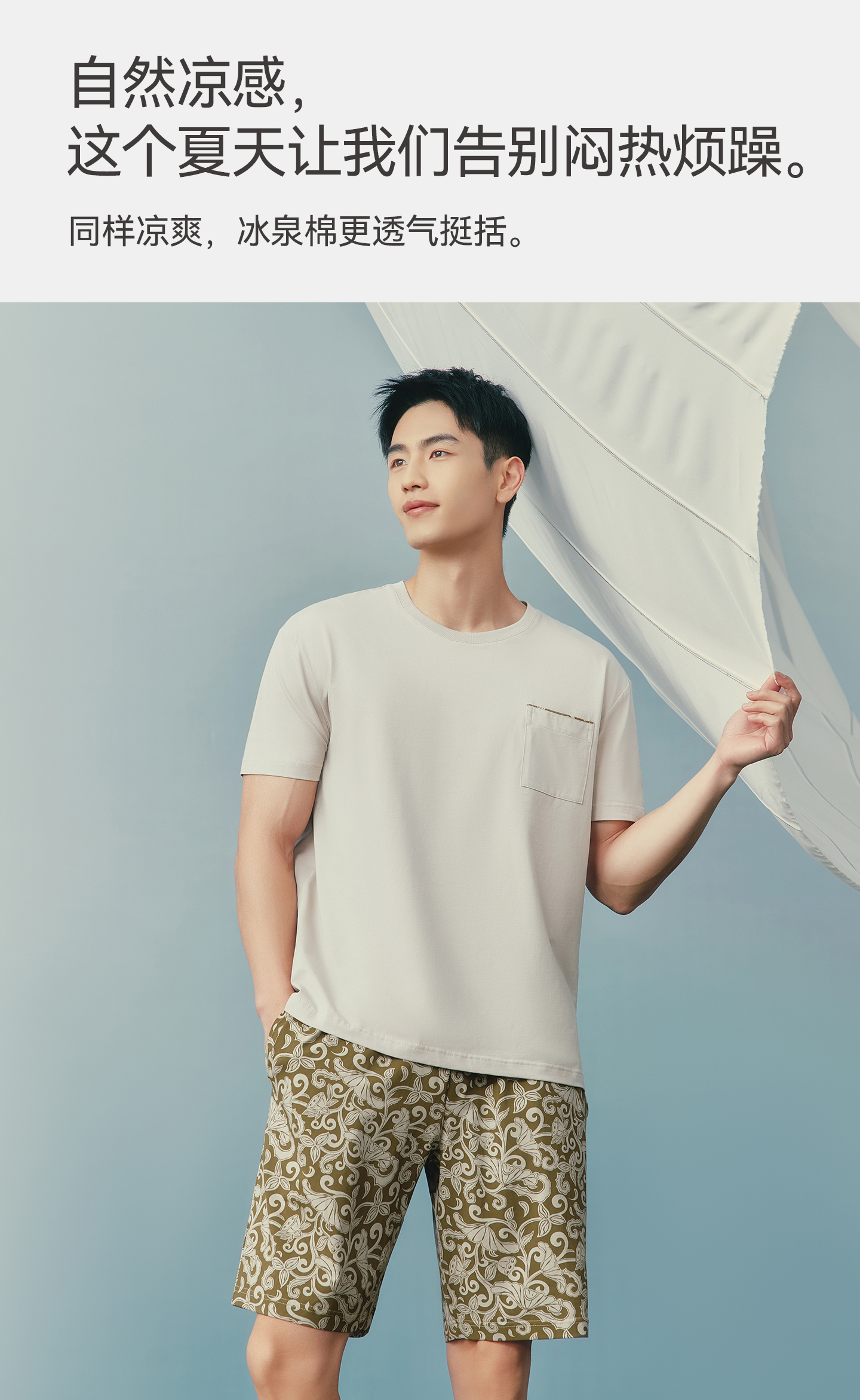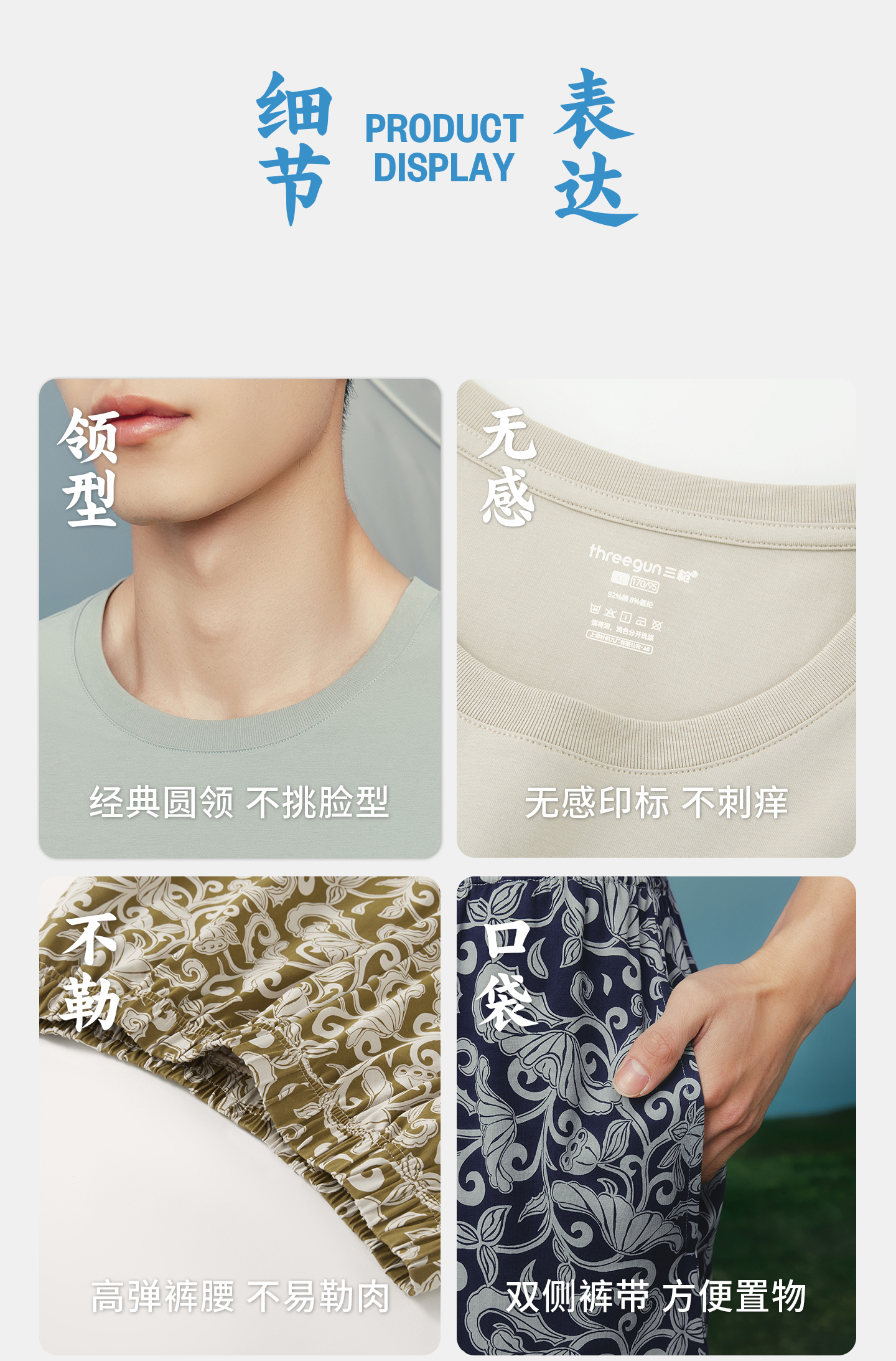 Threegun三枪 冰泉棉圆领短袖短裤男家居套-T80144D02