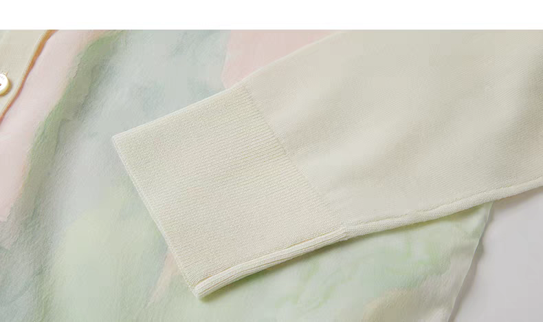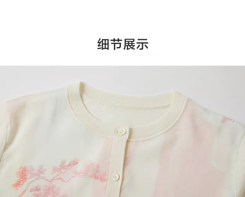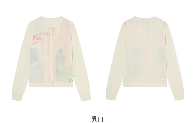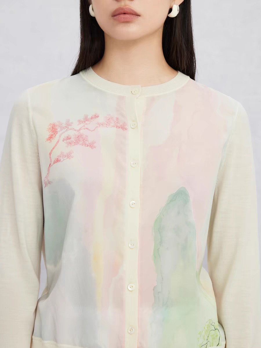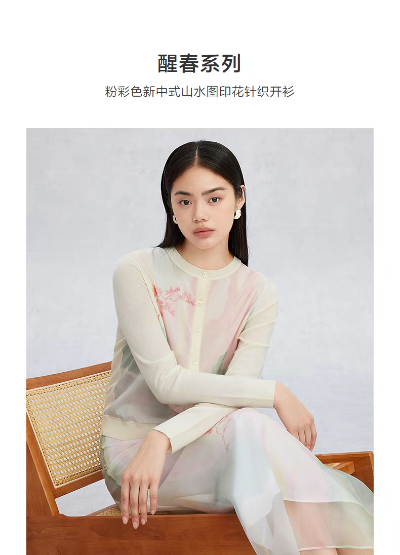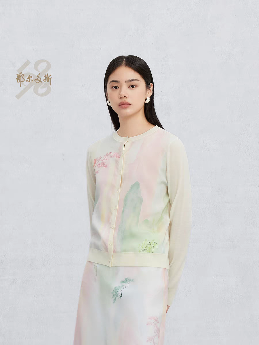 鄂尔多斯1980新品精纺羊毛圆领新中式山水画印花女针织开衫25春夏