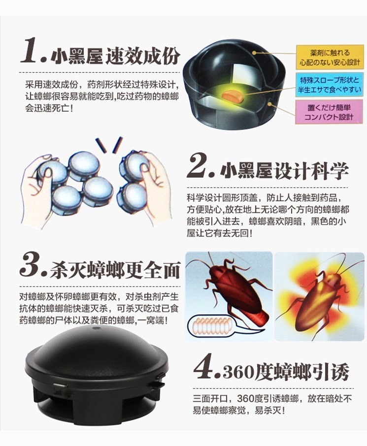 消灭蟑螂起效快,活体蟑螂的卵也能一并杀死,对具有抗药性的蟑螂也毫不留情。