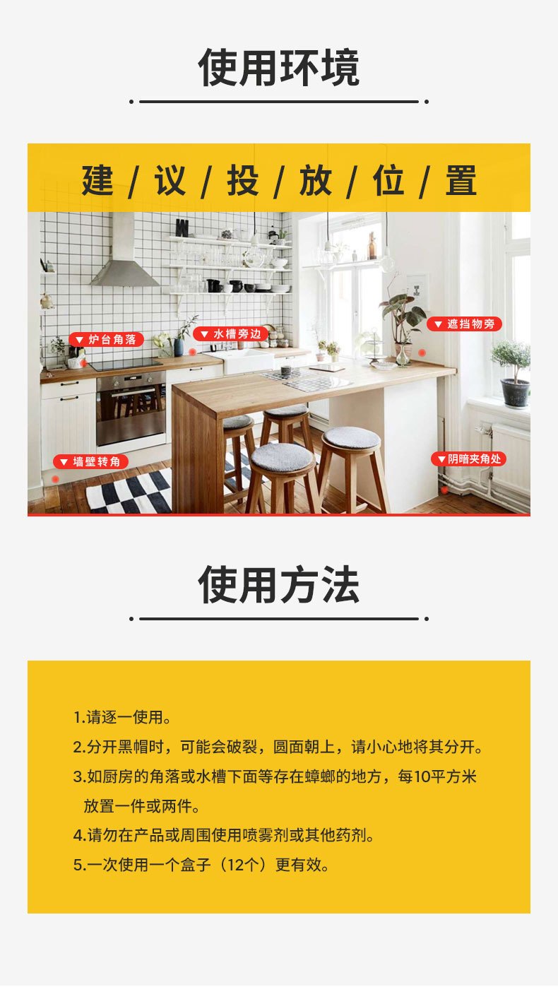 使用非常简单,直接摆放在蟑螂触摸的地方即可(小黑帽的帽子不用打开!切记!)。蟑螂巢穴一般藏于操作间、洗衣房、暖气盒里面,电视机、电脑、电冰箱背后以及厨房和下水管道处。