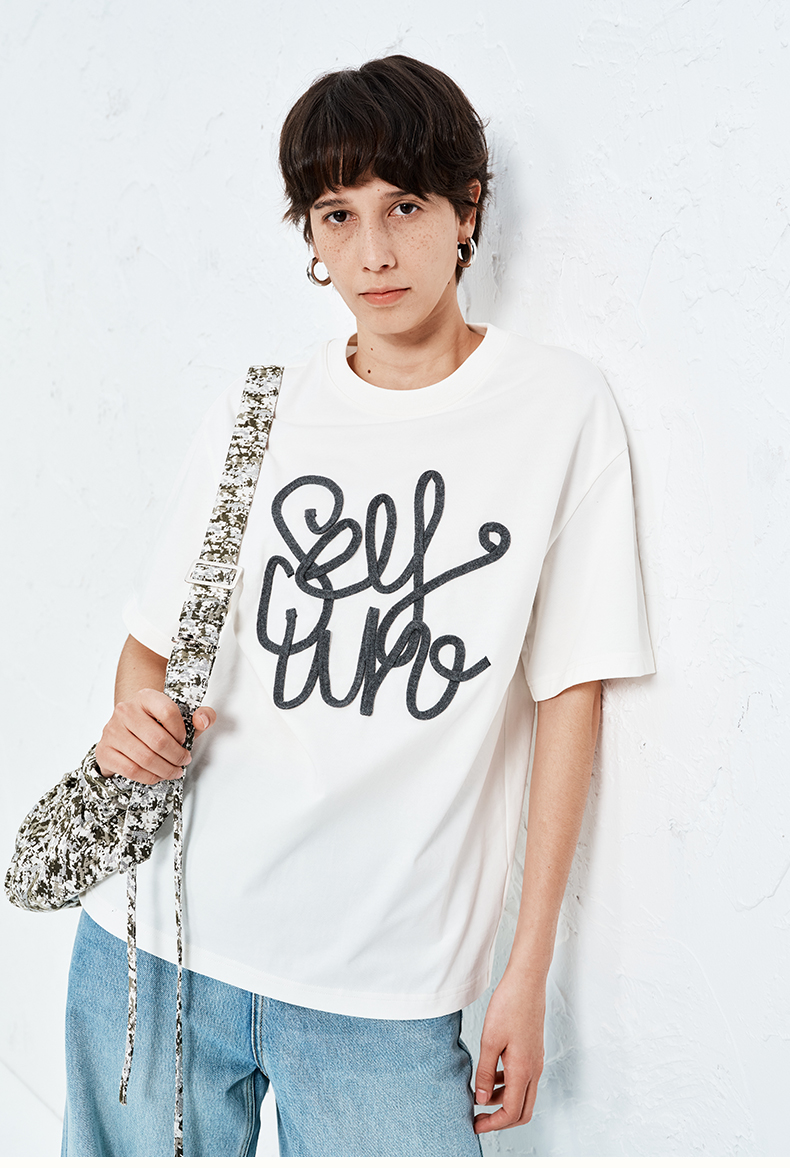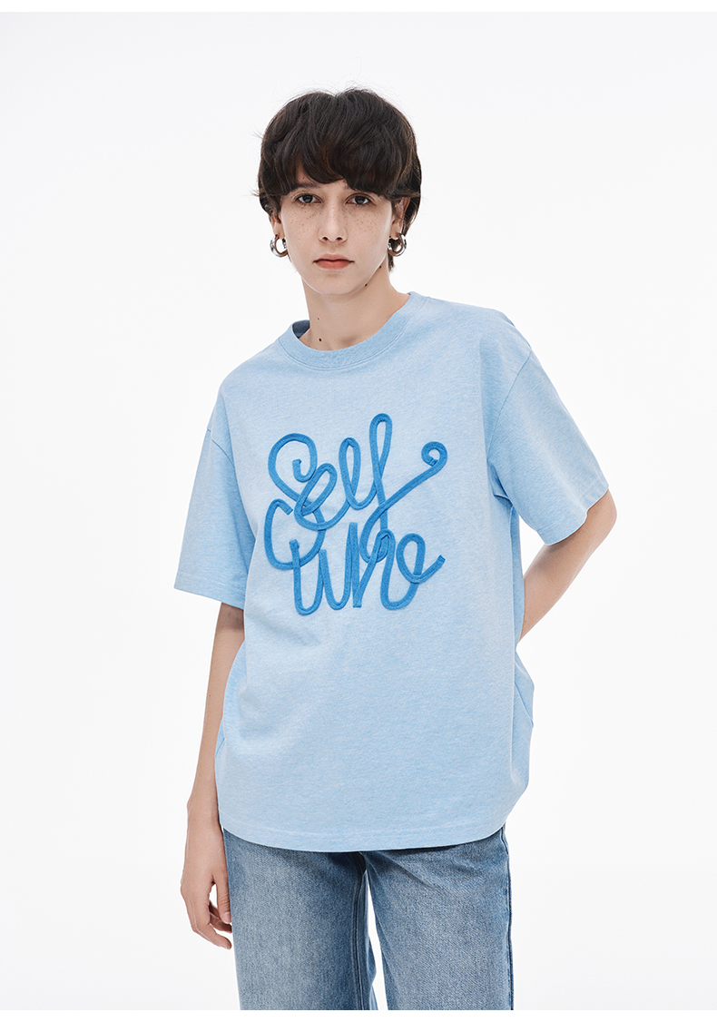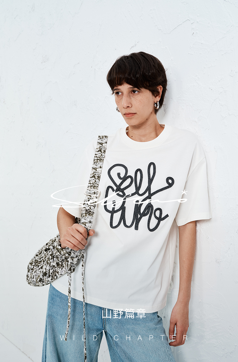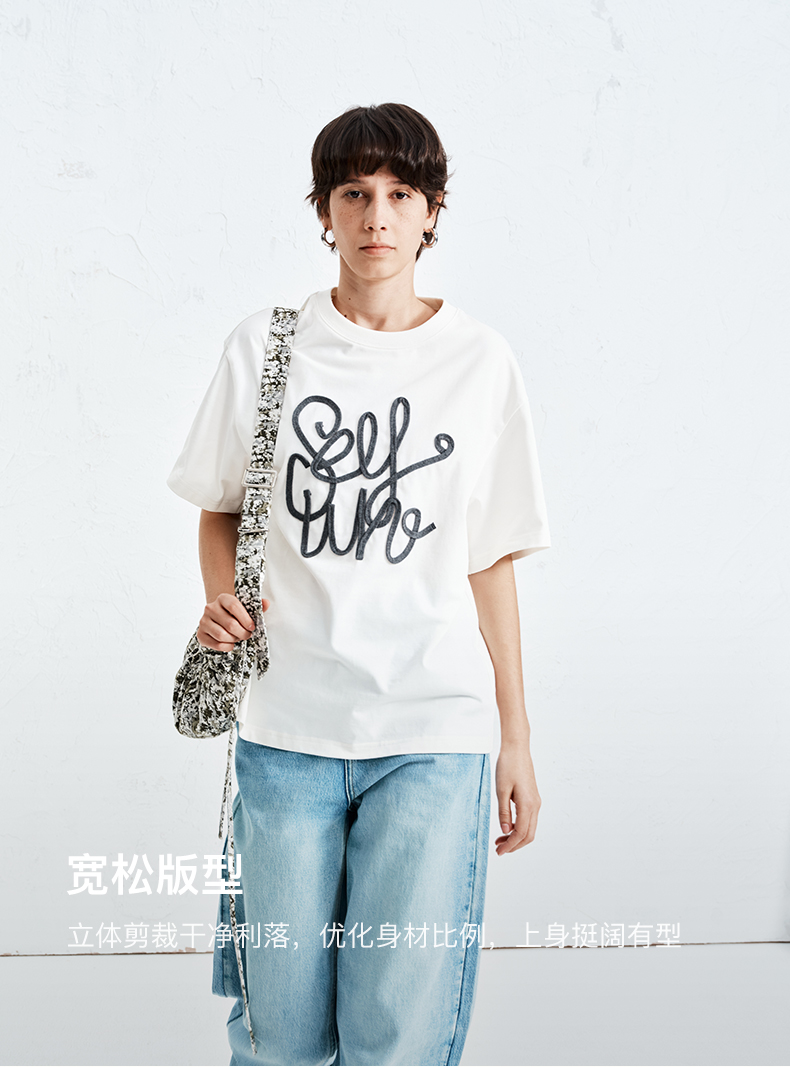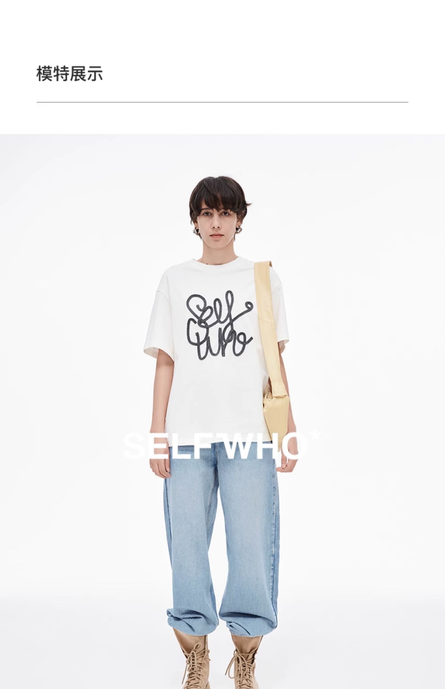 [黄圣依同款]SELFWHO全棉纯色短袖T恤女夏季新款宽松手工摇绣上衣