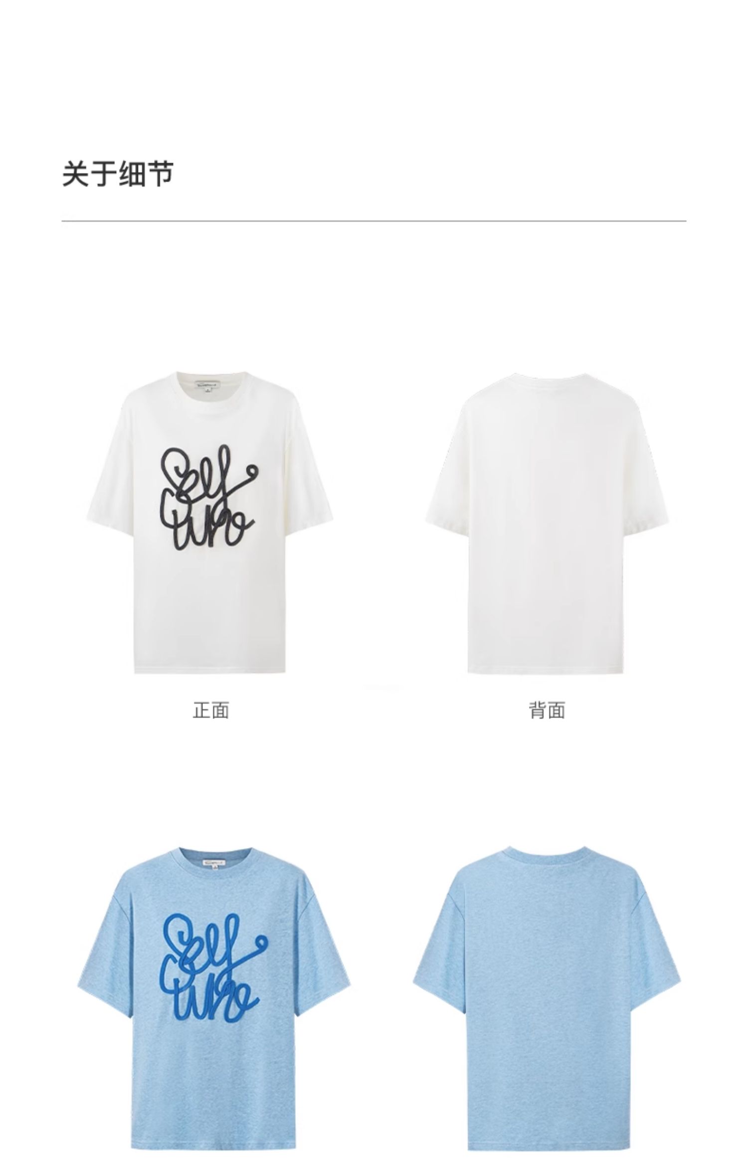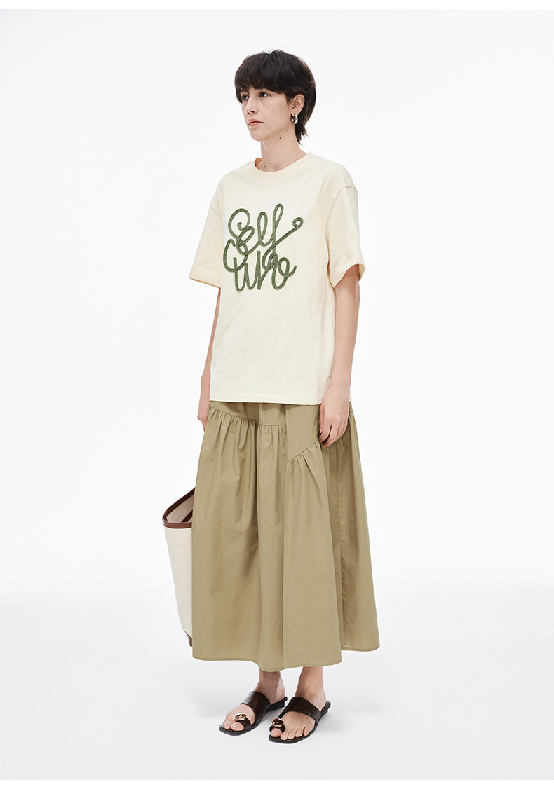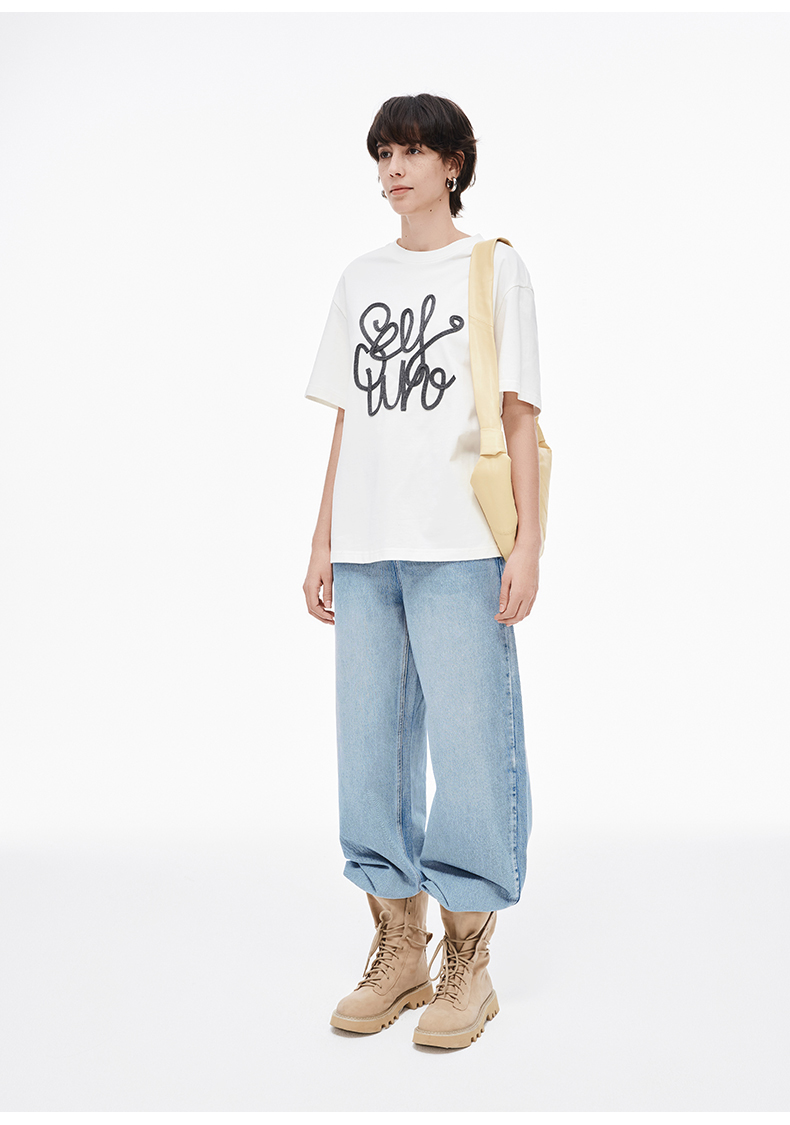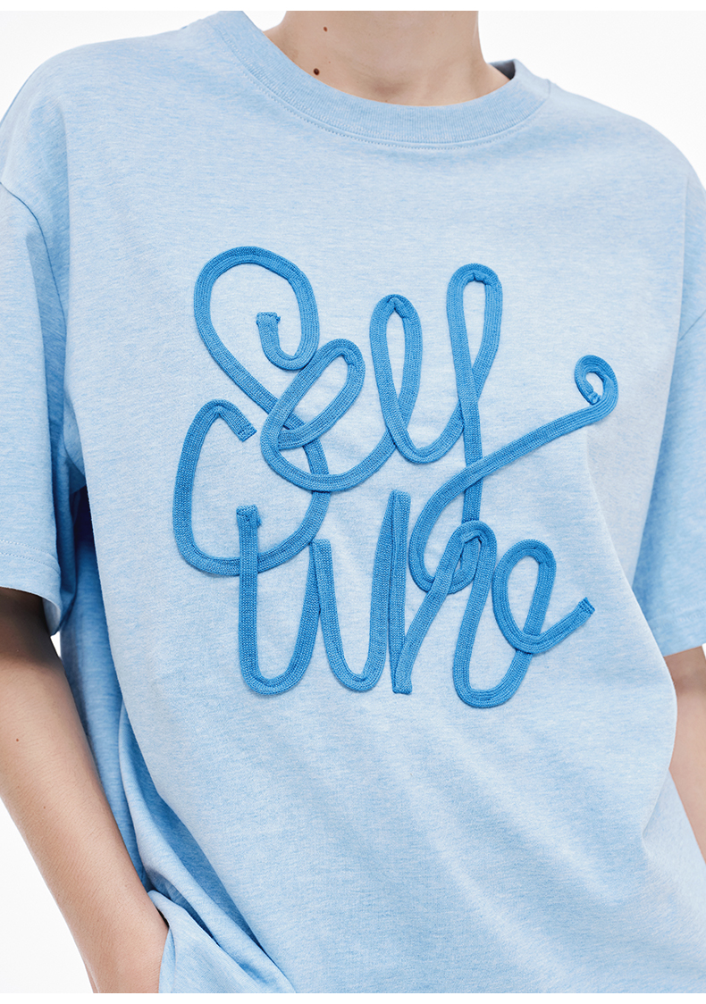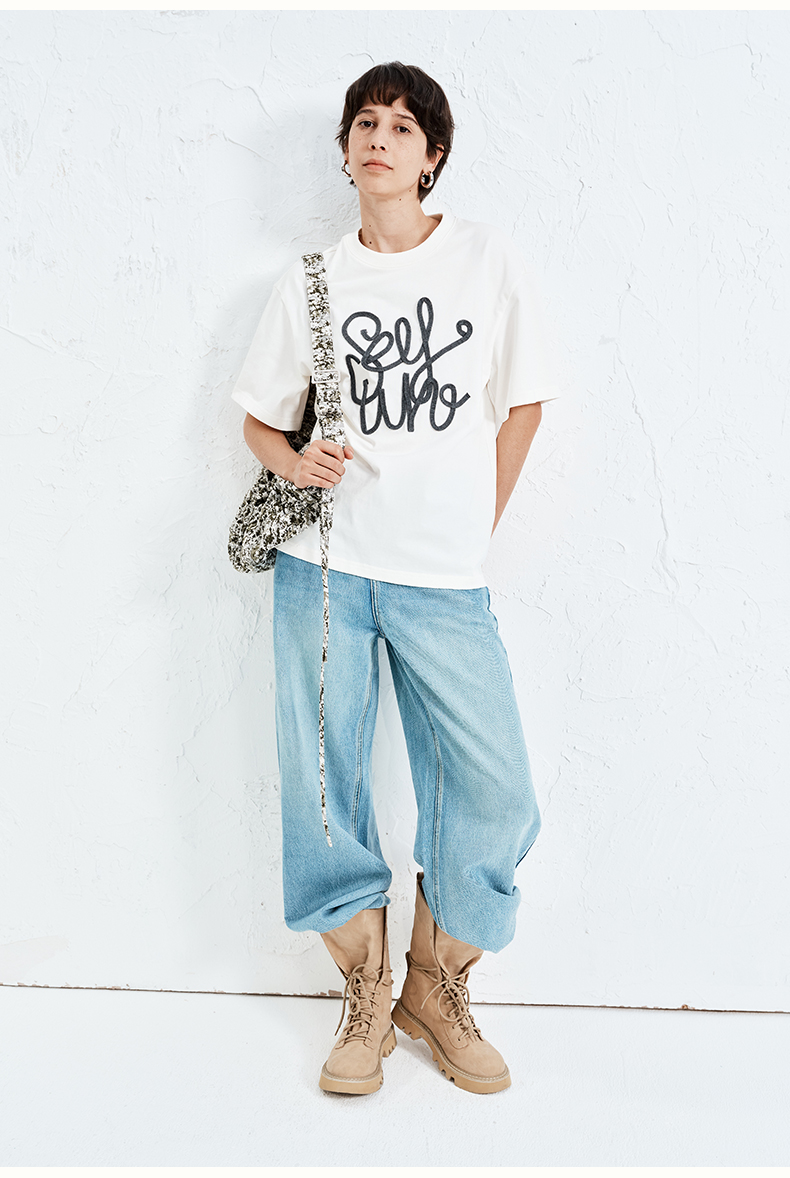 [黄圣依同款]SELFWHO全棉纯色短袖T恤女夏季新款宽松手工摇绣上衣