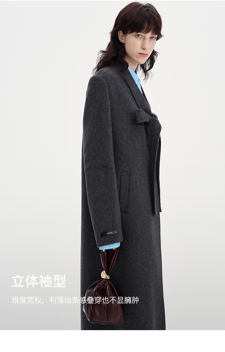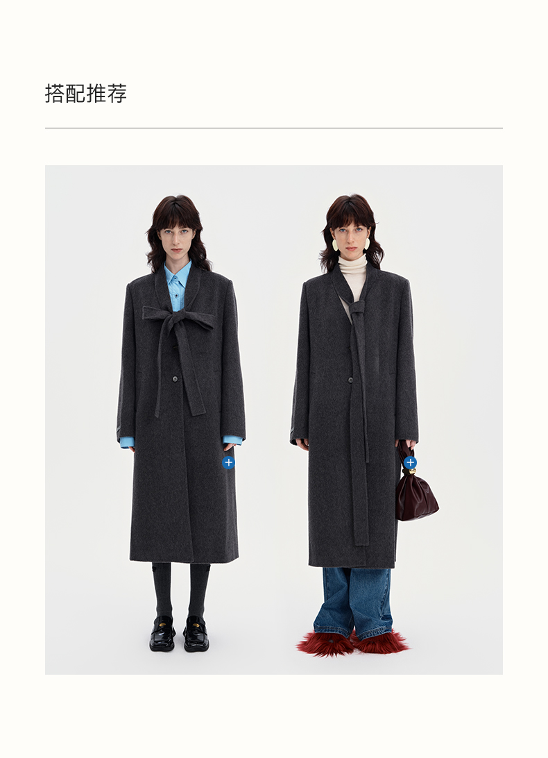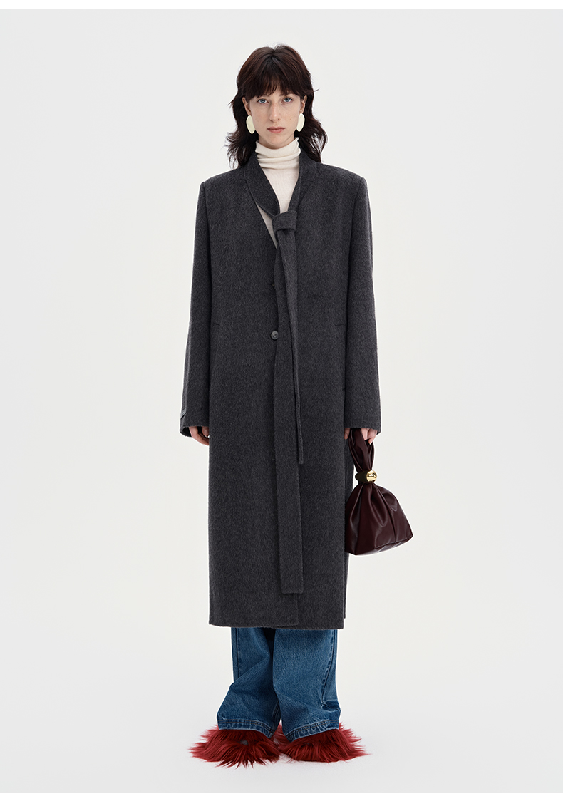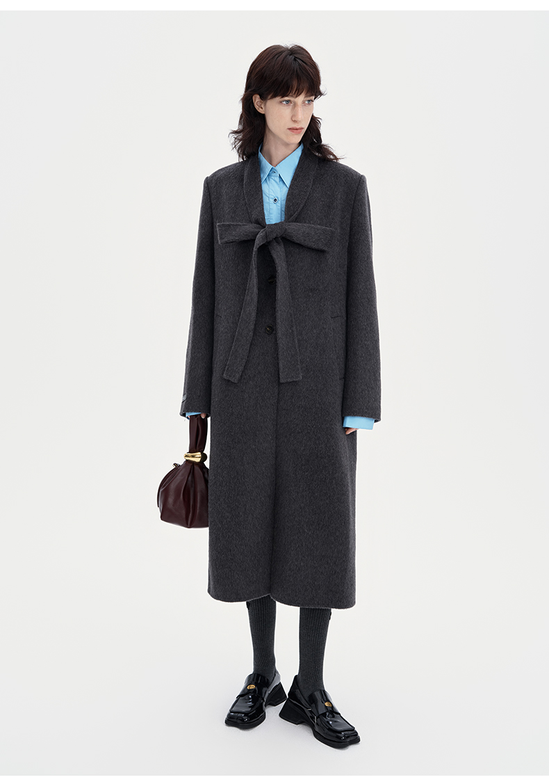 SELFWHO灰色澳洲进口绵羊毛驼绒双面呢大衣女秋冬设计感绑带外套