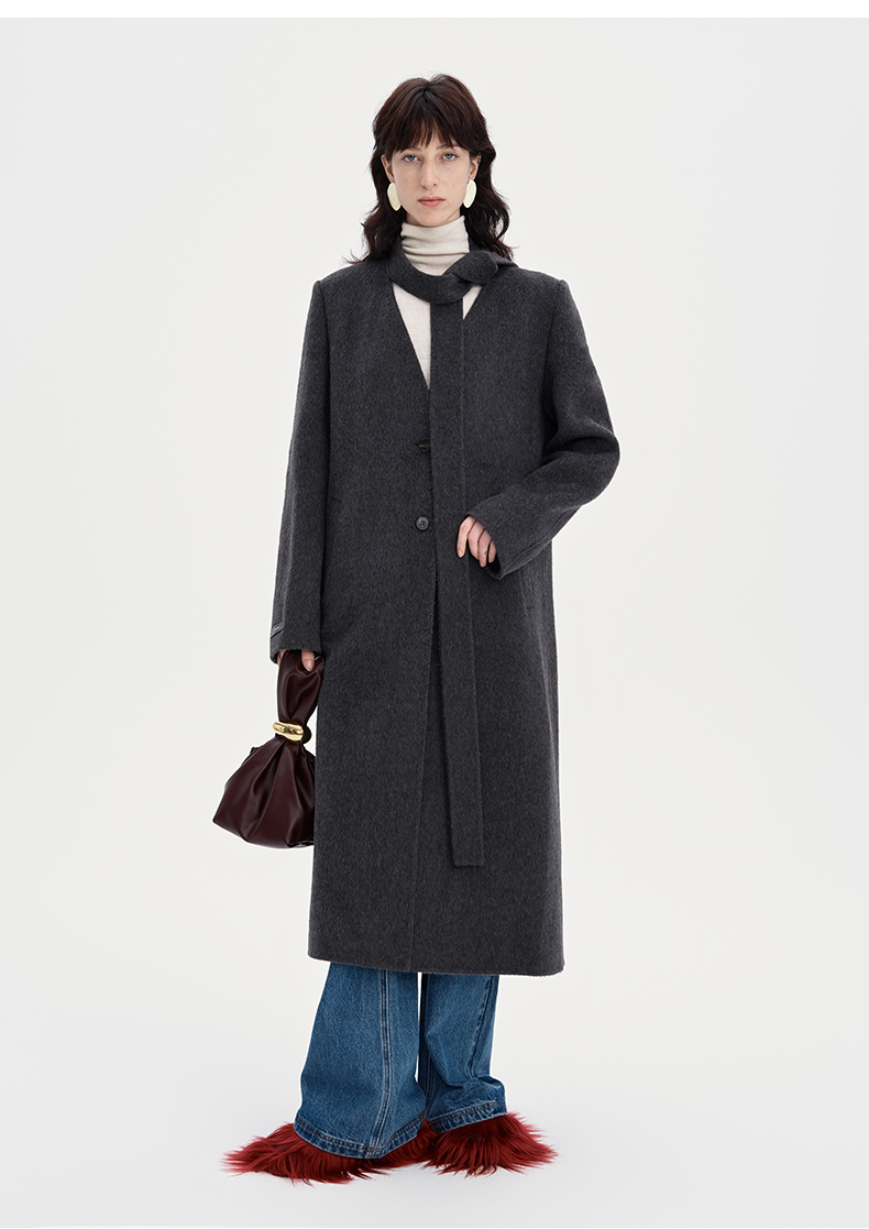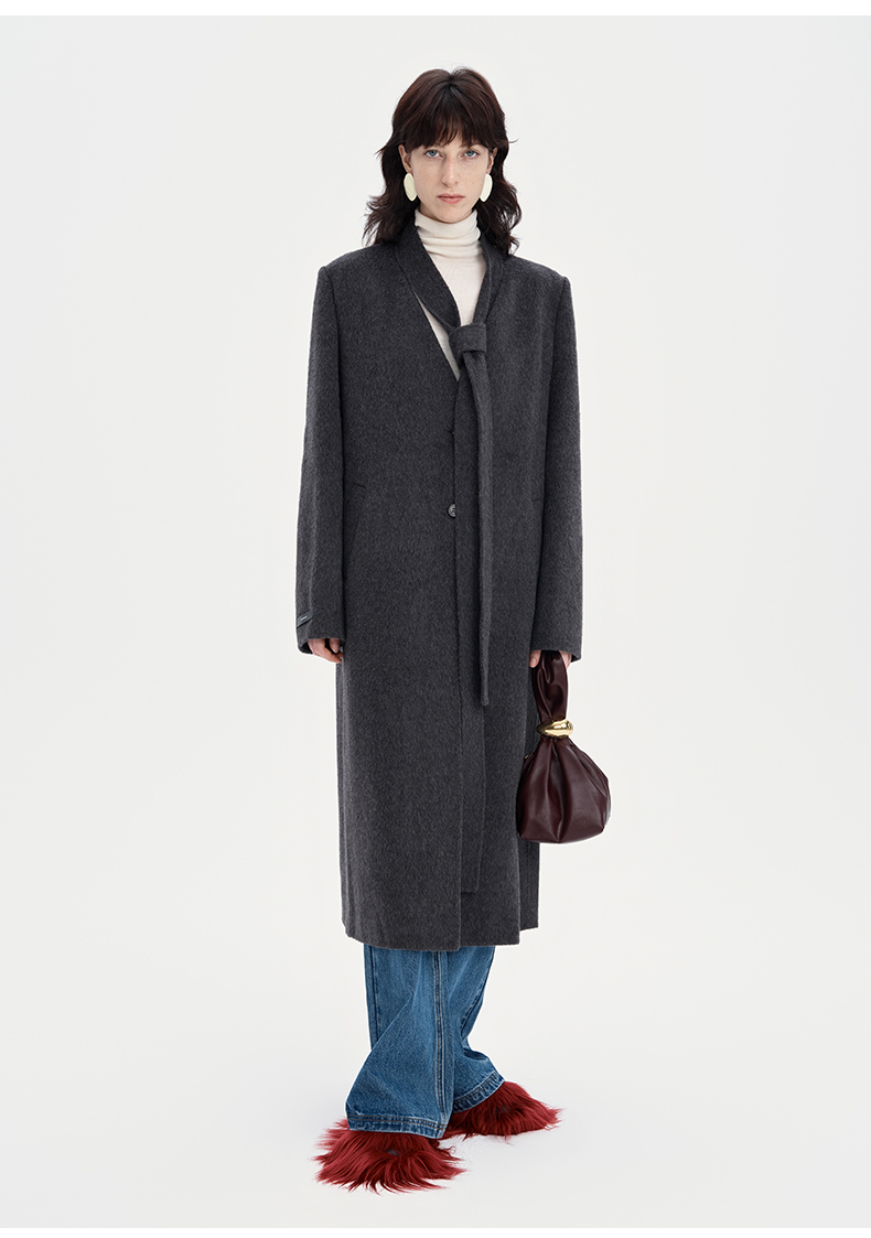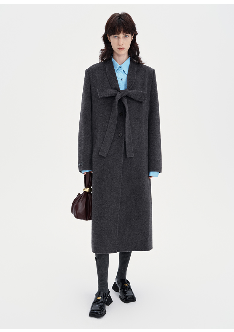 SELFWHO灰色澳洲进口绵羊毛驼绒双面呢大衣女秋冬设计感绑带外套