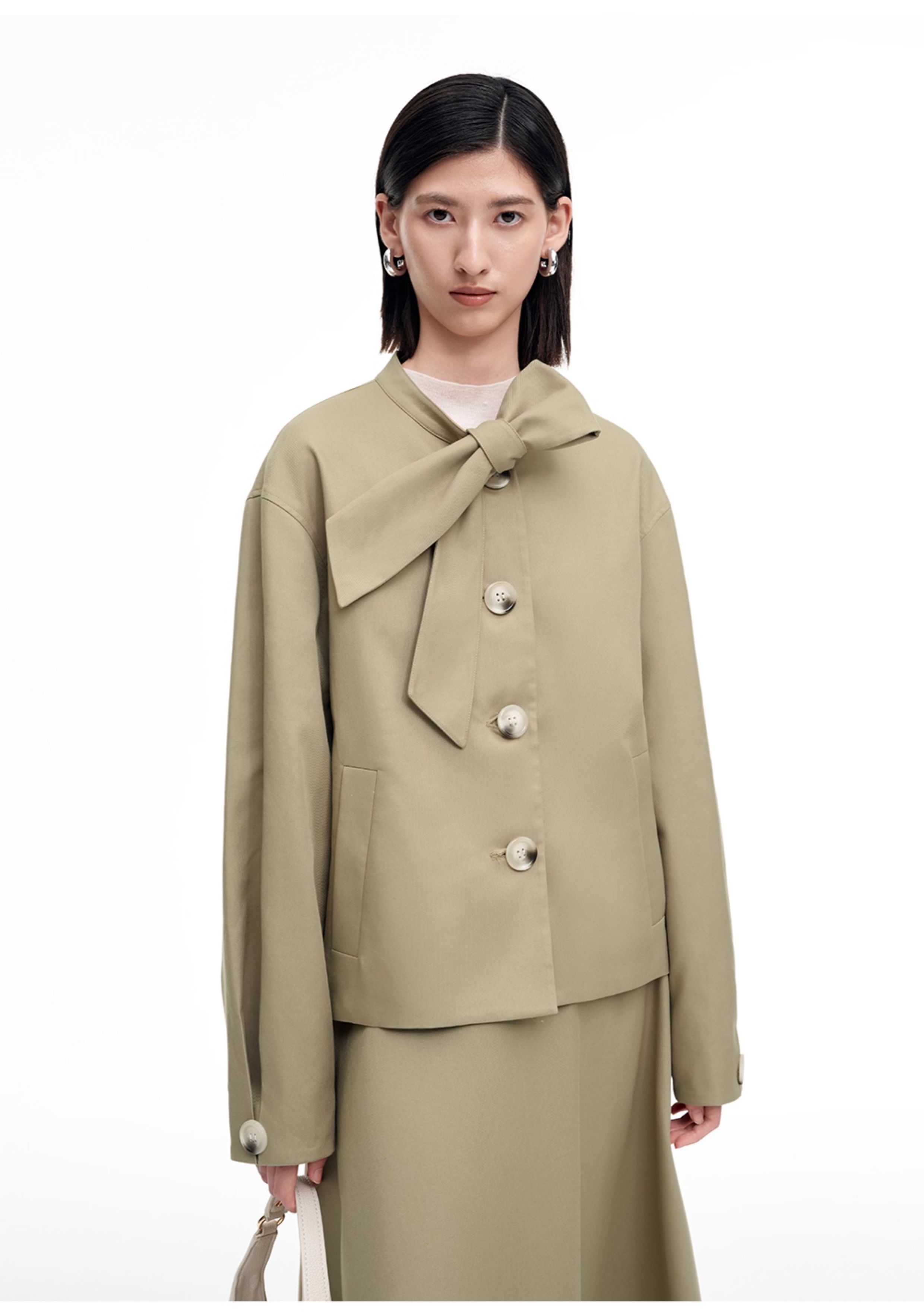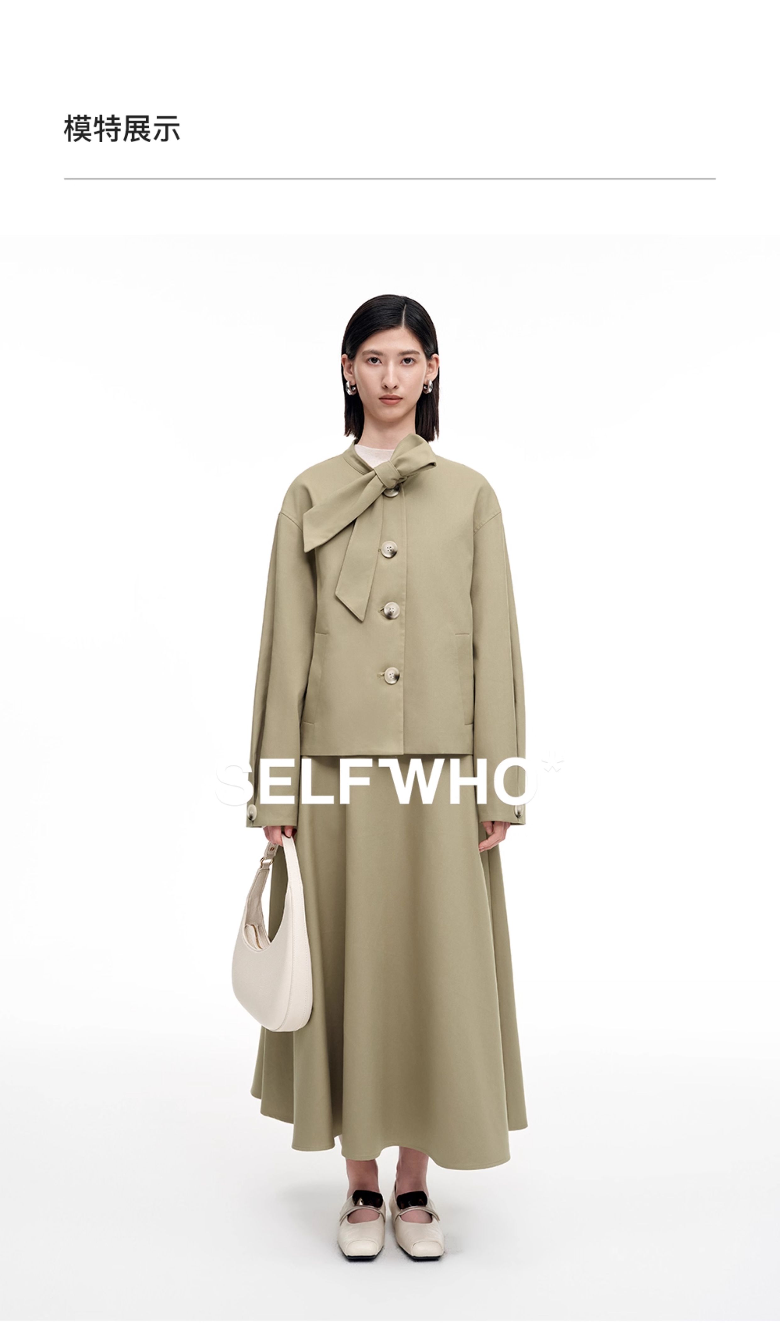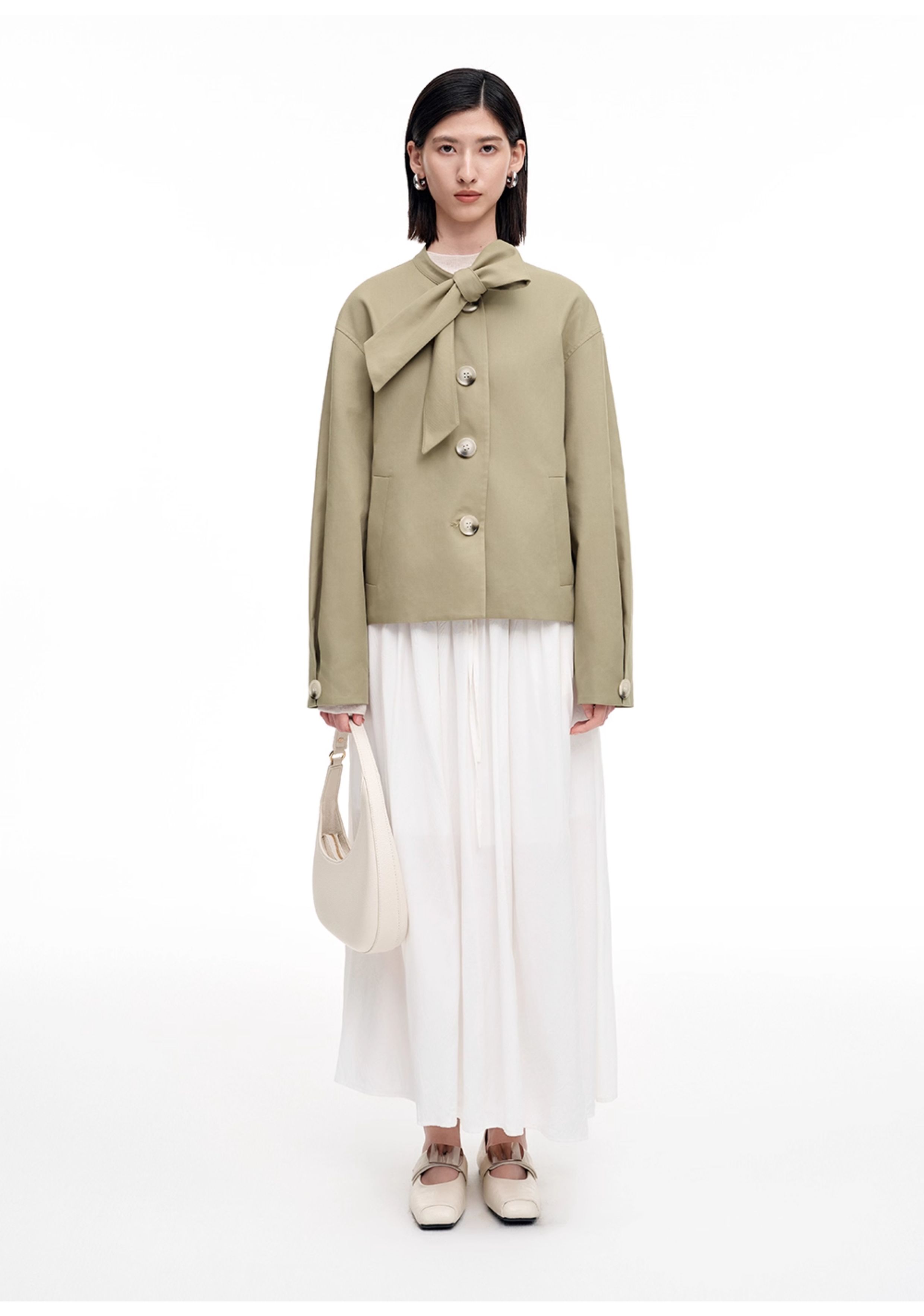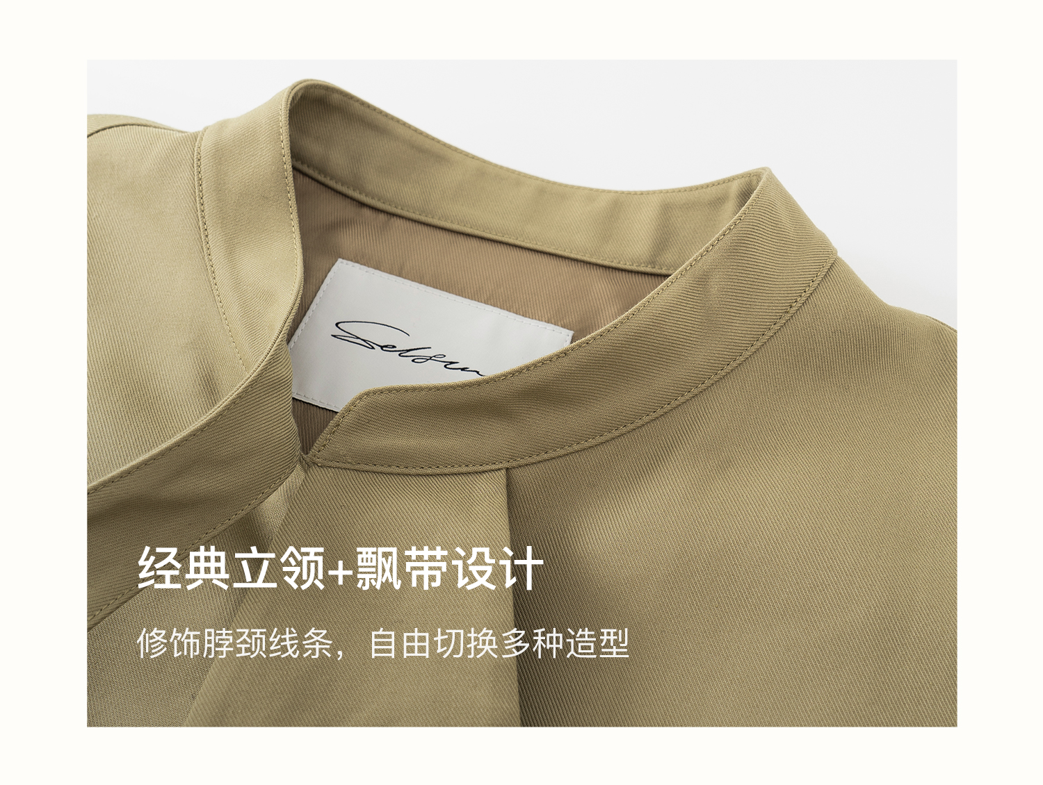 SELFWHO棉混纺卡其色飘带风衣外套女2025秋新款宽松显瘦百搭外套