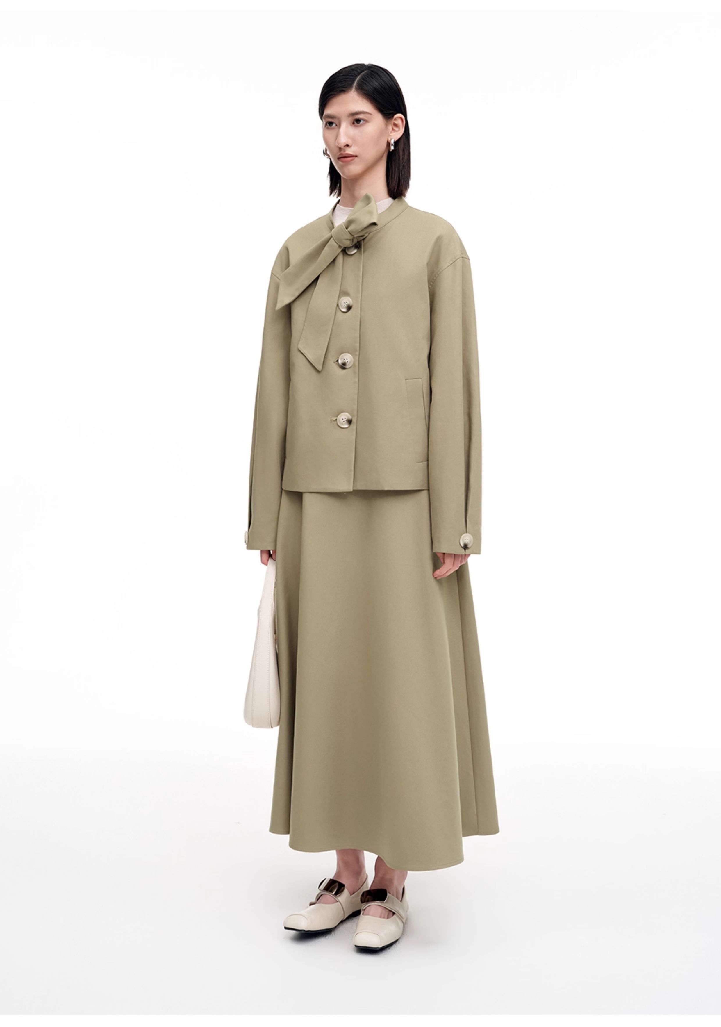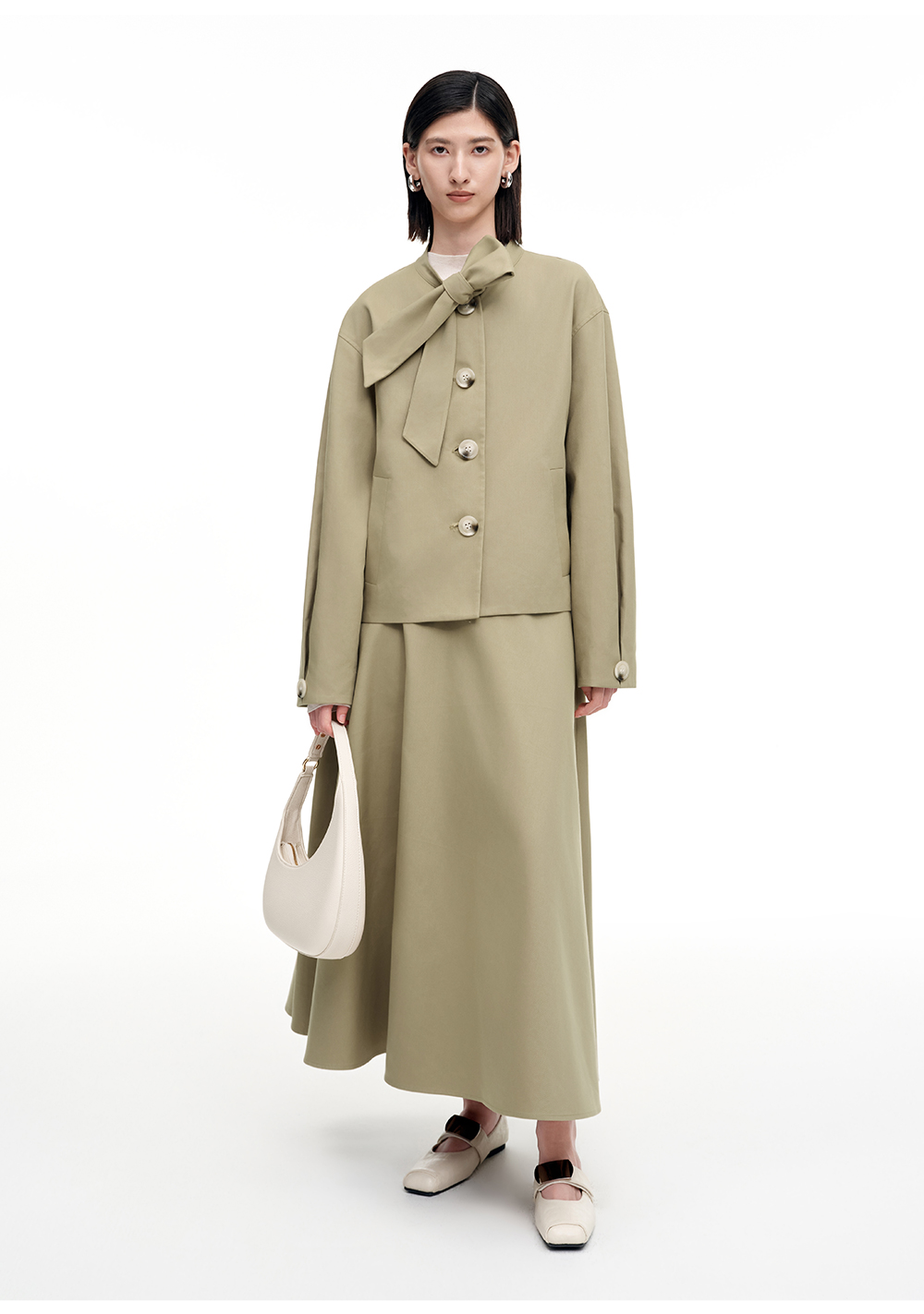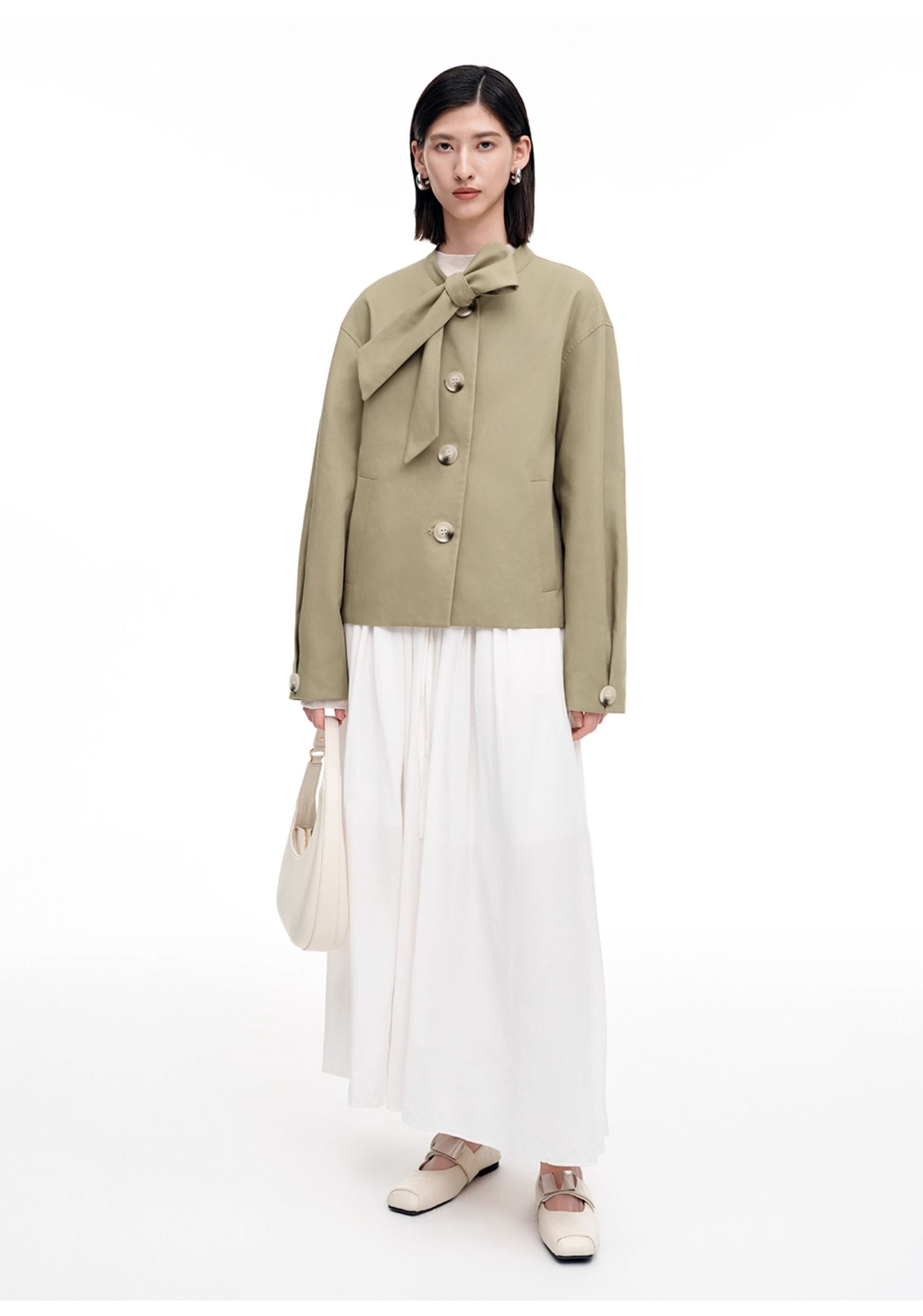 SELFWHO棉混纺卡其色飘带风衣外套女2025秋新款宽松显瘦百搭外套
