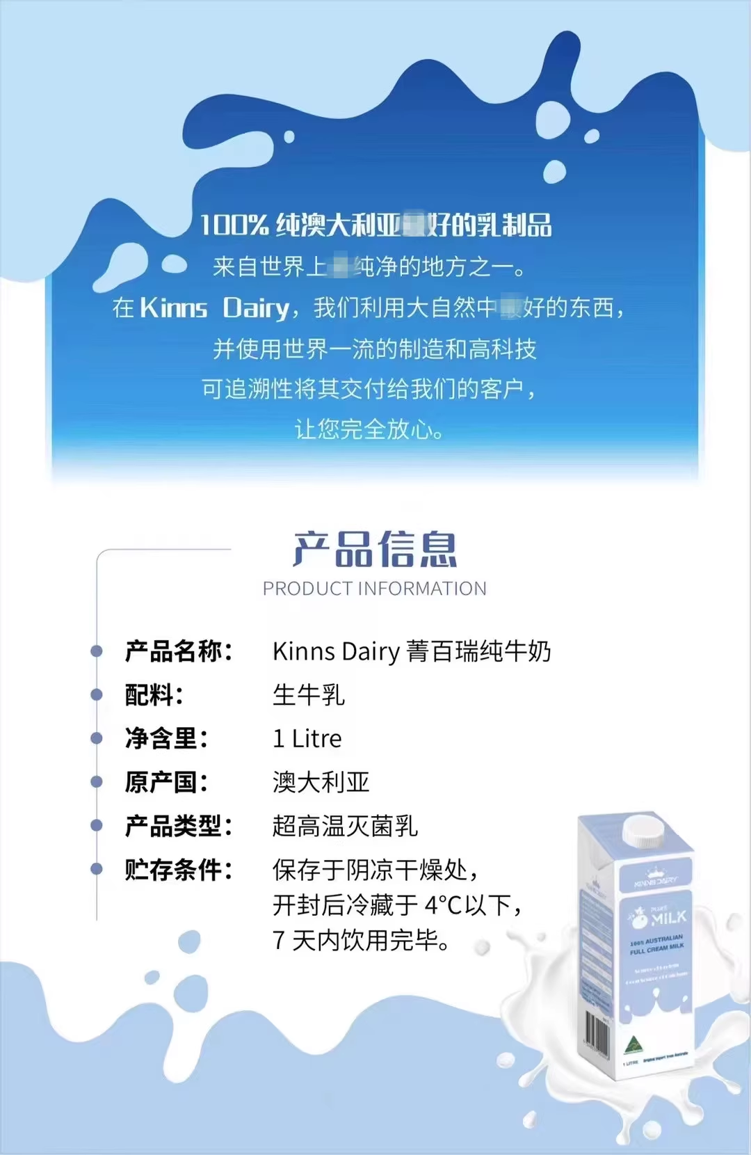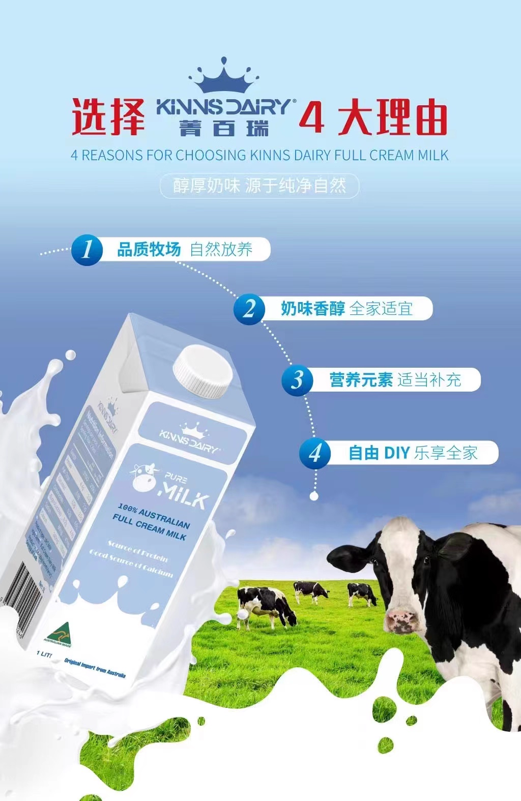 菁百瑞KINNS DAIRY纯牛奶澳洲进口全脂纯牛奶1L