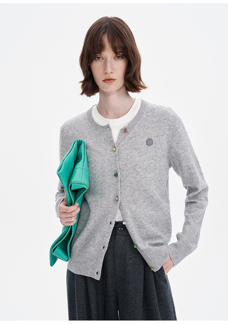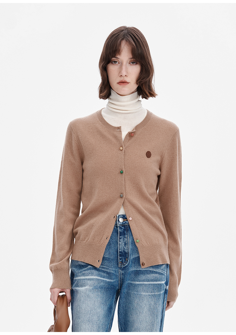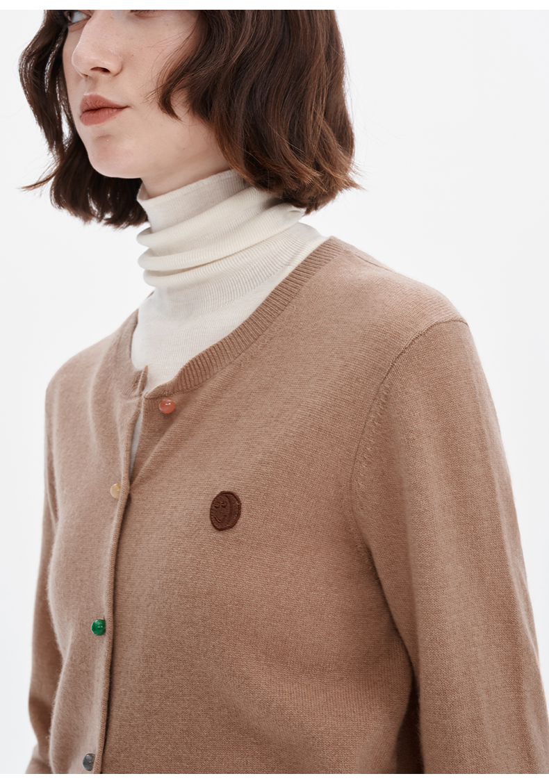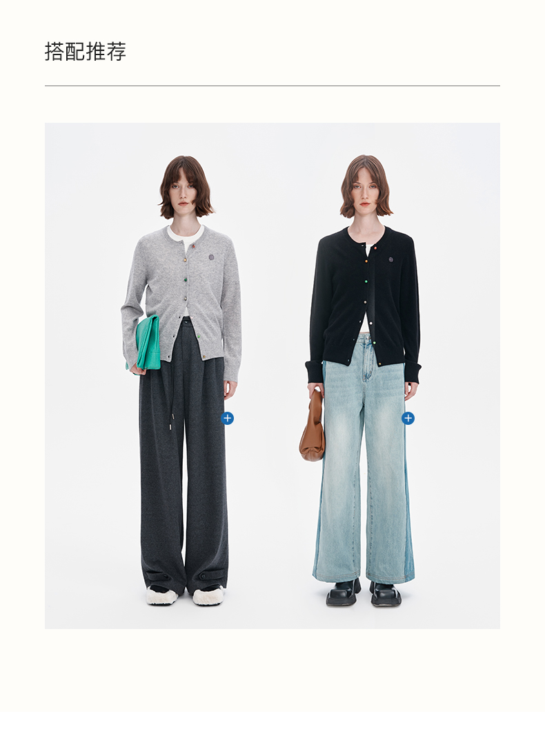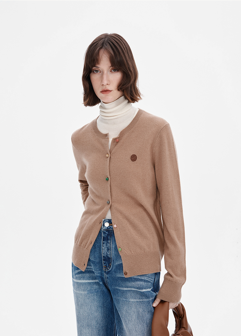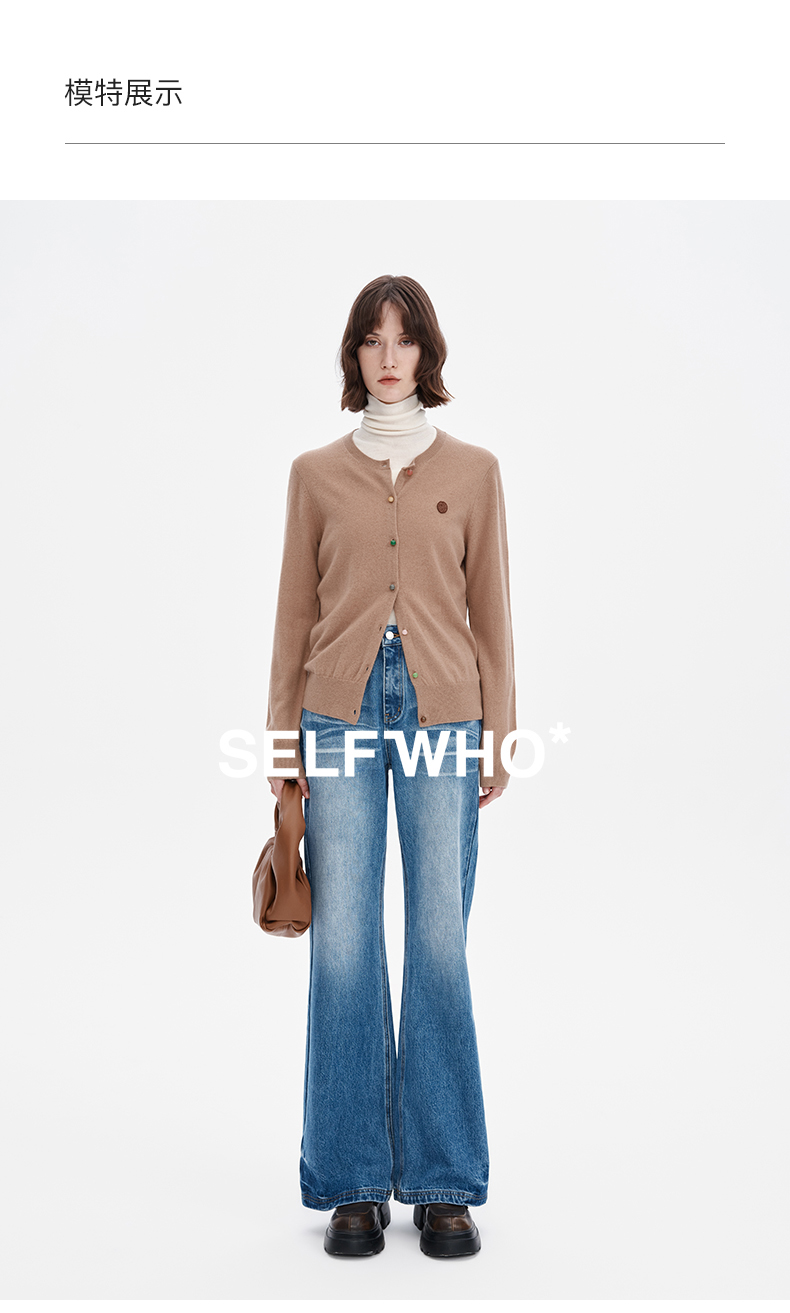 SELFWHO羊毛羊绒混纺经典纯色针织开衫女2024秋新款圆领百搭外套