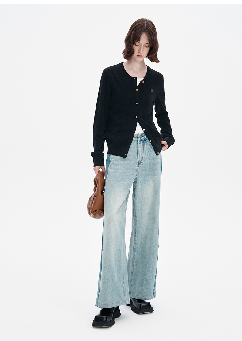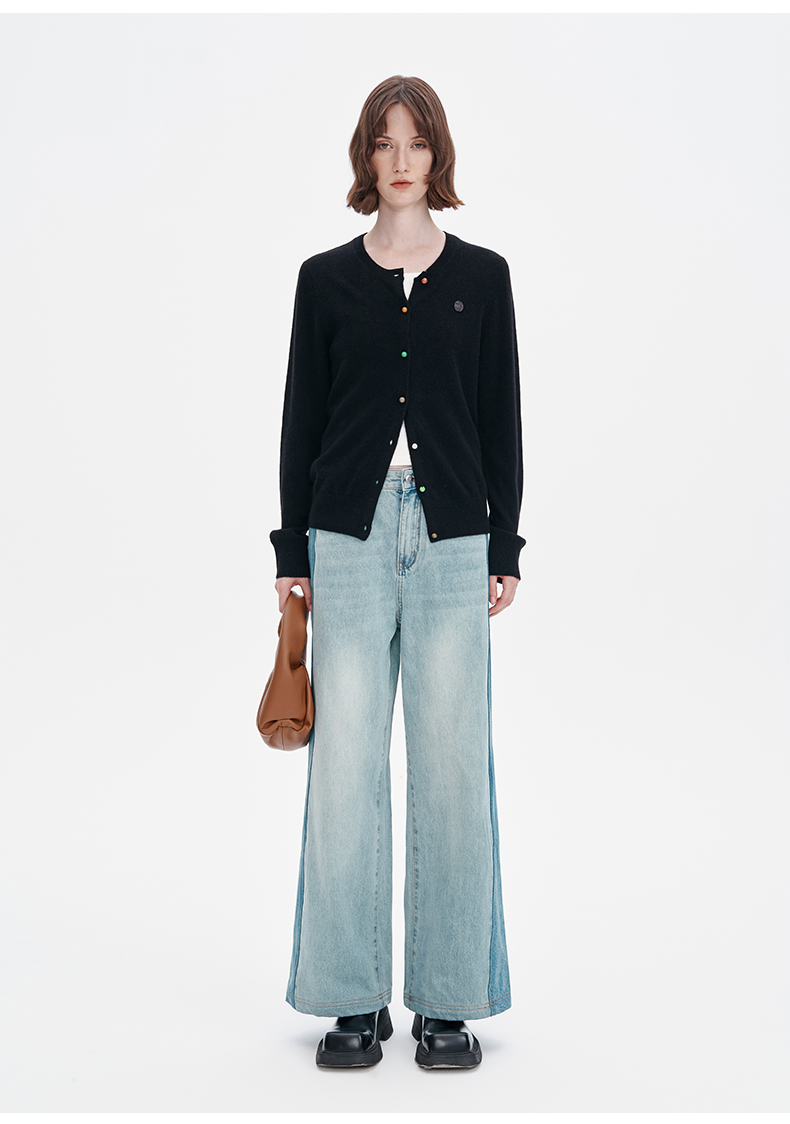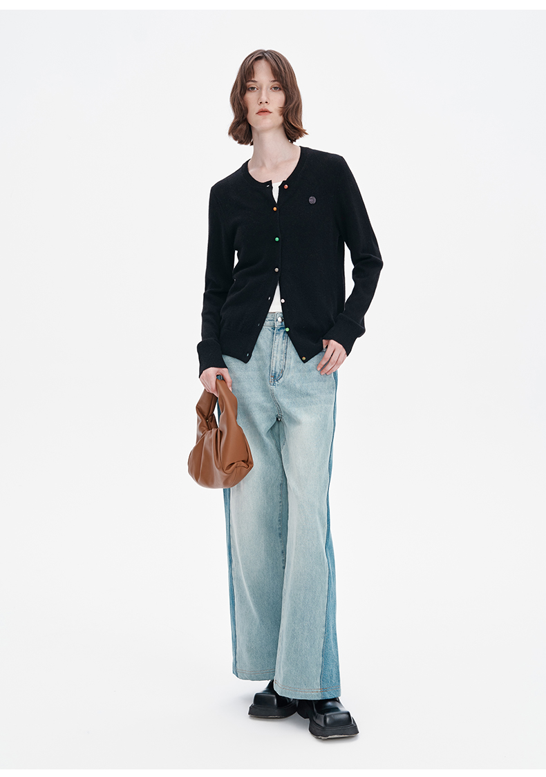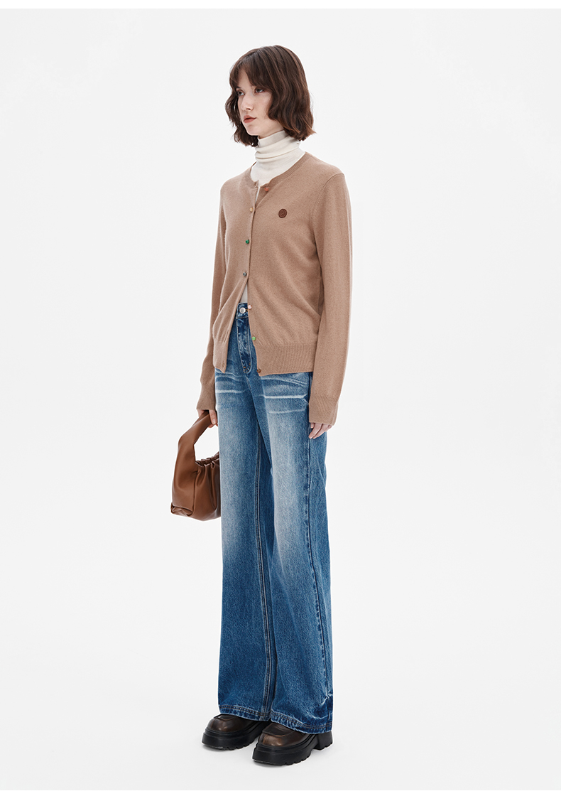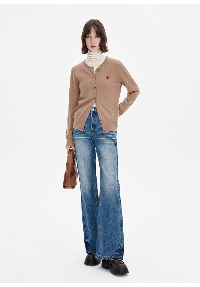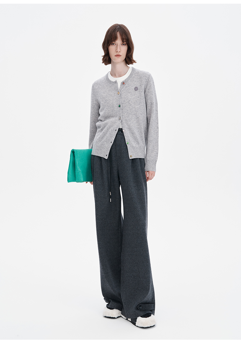 SELFWHO羊毛羊绒混纺经典纯色针织开衫女2024秋新款圆领百搭外套
