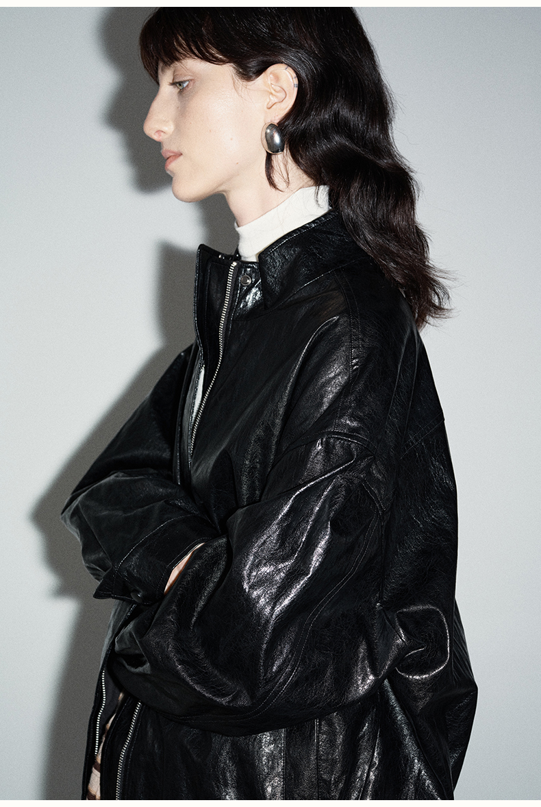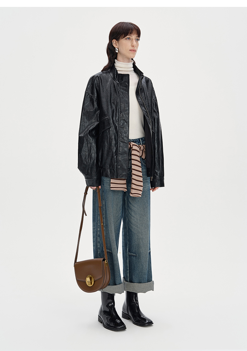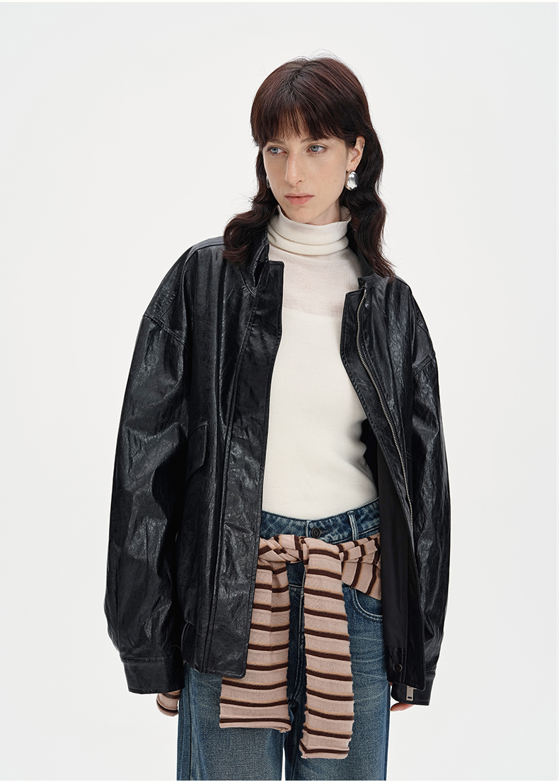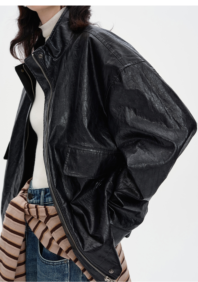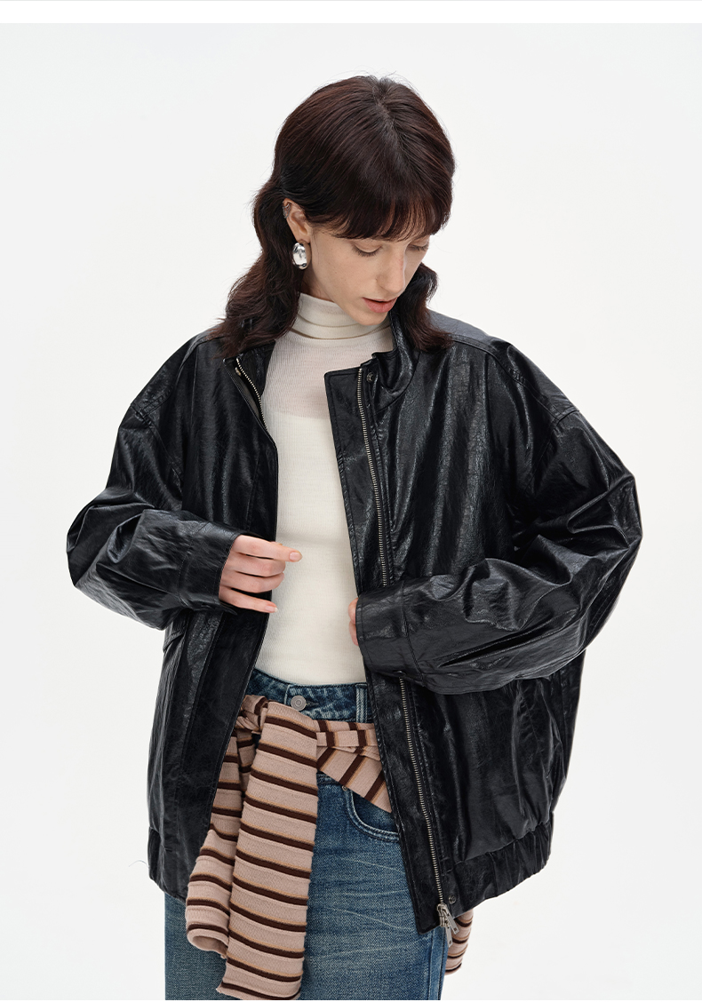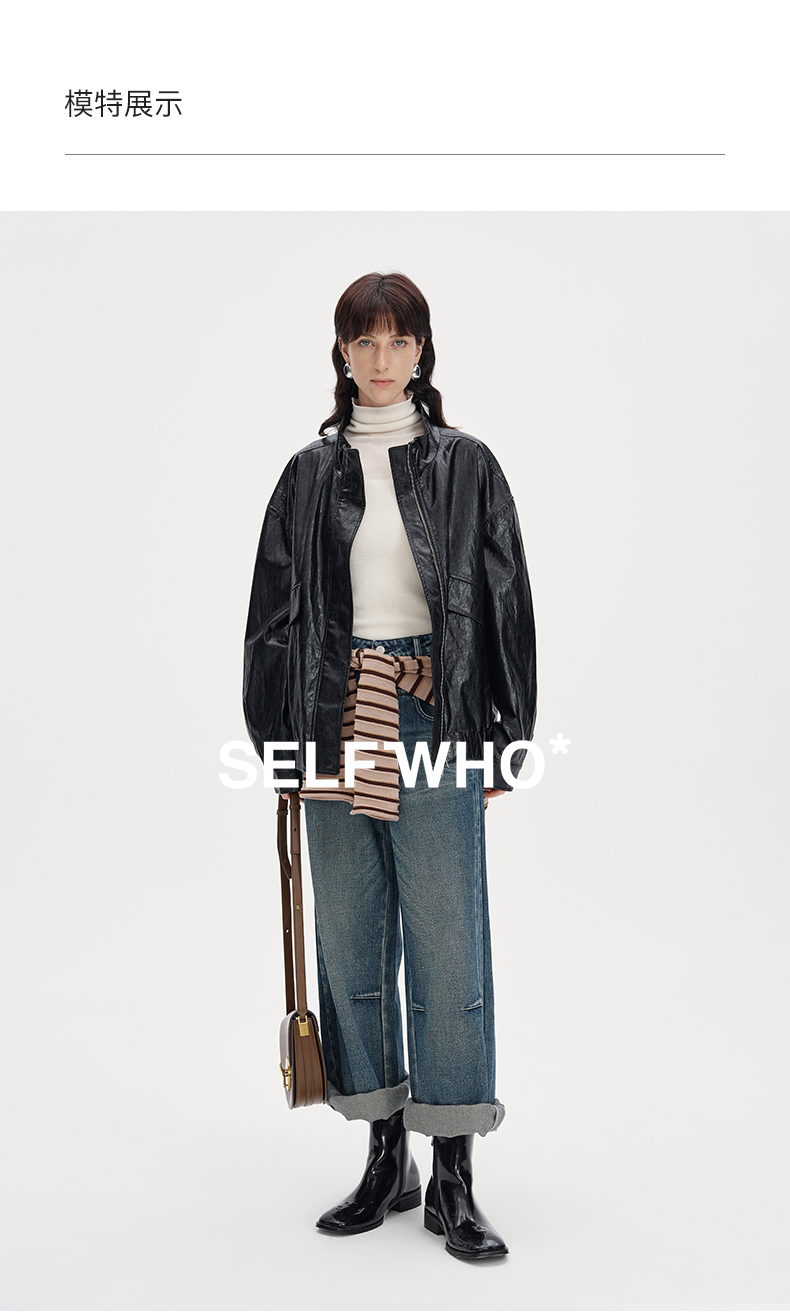 SELFWHO复古美式黑色pu皮衣外套女2024秋季新款小个子设计感夹克