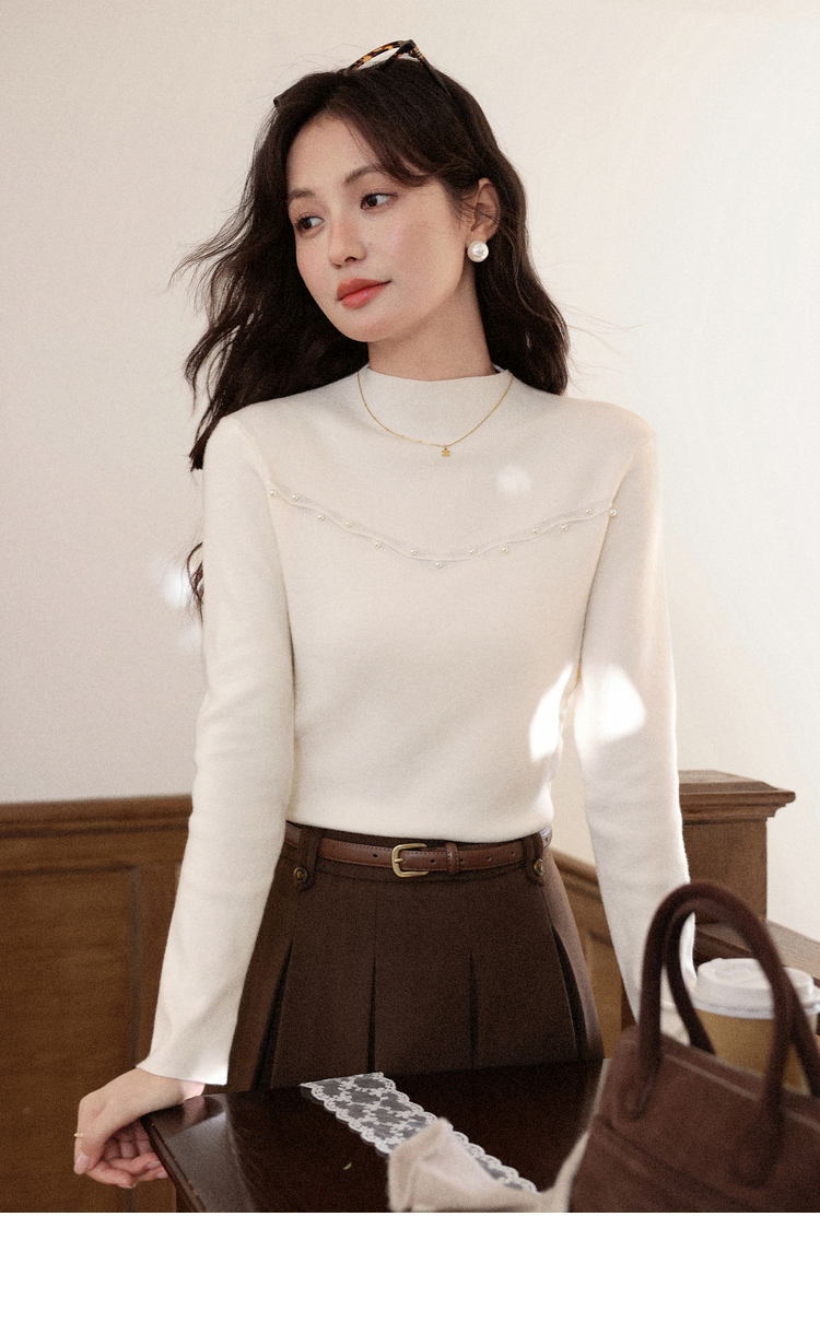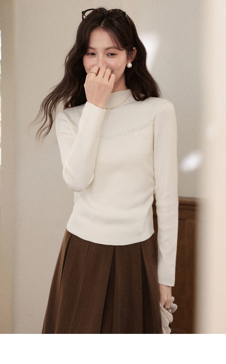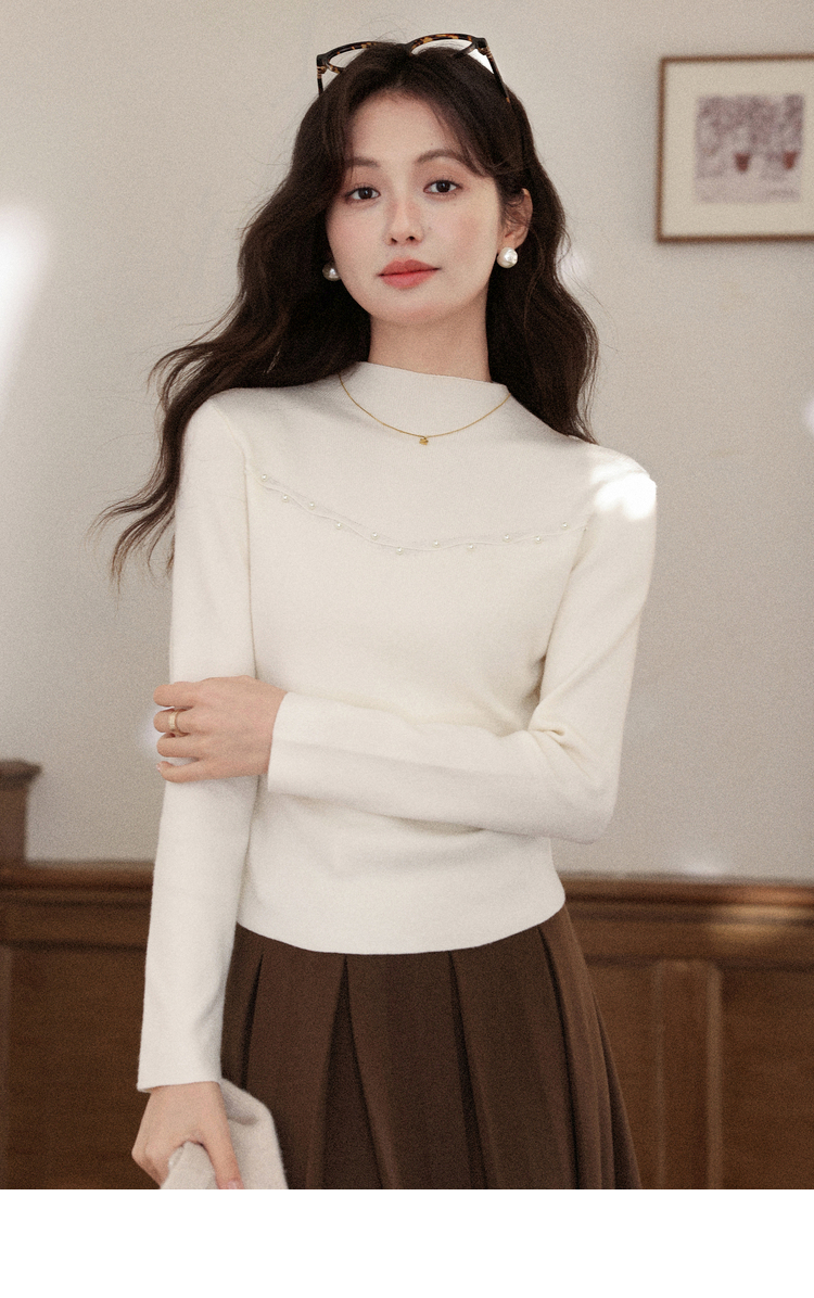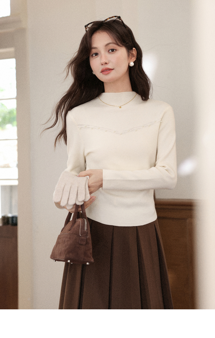 鹿向南「百搭内搭」半高领正肩杏色针织衫女早秋修身长袖打底衫