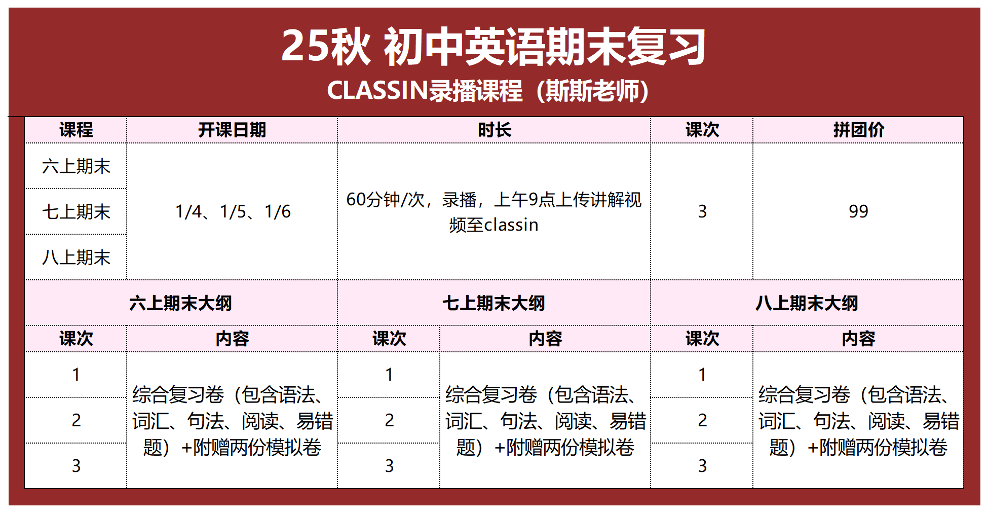 录播课,老师会在1月4日、1月5日、1月6日 上午9点左右上传录播讲解视频,视频时长60分钟,学生可自行安排时间上classin观看并做题。