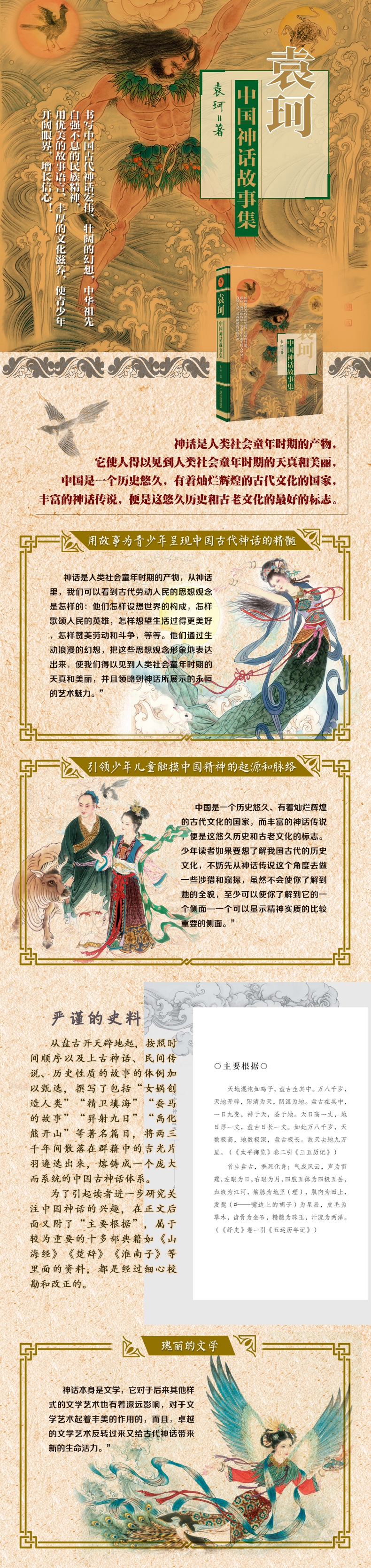 故事从盘古开天辟地起,按照时间顺序,独立成篇,甄选百余篇,包括“盘古开天辟地”“精卫填海”“蚕马的故事”“羿射九日”“禹化熊开山”等著名篇目,将两三千年间散落在群藉中的吉光片羽遴选出来,熔铸成一个庞大而系统的中国古神话体系。袁珂先生善用故事生动地呈现中国神话的精髓,在严谨的史料之外又为中国神话的讲述披上了文学的瑰丽外衣。