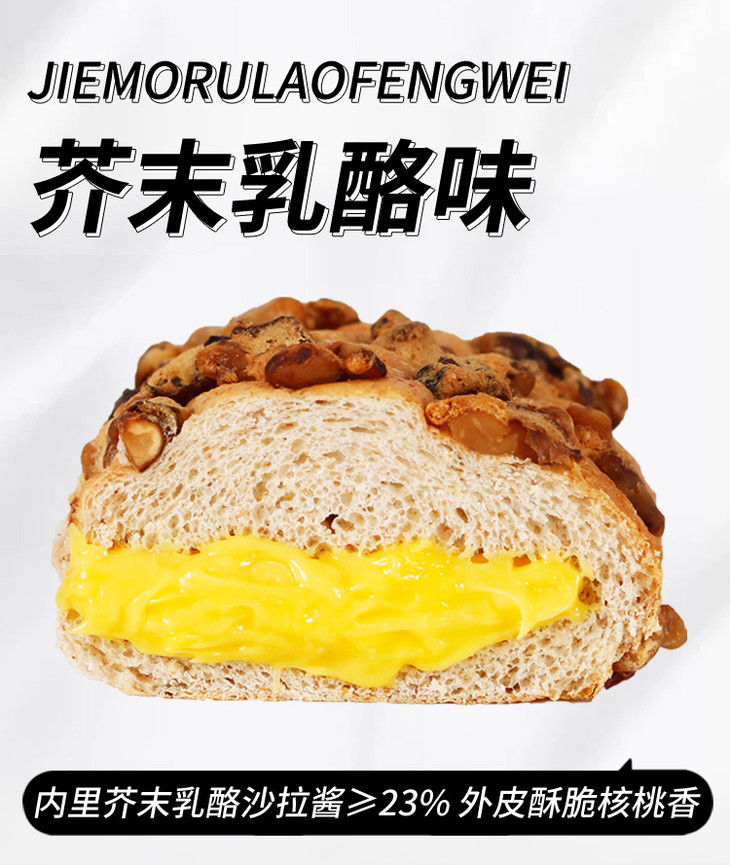 💥口感核爆现场: ✔第一口:芥末的微辛直冲天灵盖!🧨 ✔第二口:奶酪的咸香疯狂打配合🥛 ✔第三口:开心果酱的香甜温柔收尾🌰 核桃脆片咔哧咔哧在嘴里放烟花 外酥内软的面包体还会拉丝!! 本猎奇星人宣布这对CP锁死了!!