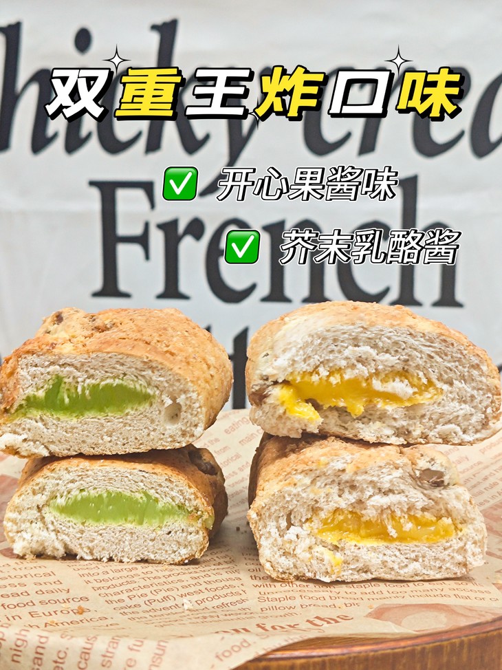 这个让编辑部抢到打架的【核桃马里奥面包】, 一次就能尝到冰火两重天的快乐❄ 📸颜值暴击预警: 奶fufu的面包胚裹满琥珀色核桃碎 一个是抹茶绿开心果酱流淌着春日感🌿 一个是芥末奶酪霜像熔岩般喷涌而出🧀 手机先吃党狂喜!原图直出都美到犯规!!