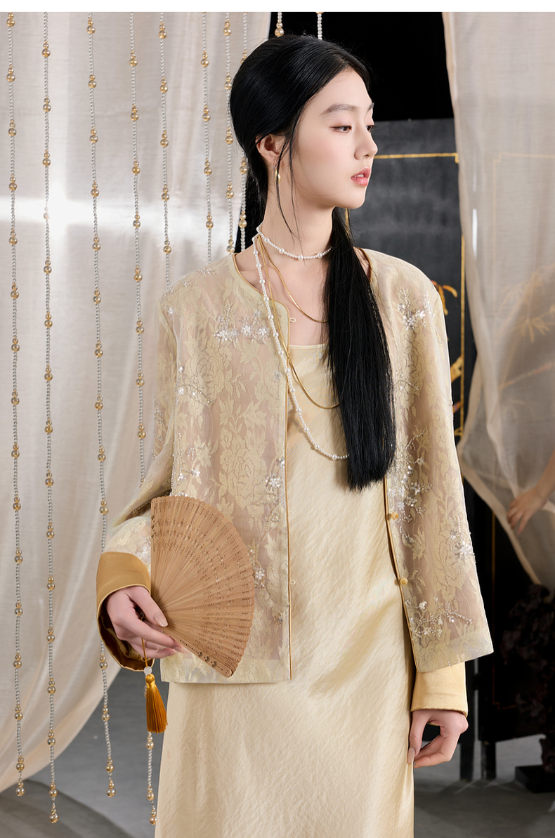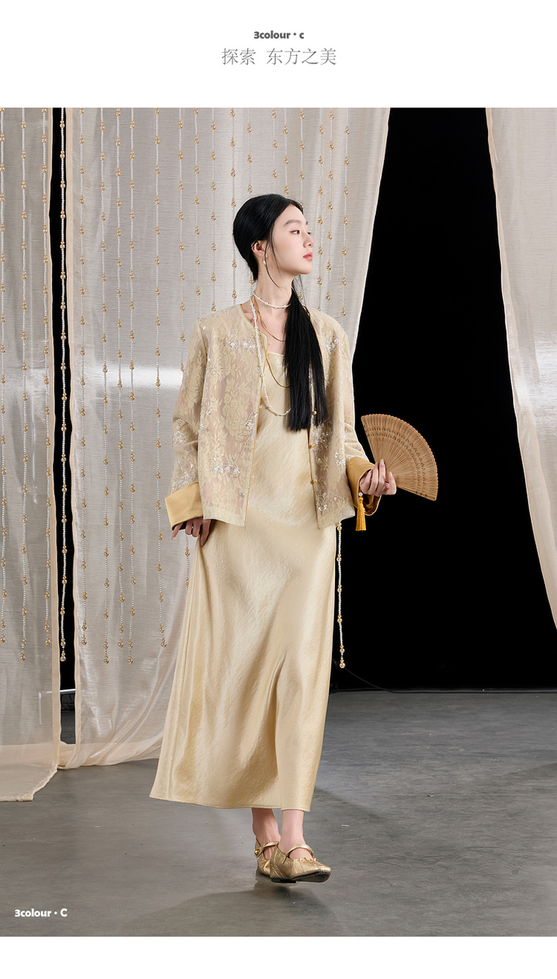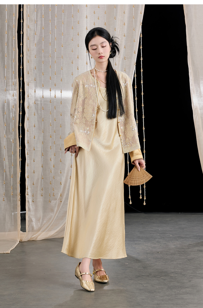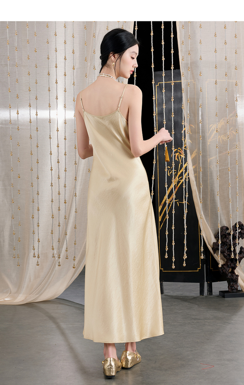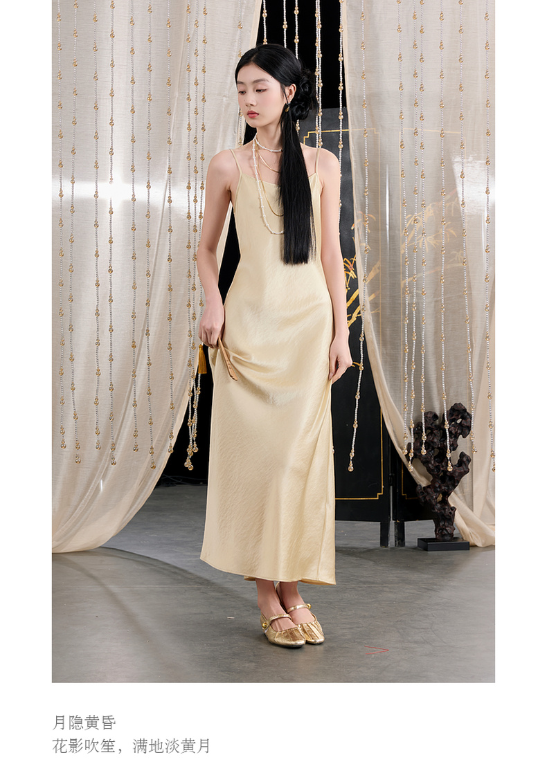 三彩【月隐黄昏】2025秋季新款缎面吊带裙斜裁长裙内搭中式C