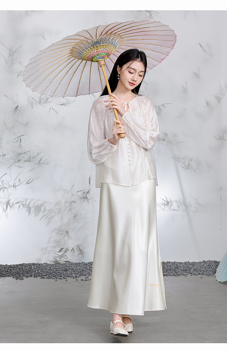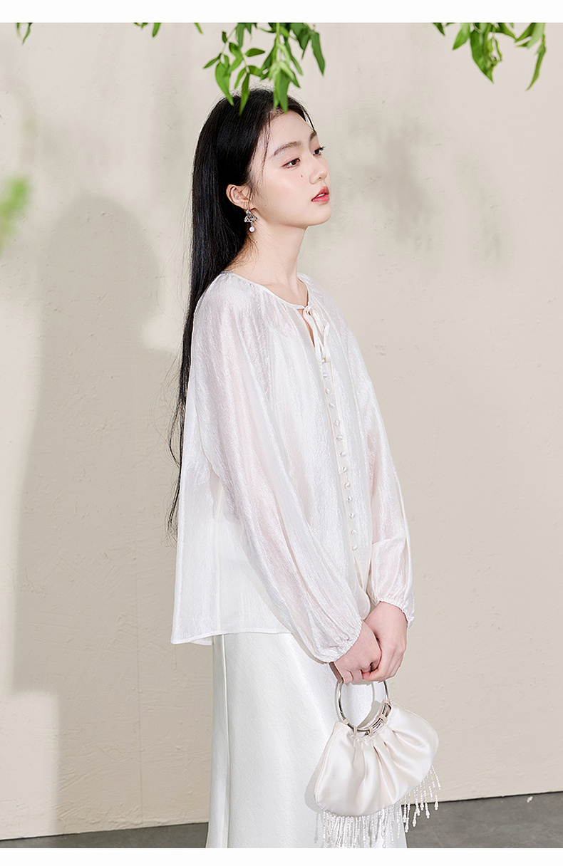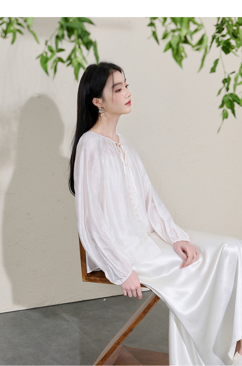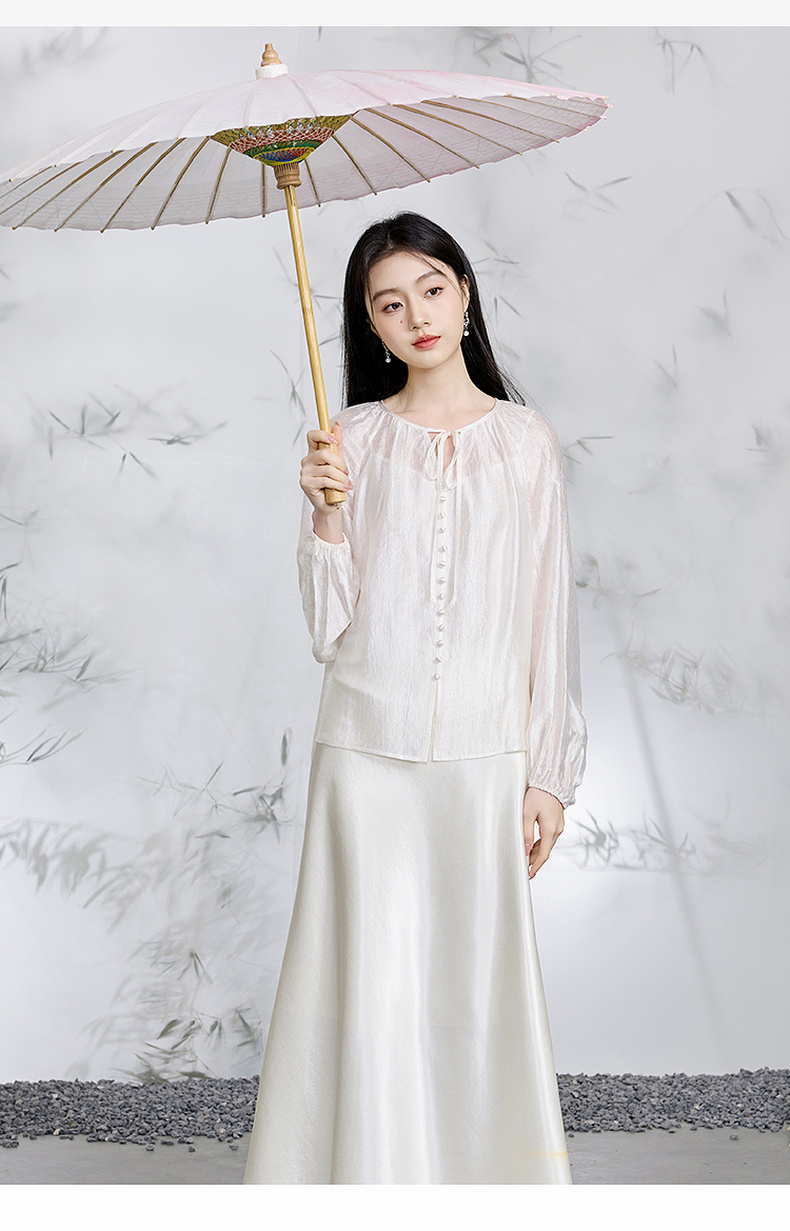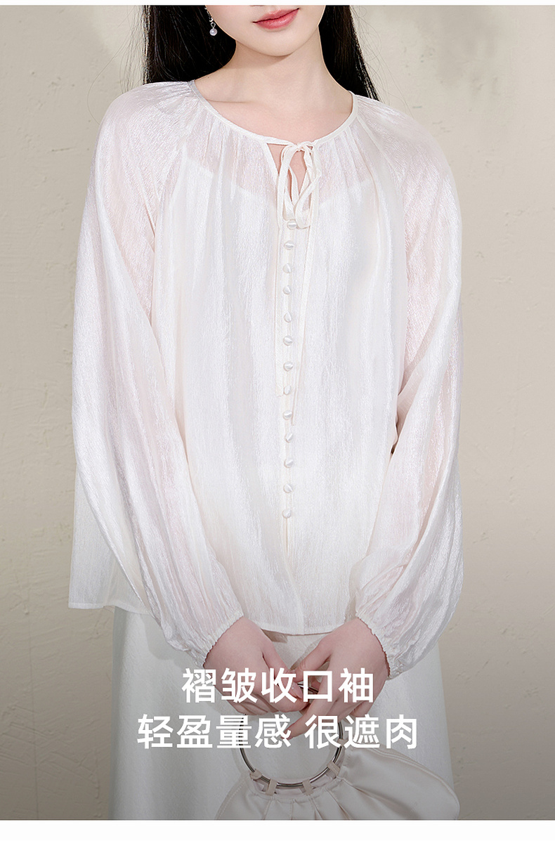 三彩【清风明月】2026春季新款新中式醋酸小衫系带宽松上衣C