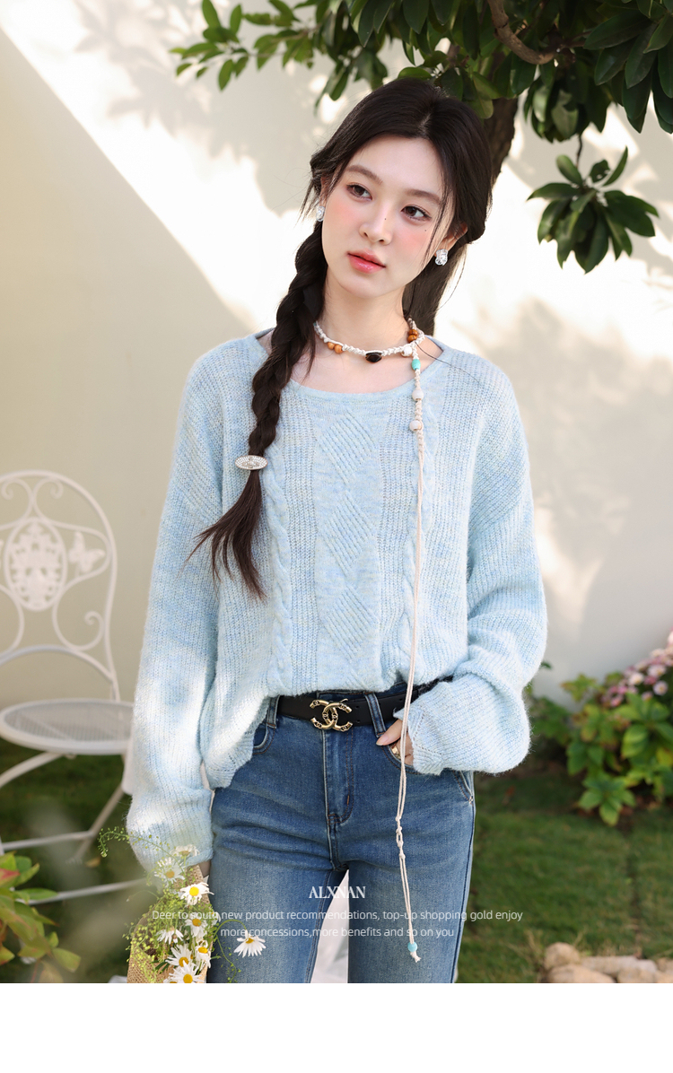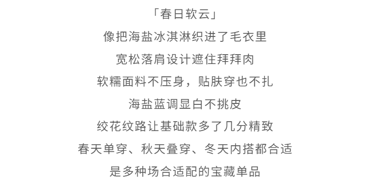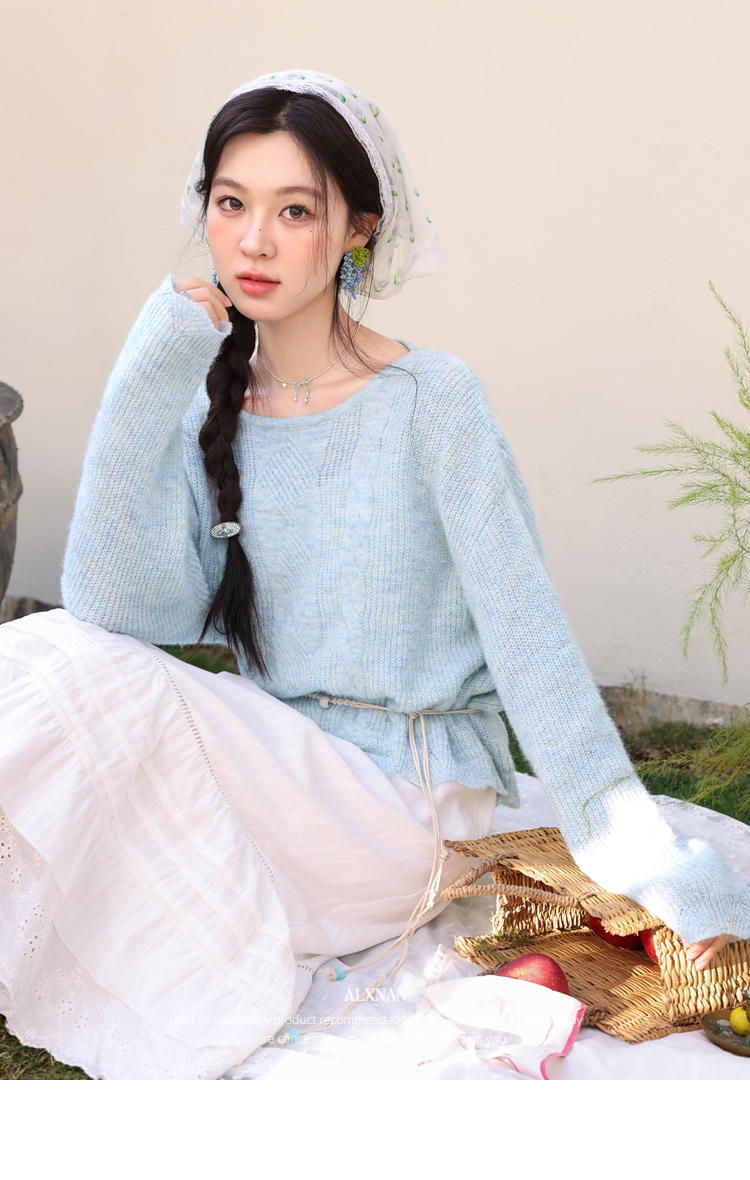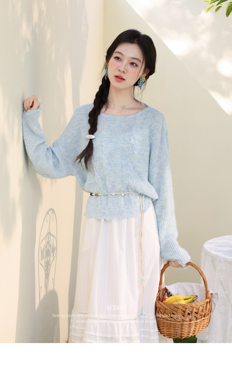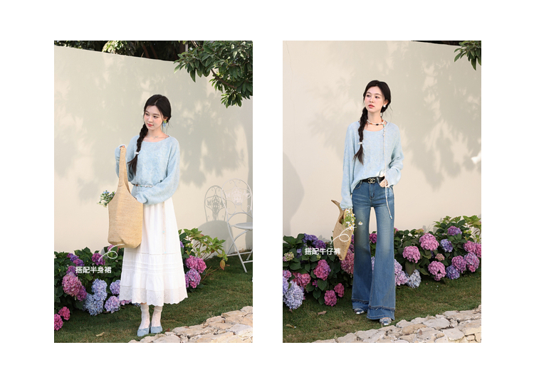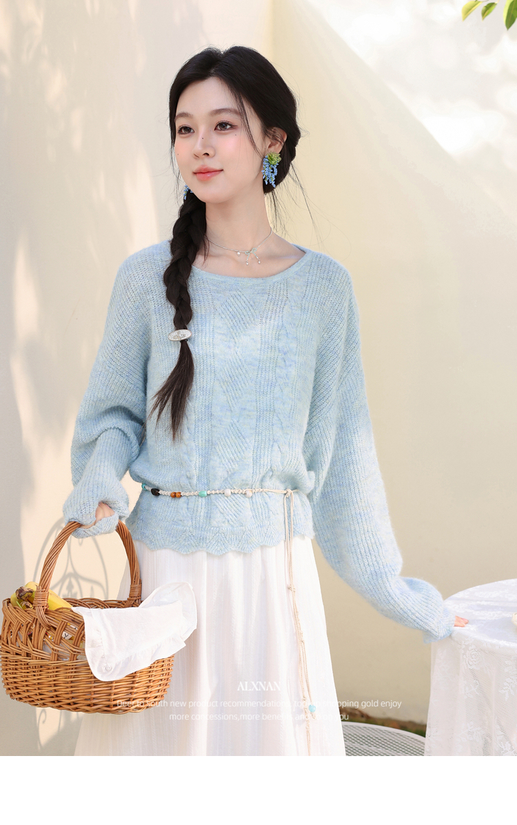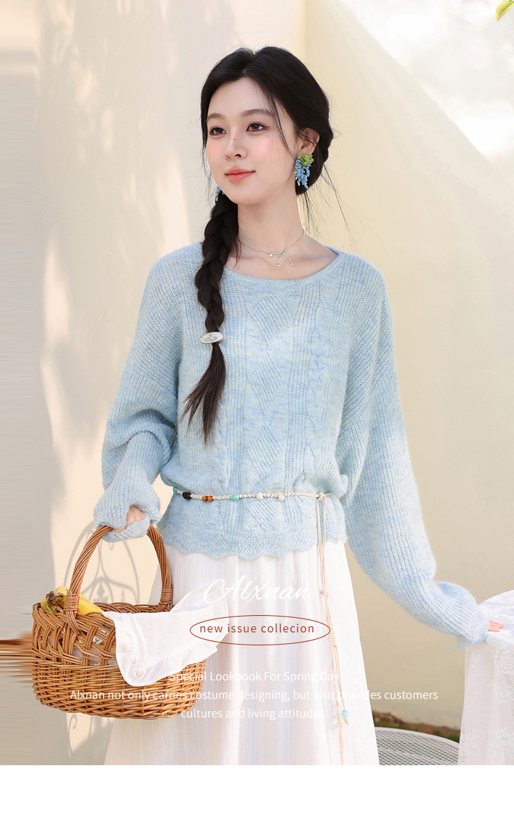 鹿向南「风信子」慵懒感蓝色针织衫女春季收腰显瘦圆领长袖上衣