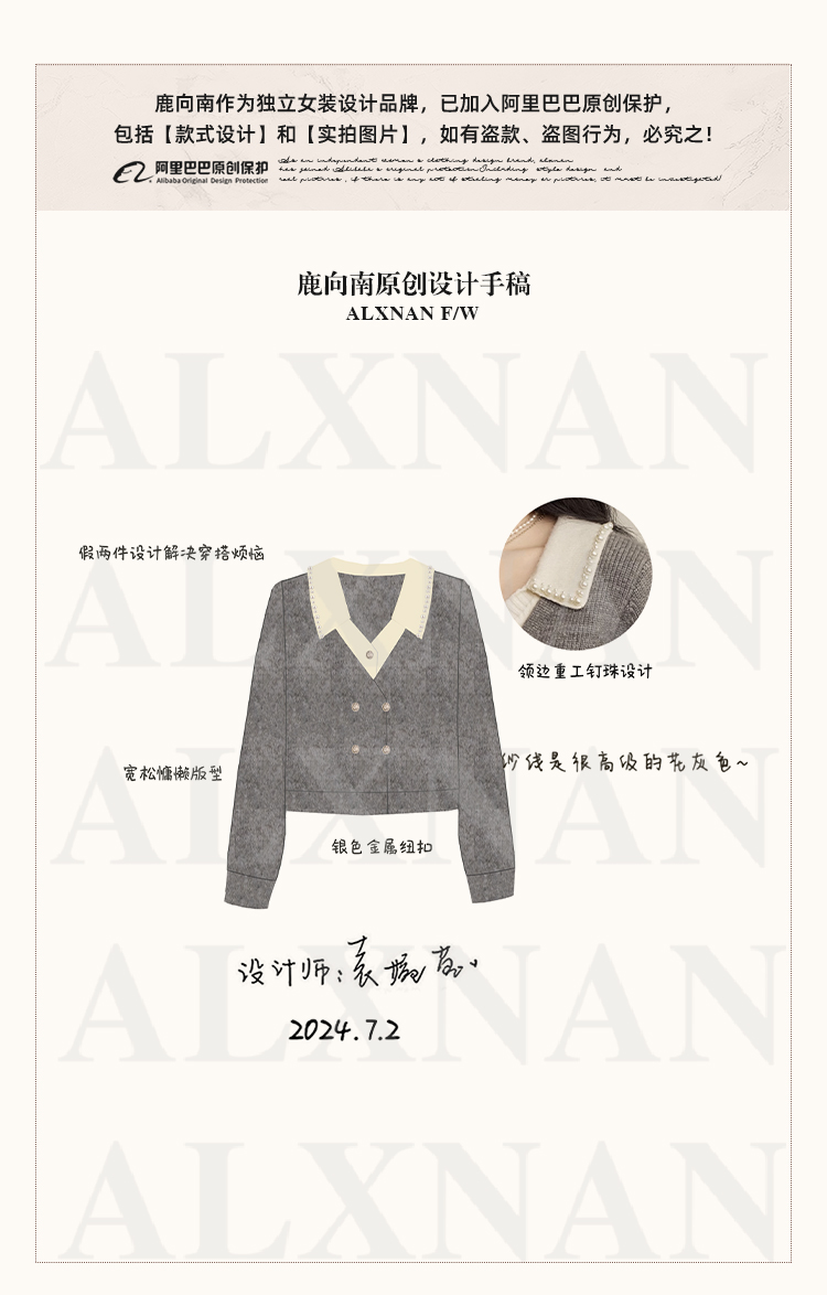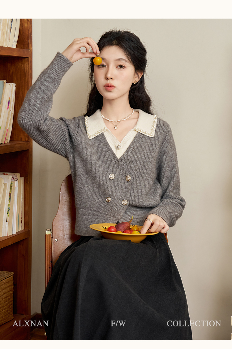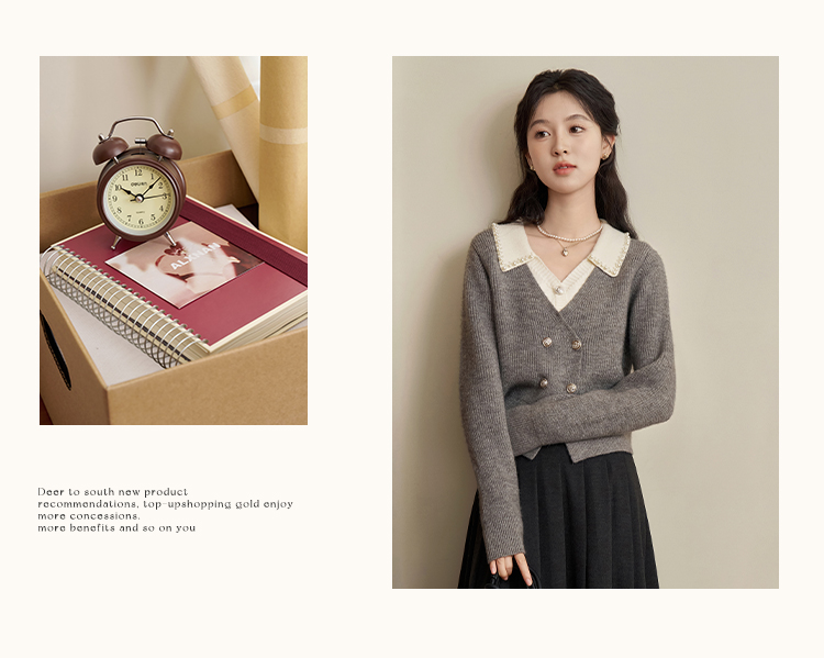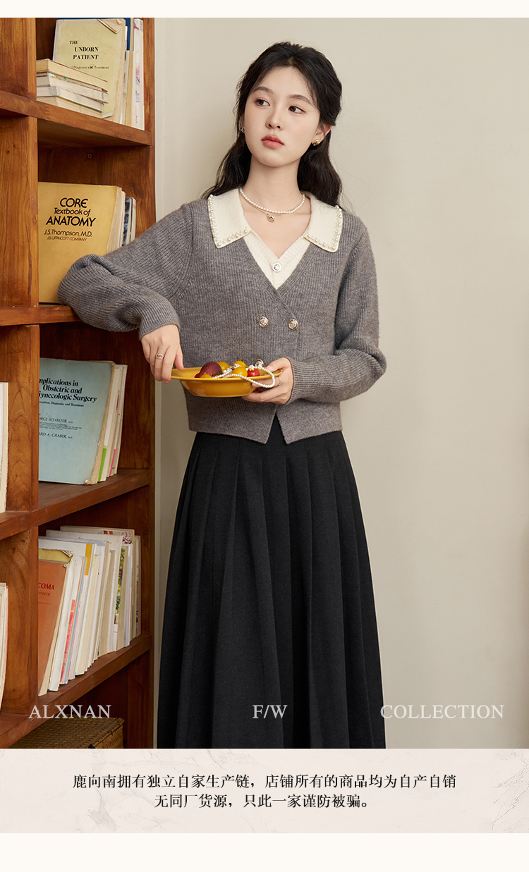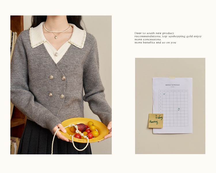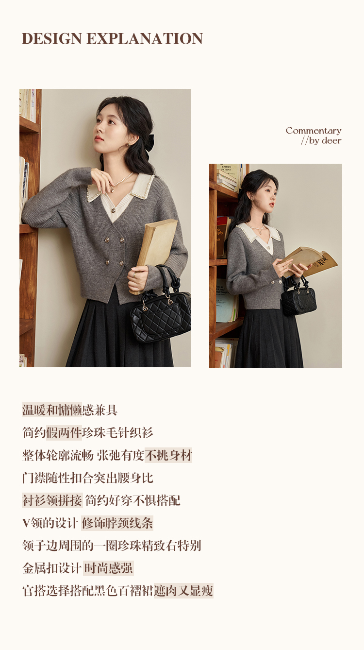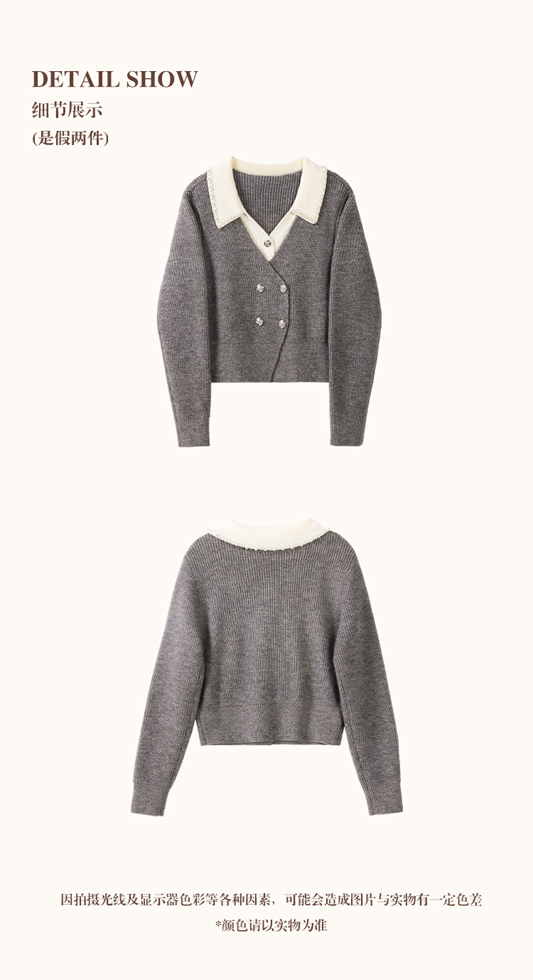 鹿向南「甜系珍妮弗」灰色假两件毛衣女2025秋冬慵懒风针织衫上衣