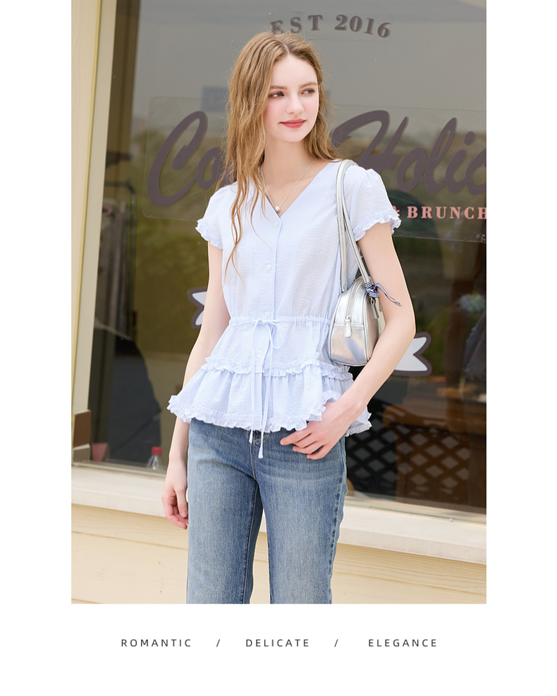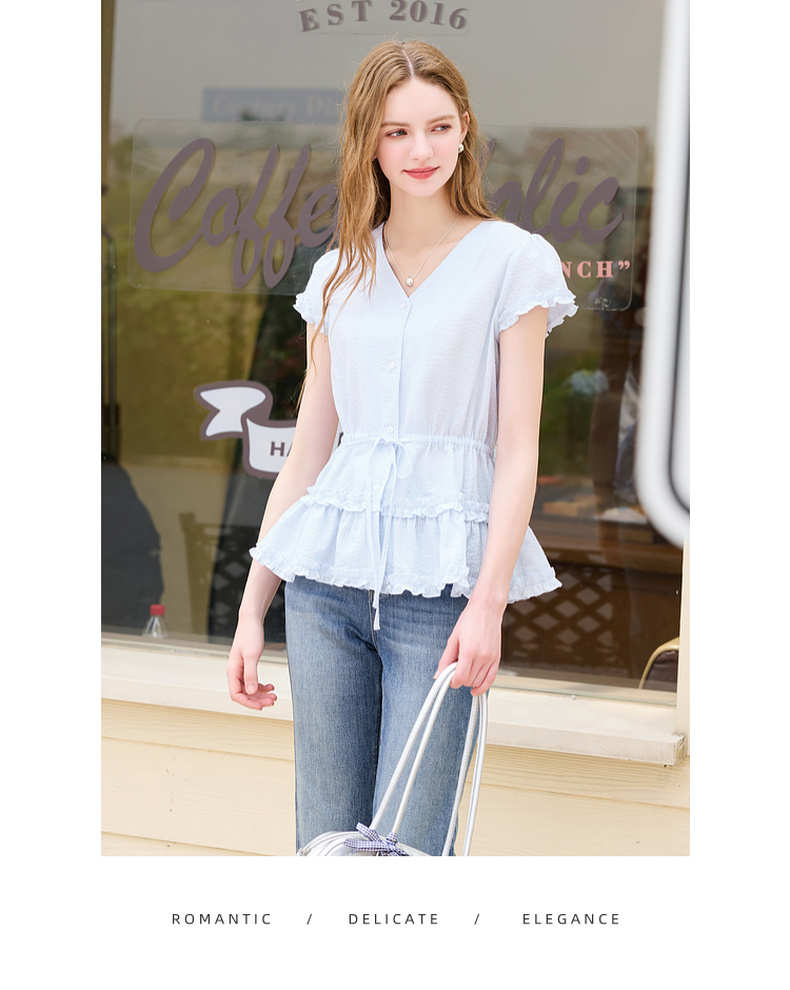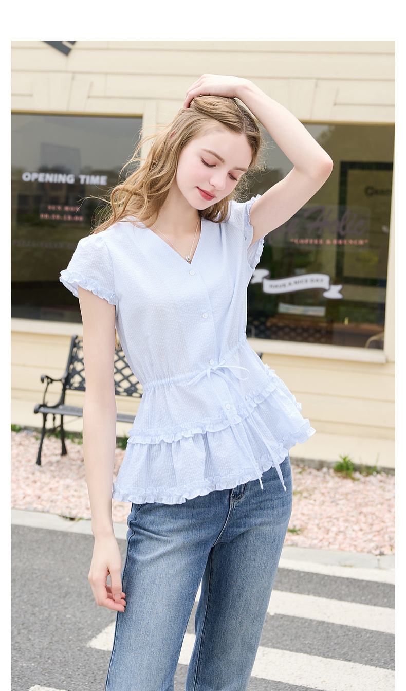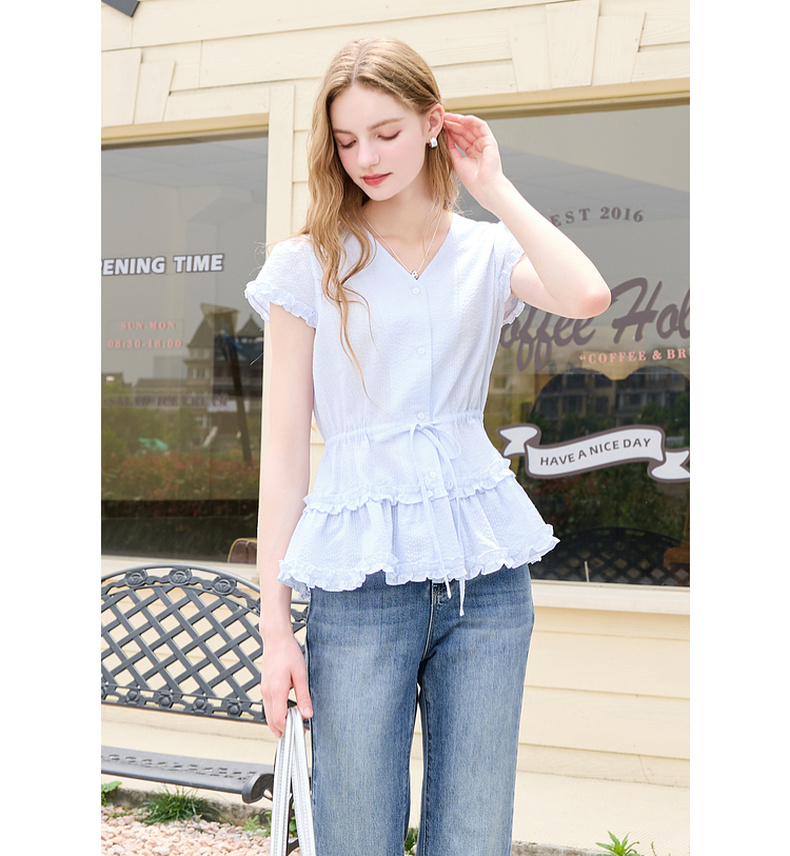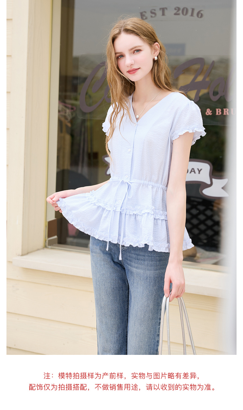 三彩2025夏季新款条纹小衫V领木耳边抽绳上衣开衫清新M