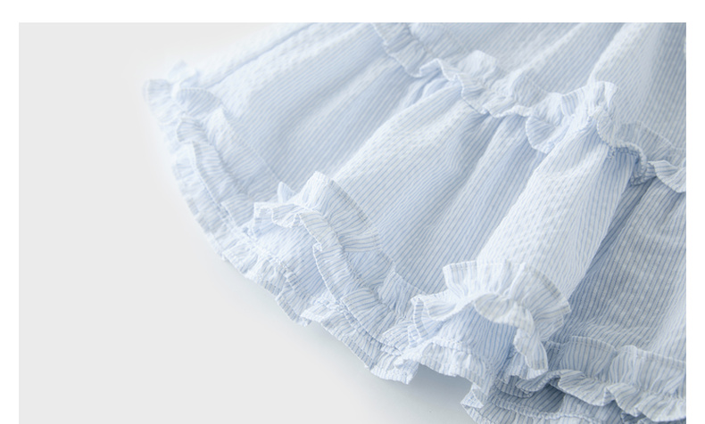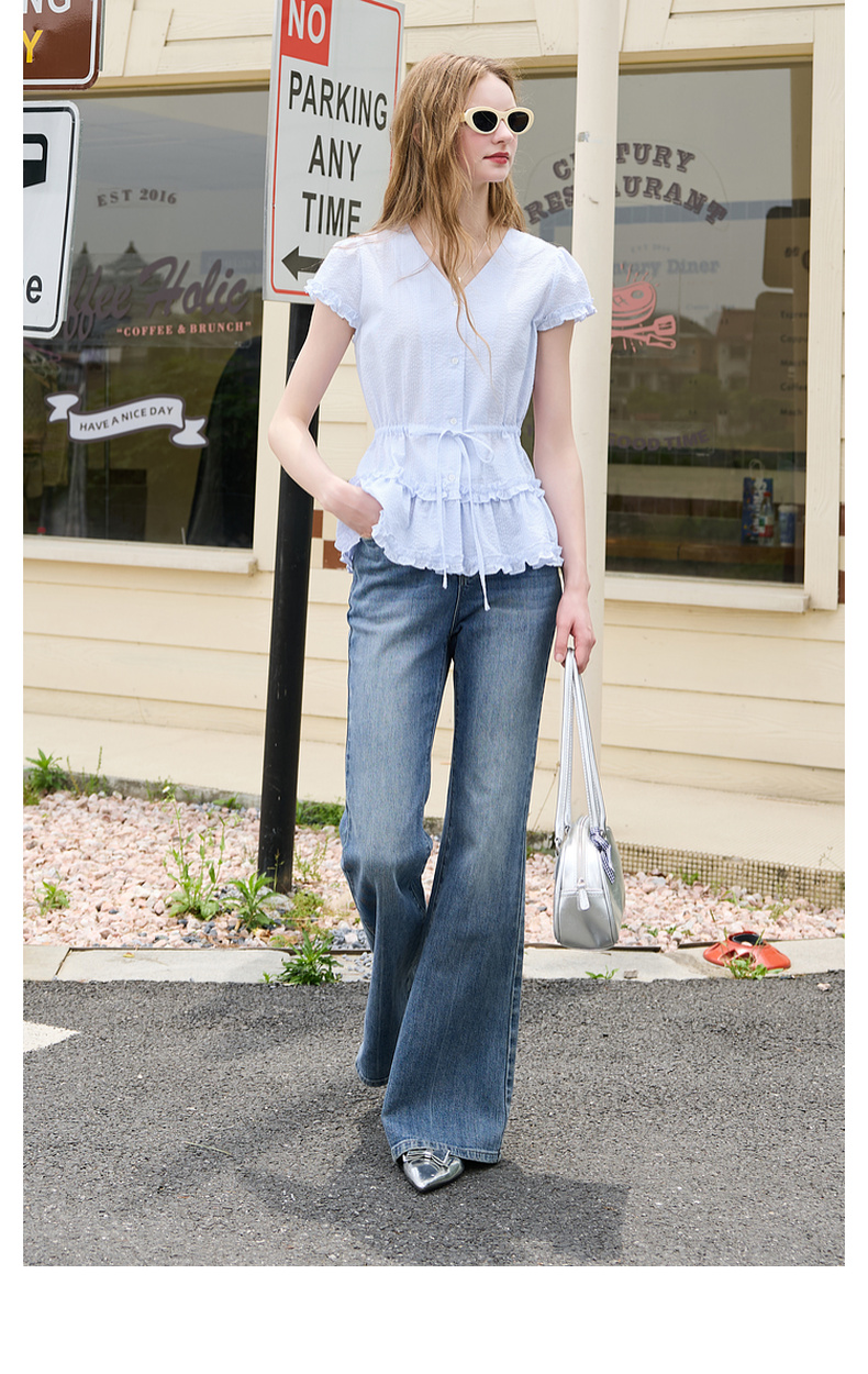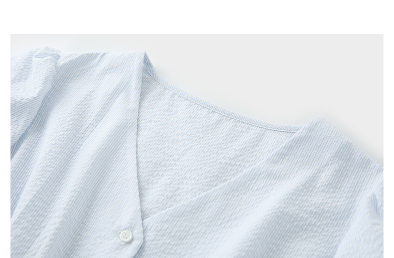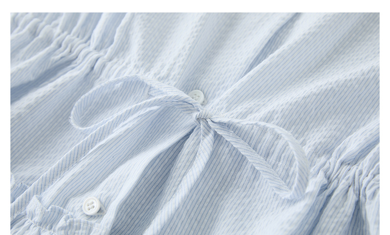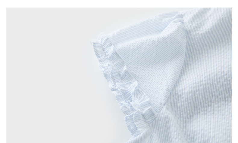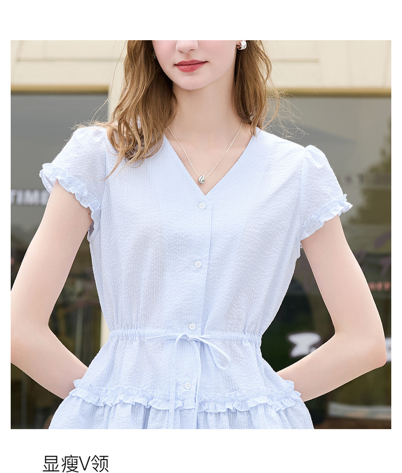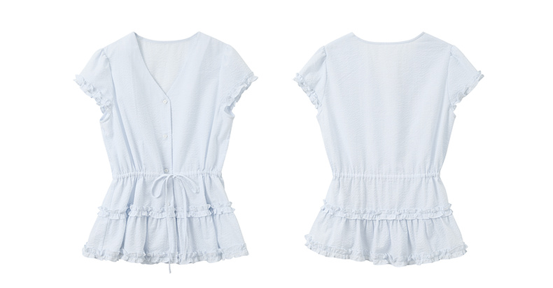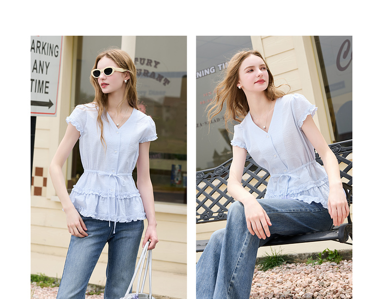 三彩2025夏季新款条纹小衫V领木耳边抽绳上衣开衫清新M