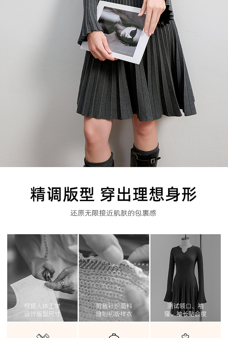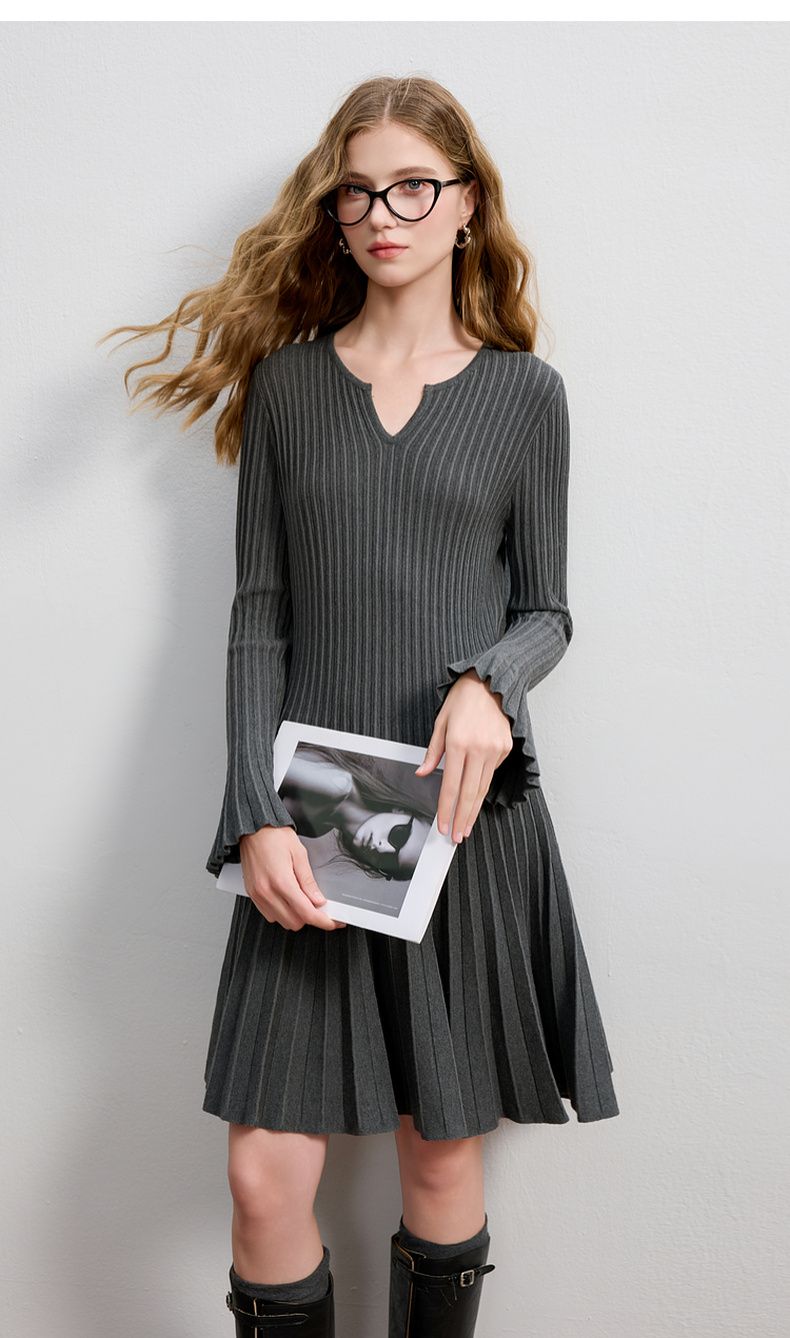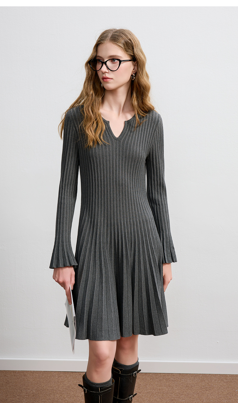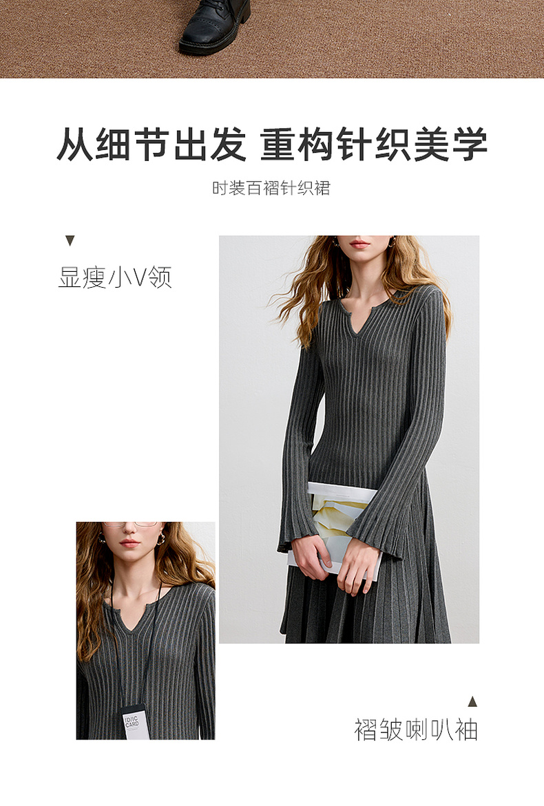 三彩2025冬季新款针织连衣裙V领长袖百褶裙短裙A字裙气质M