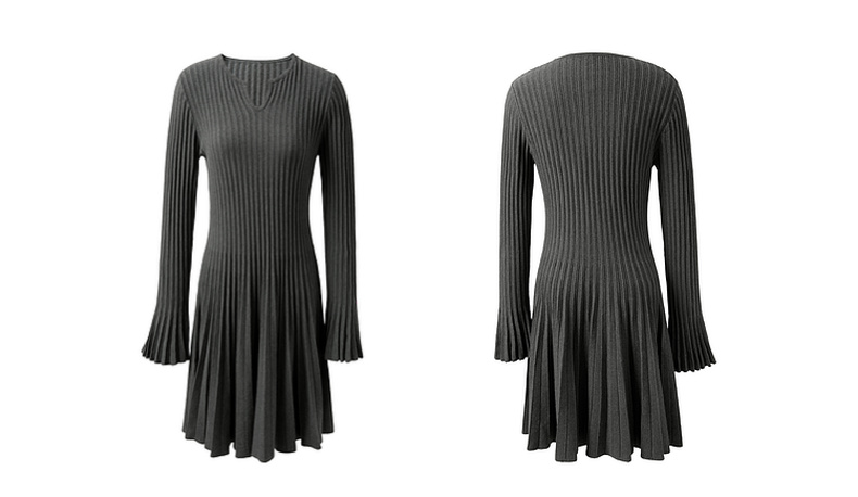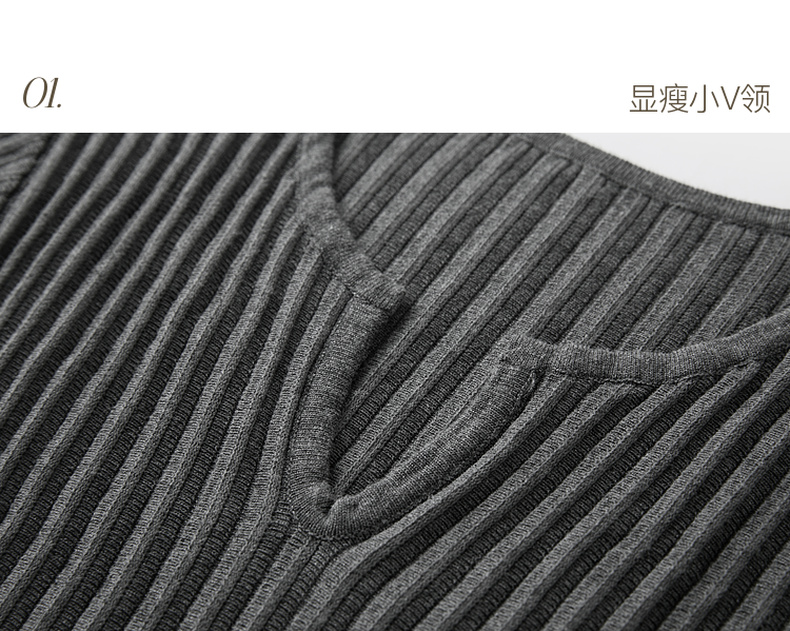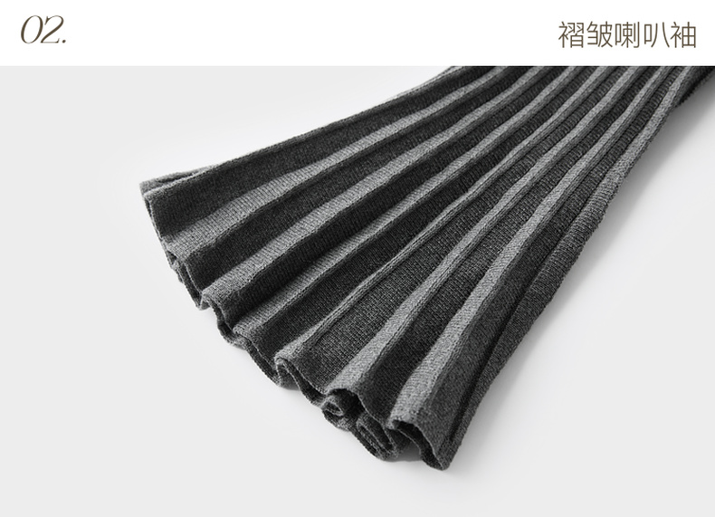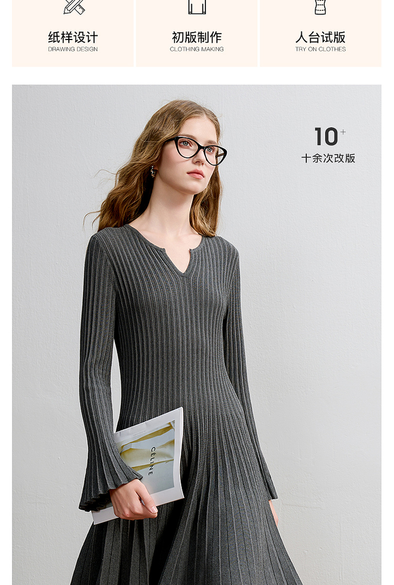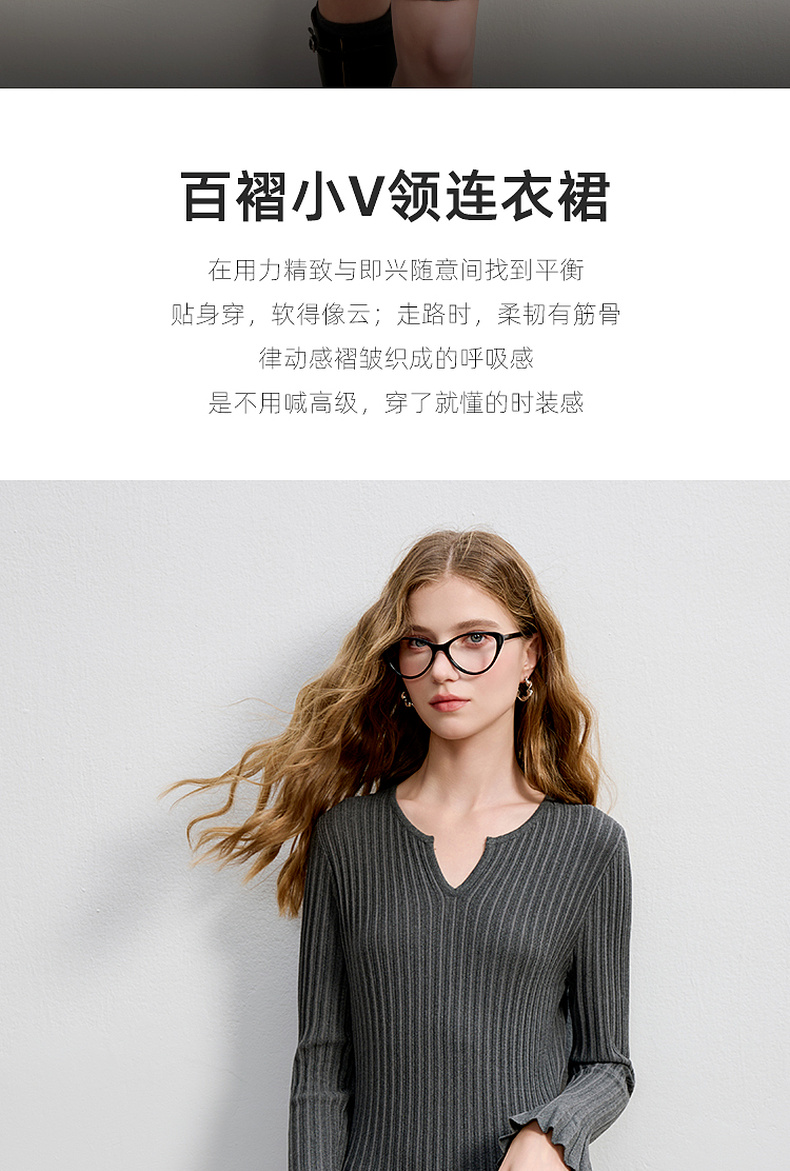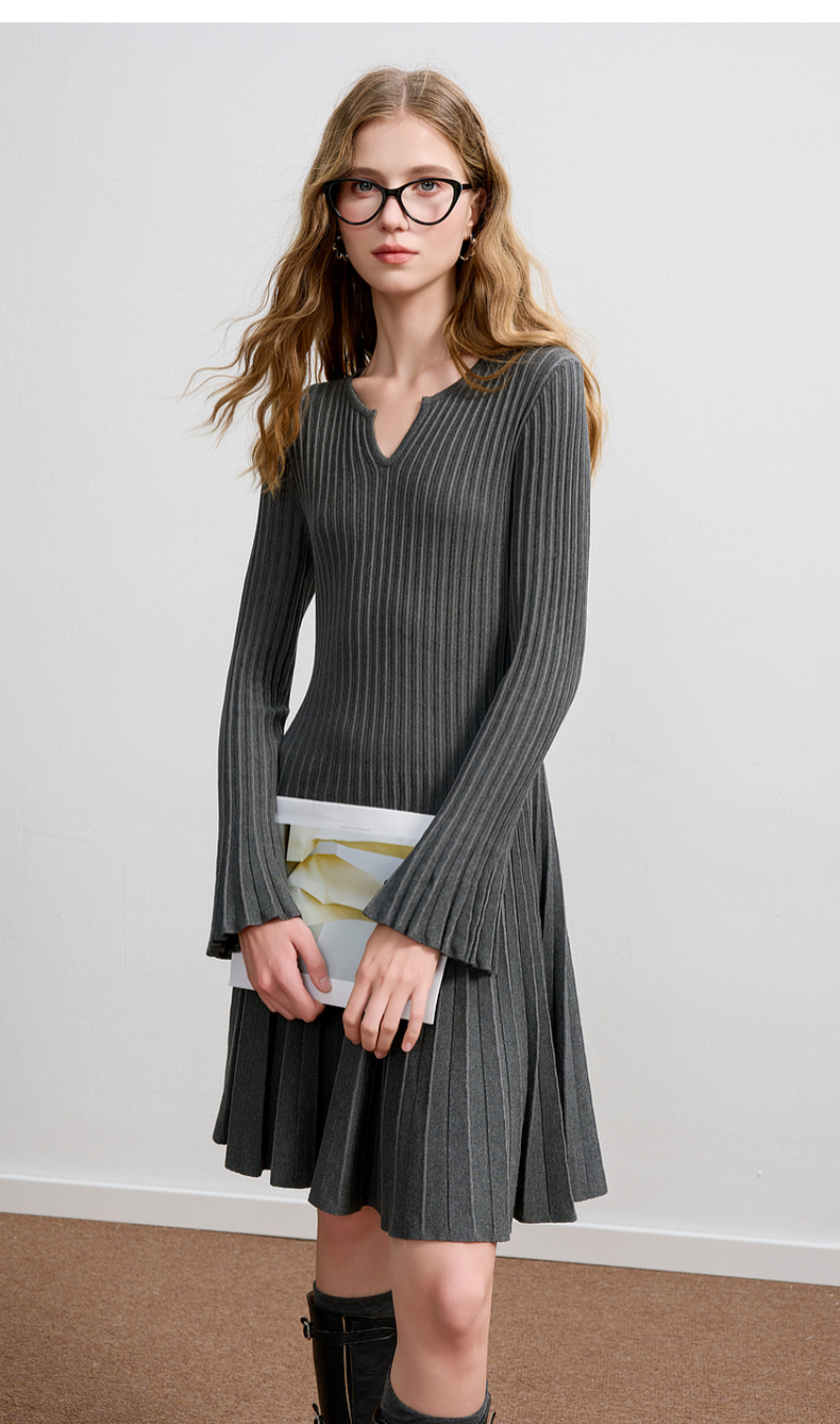 三彩2025冬季新款针织连衣裙V领长袖百褶裙短裙A字裙气质M