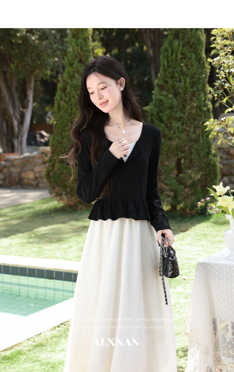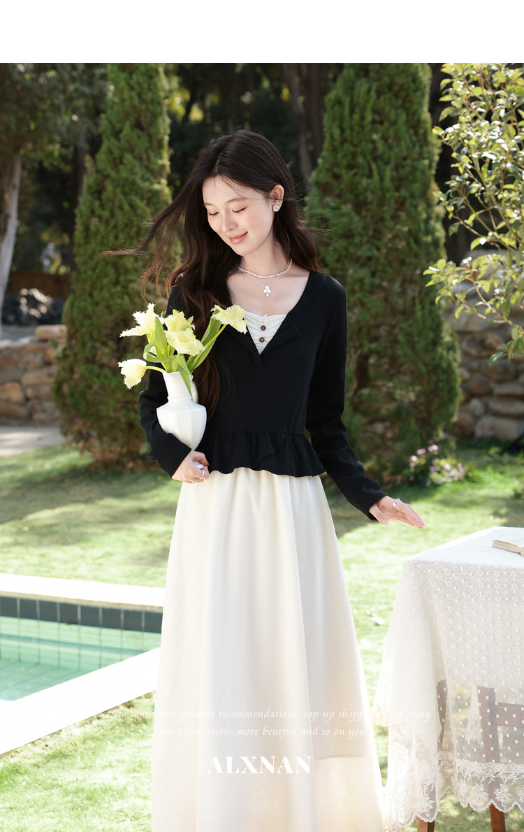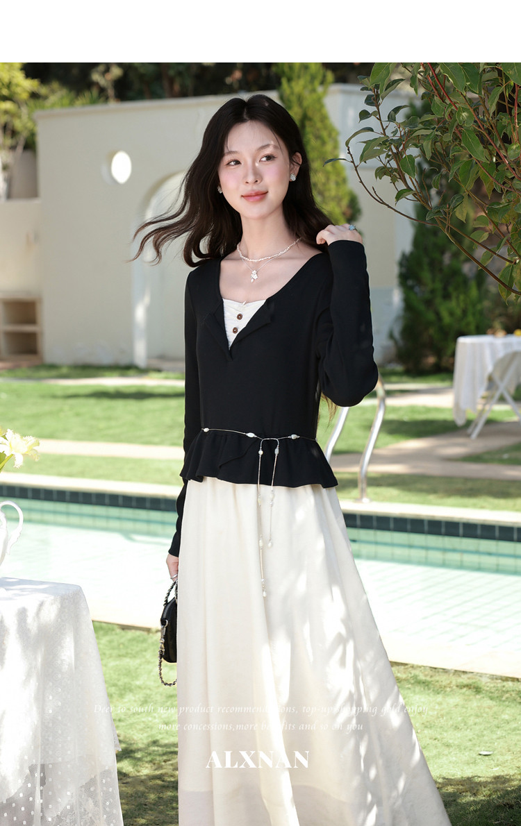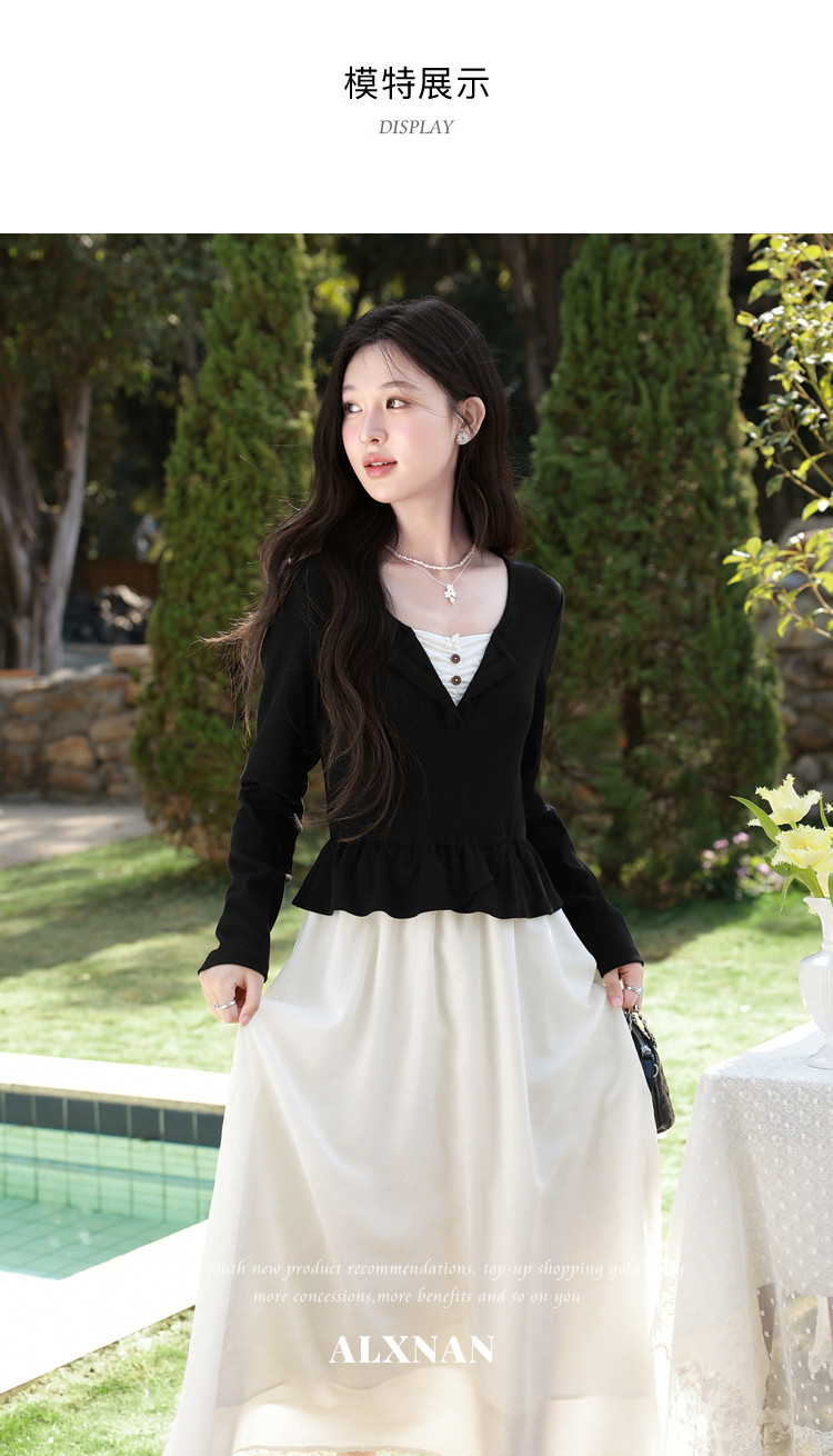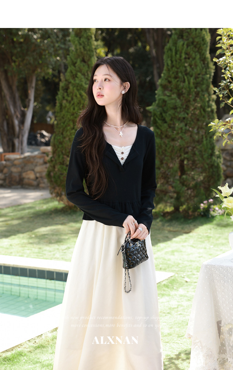 鹿向南「南栀清禾」假两件黑色收腰连衣裙女春季新款显瘦A字长裙