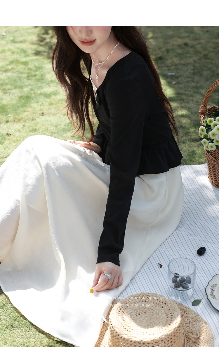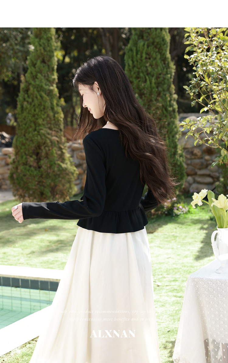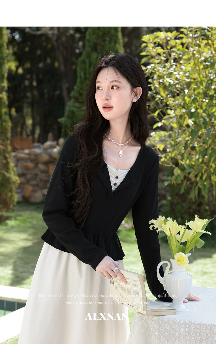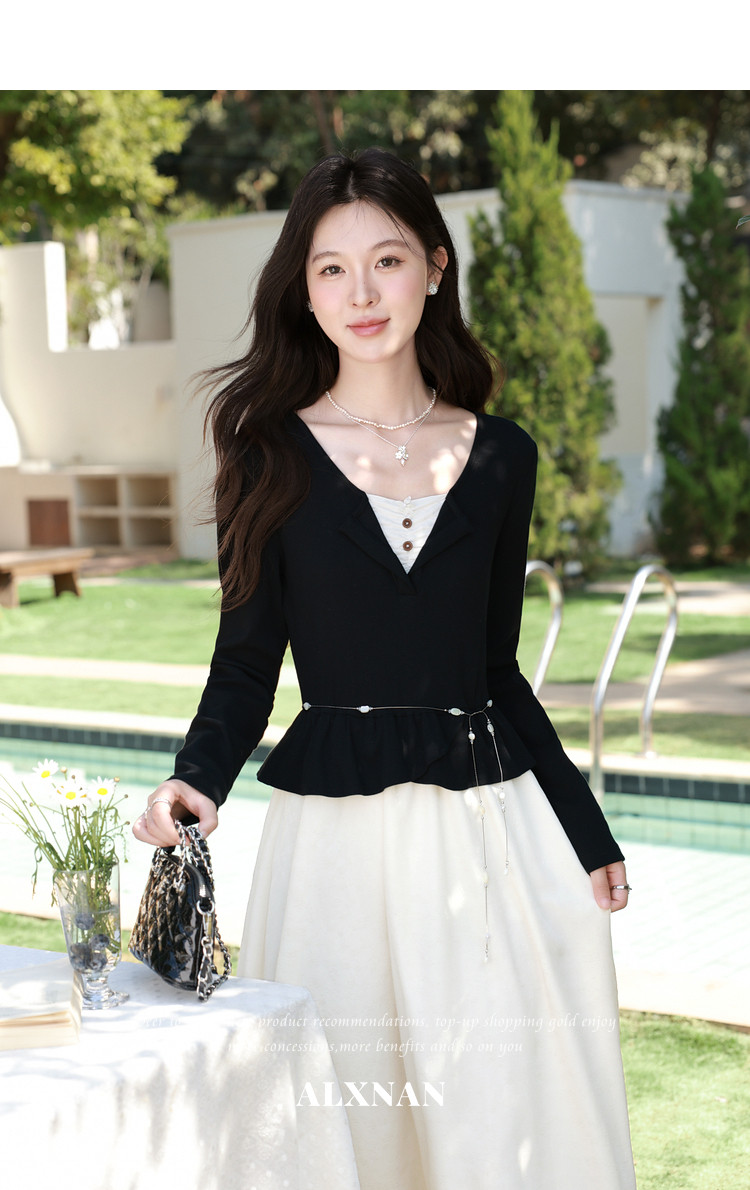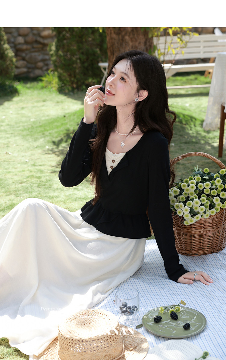 鹿向南「南栀清禾」假两件黑色收腰连衣裙女春季新款显瘦A字长裙