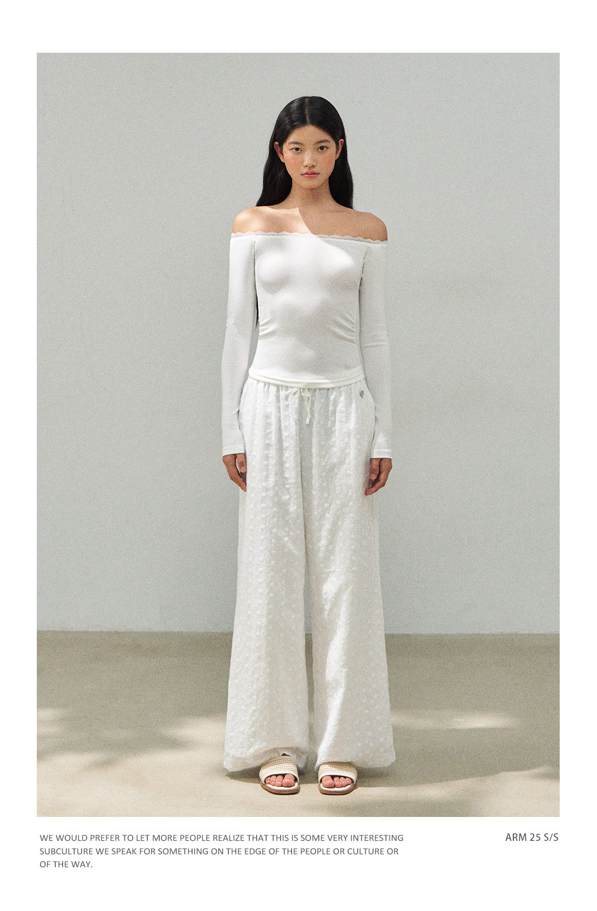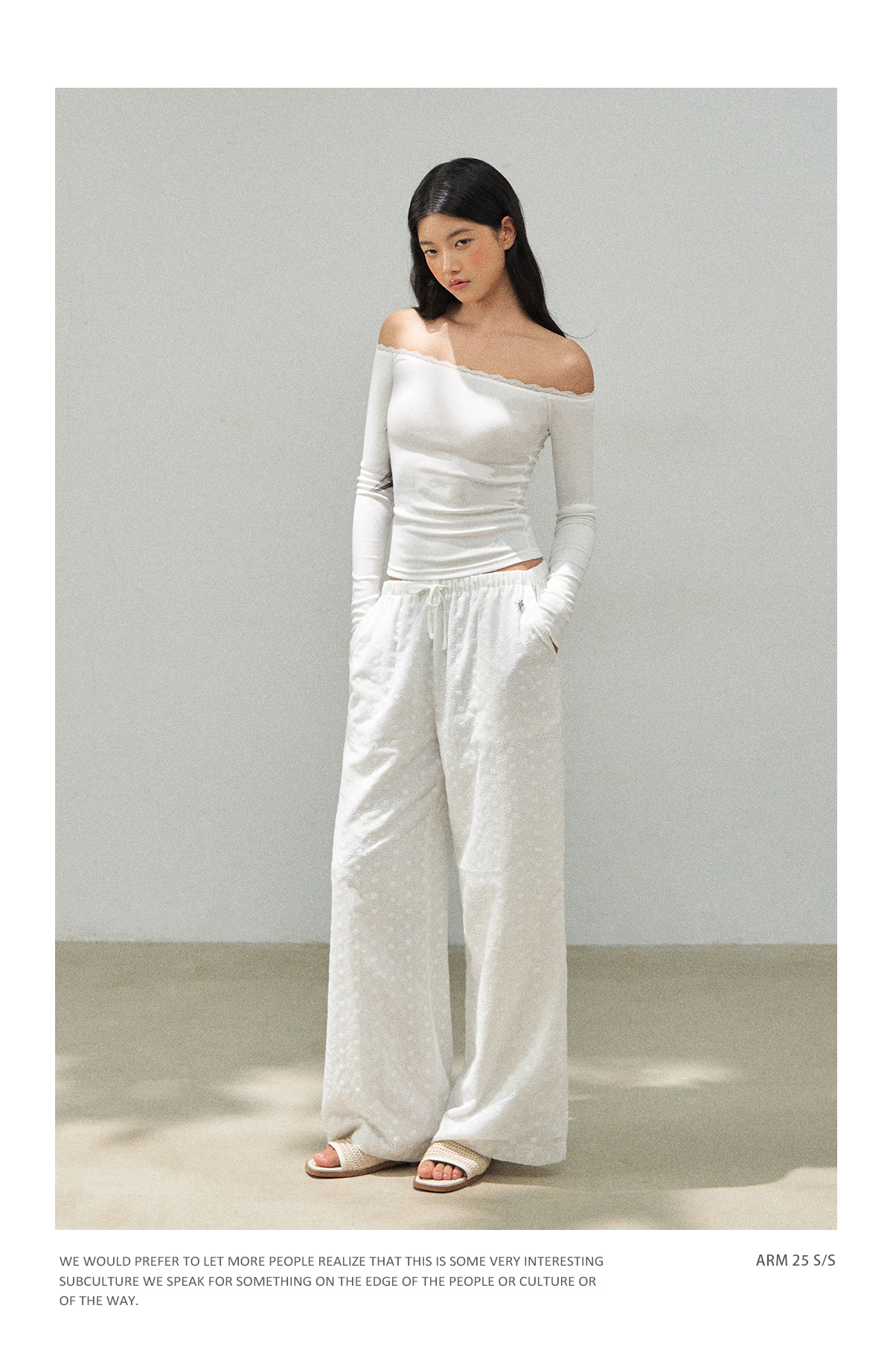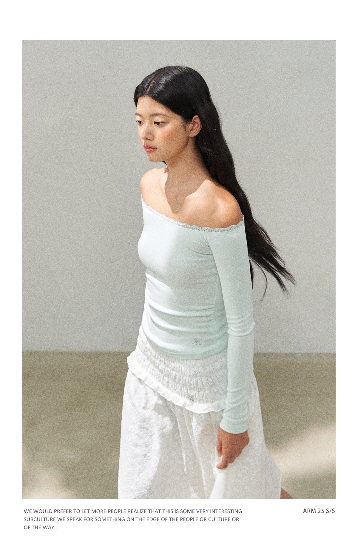 Ariseism 美式复古3色一字肩蕾丝边长袖t恤女秋季新款修身上衣