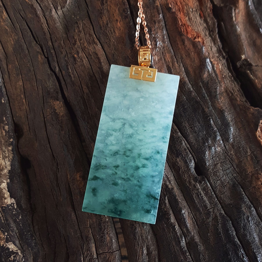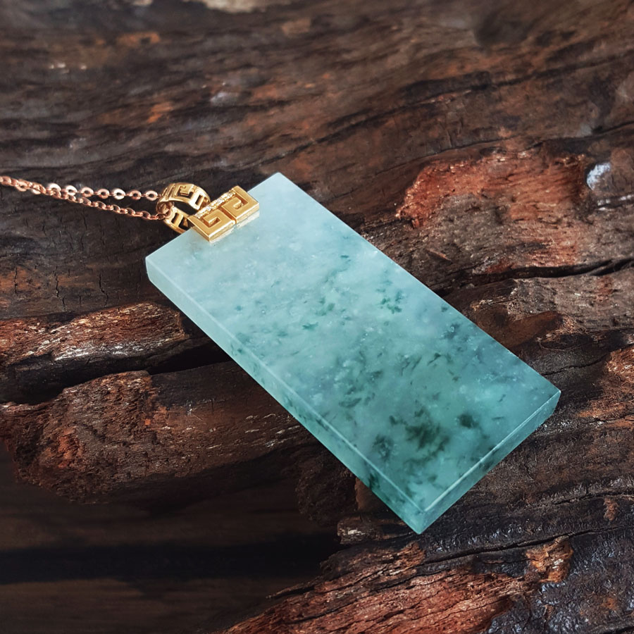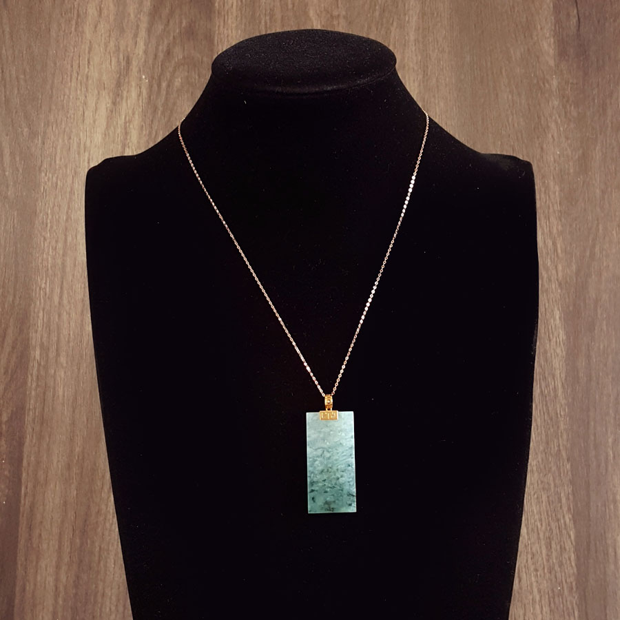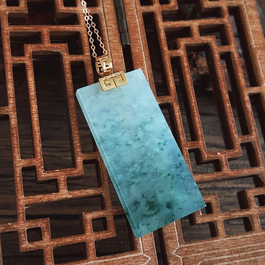 名称 | AU750黄金镶天然细腻冰种平安无事牌飘蓝花翡翠吊坠项链 |