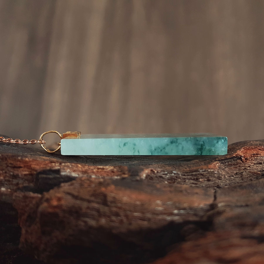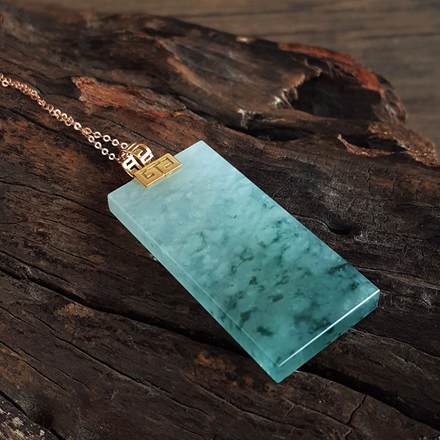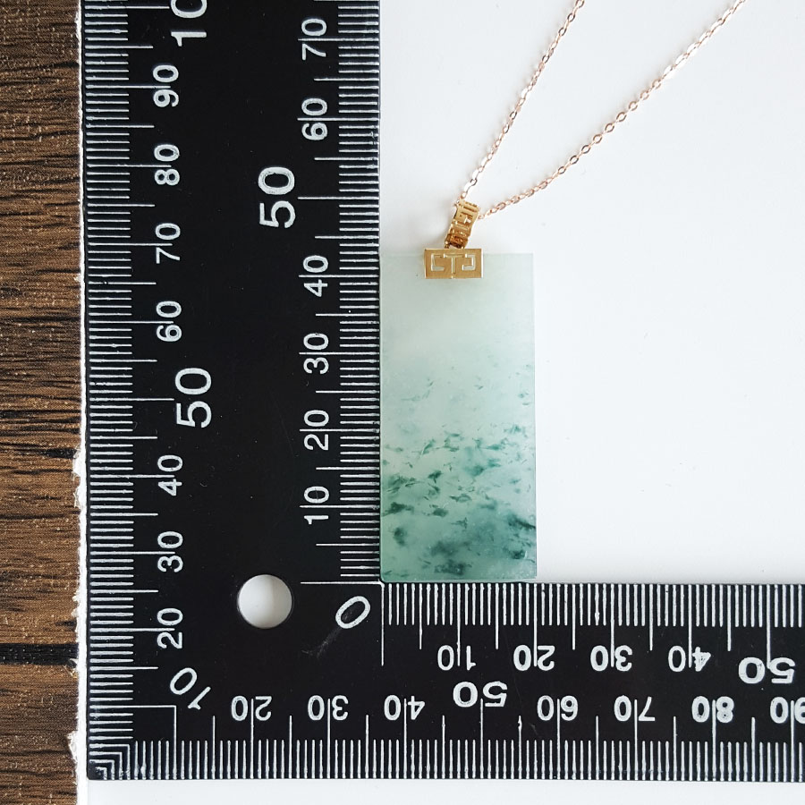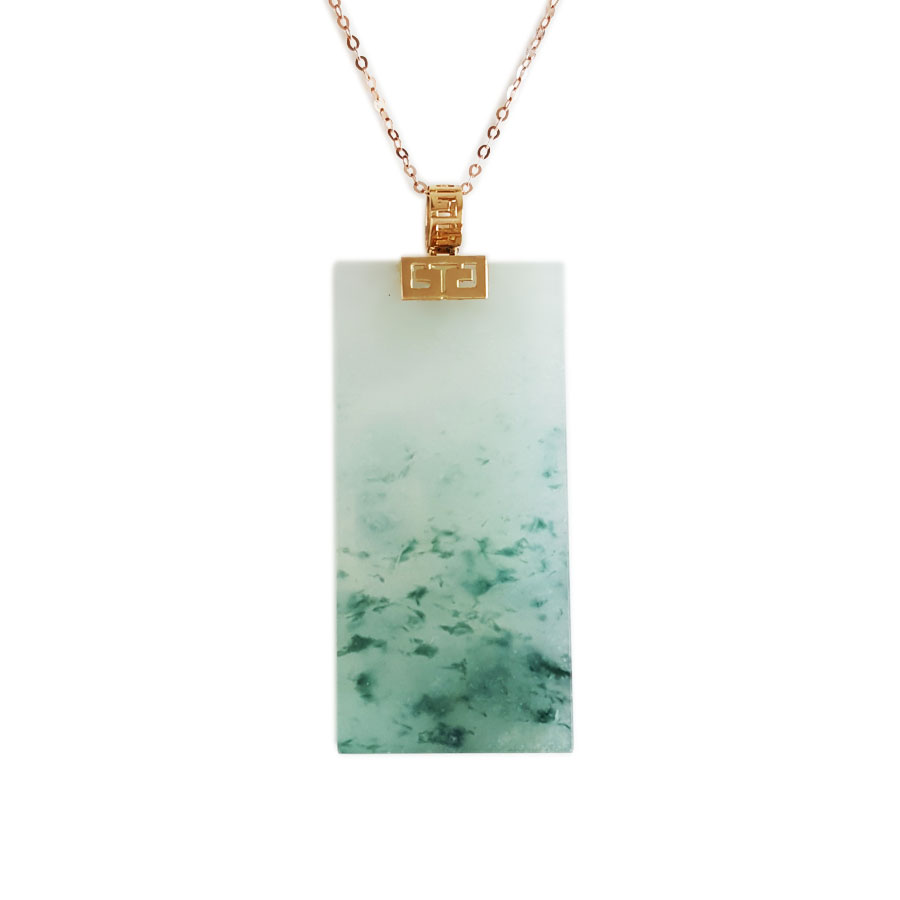 名称 | AU750黄金镶天然细腻冰种平安无事牌飘蓝花翡翠吊坠项链 |