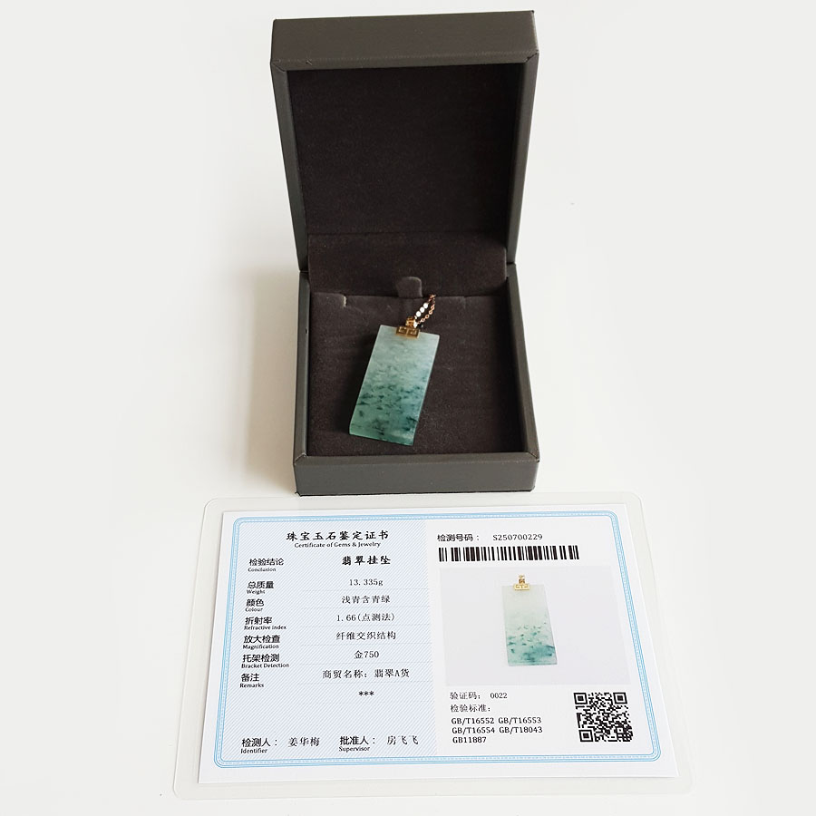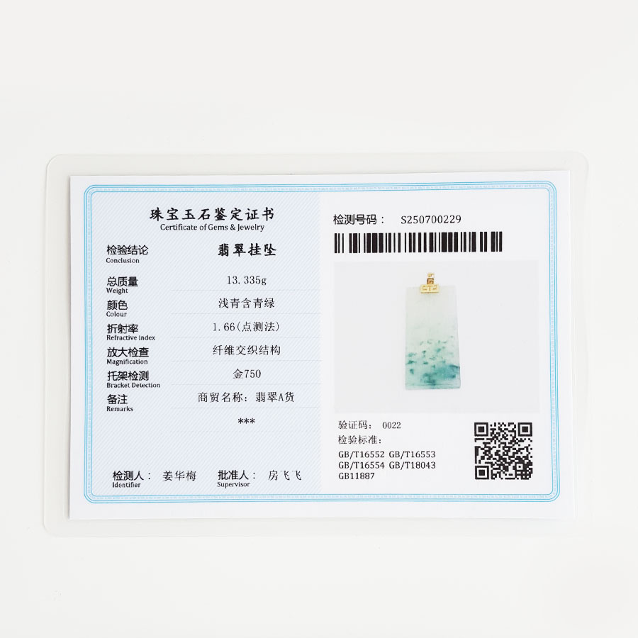 【天然正品】A货翡翠AU750黄金镶天然细腻冰种平安无事牌飘蓝花翡翠吊坠项链49.4*20.1*4.6MM(皆取最大值)女士现售价:4980!010725AH55